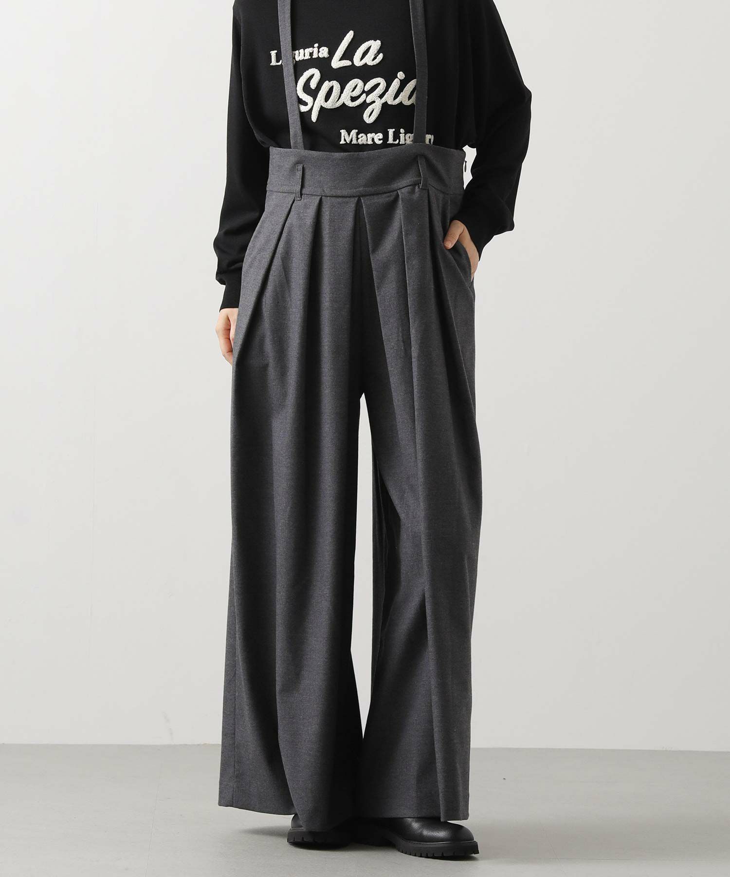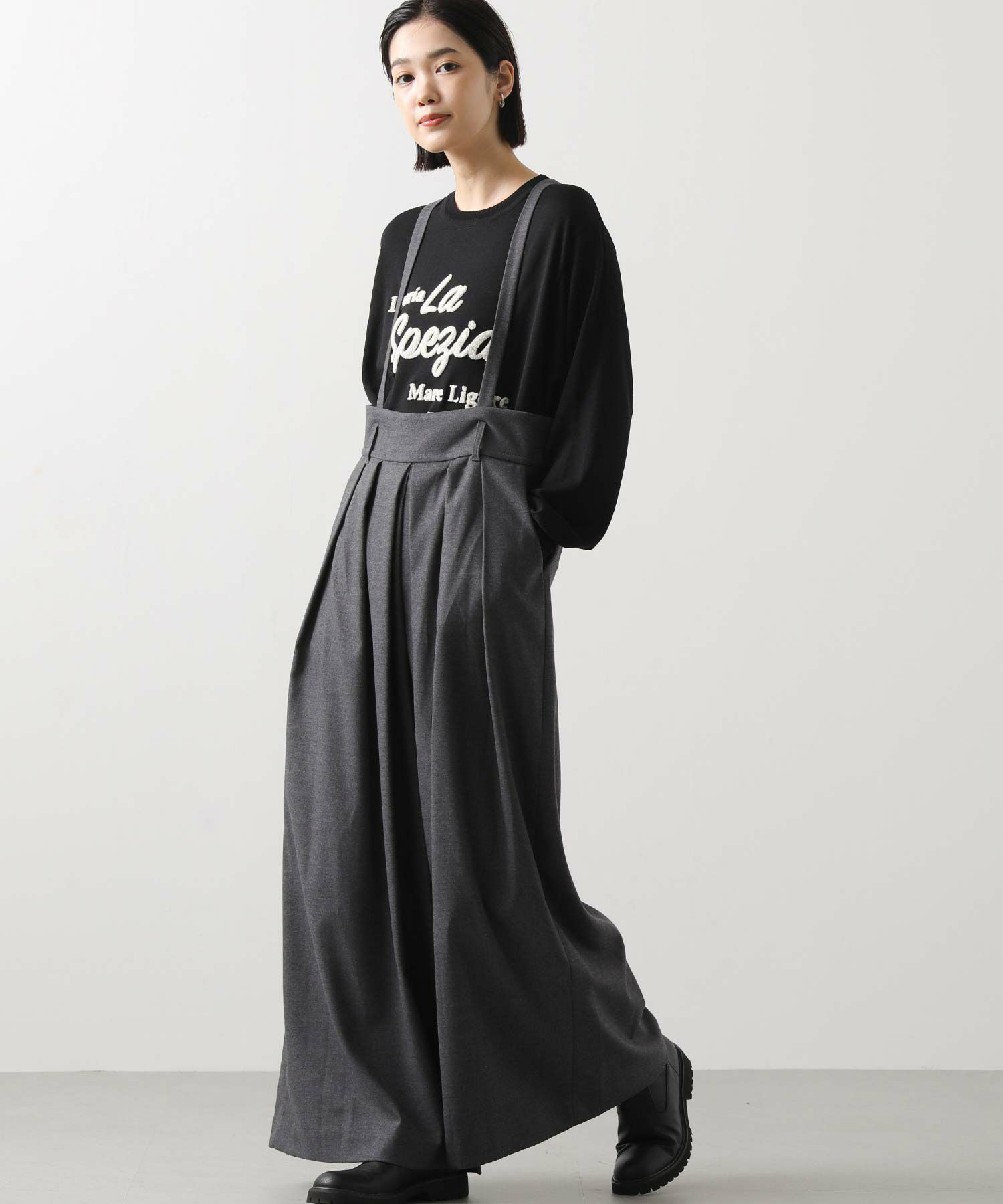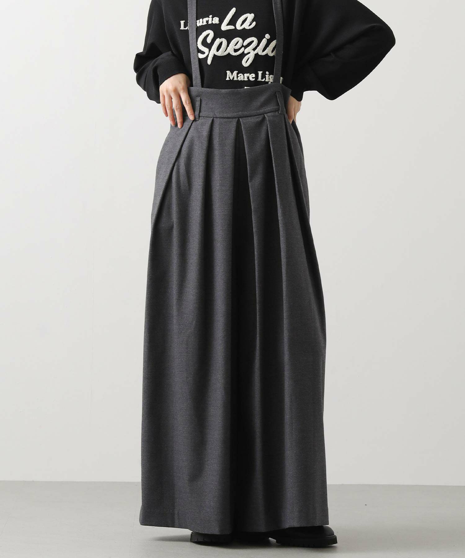 【MARECHALTERRE(マルシャルテル】から、贅沢に広がるシルエットのタック入り超ワイドサロペットパンツをセレクト。