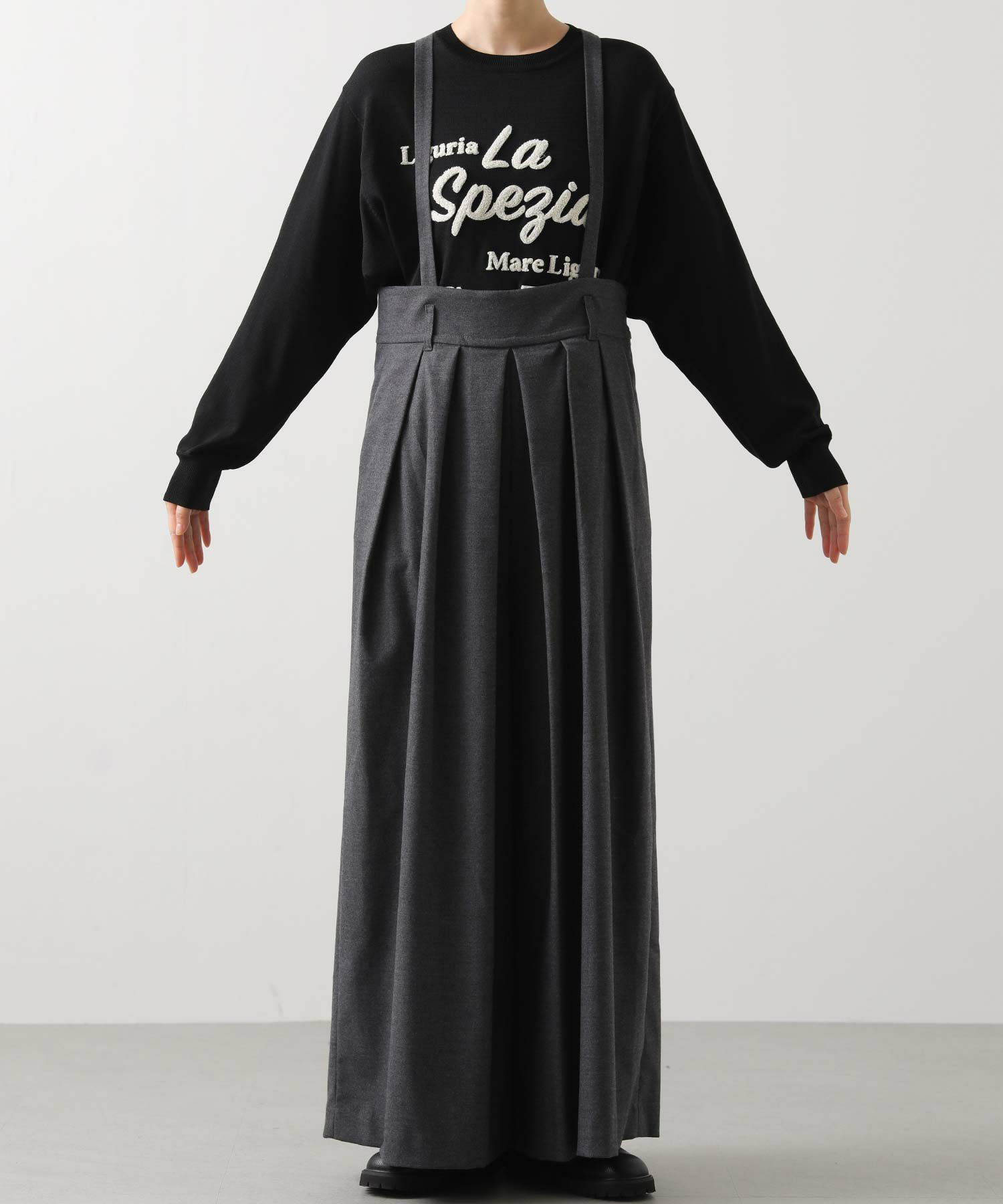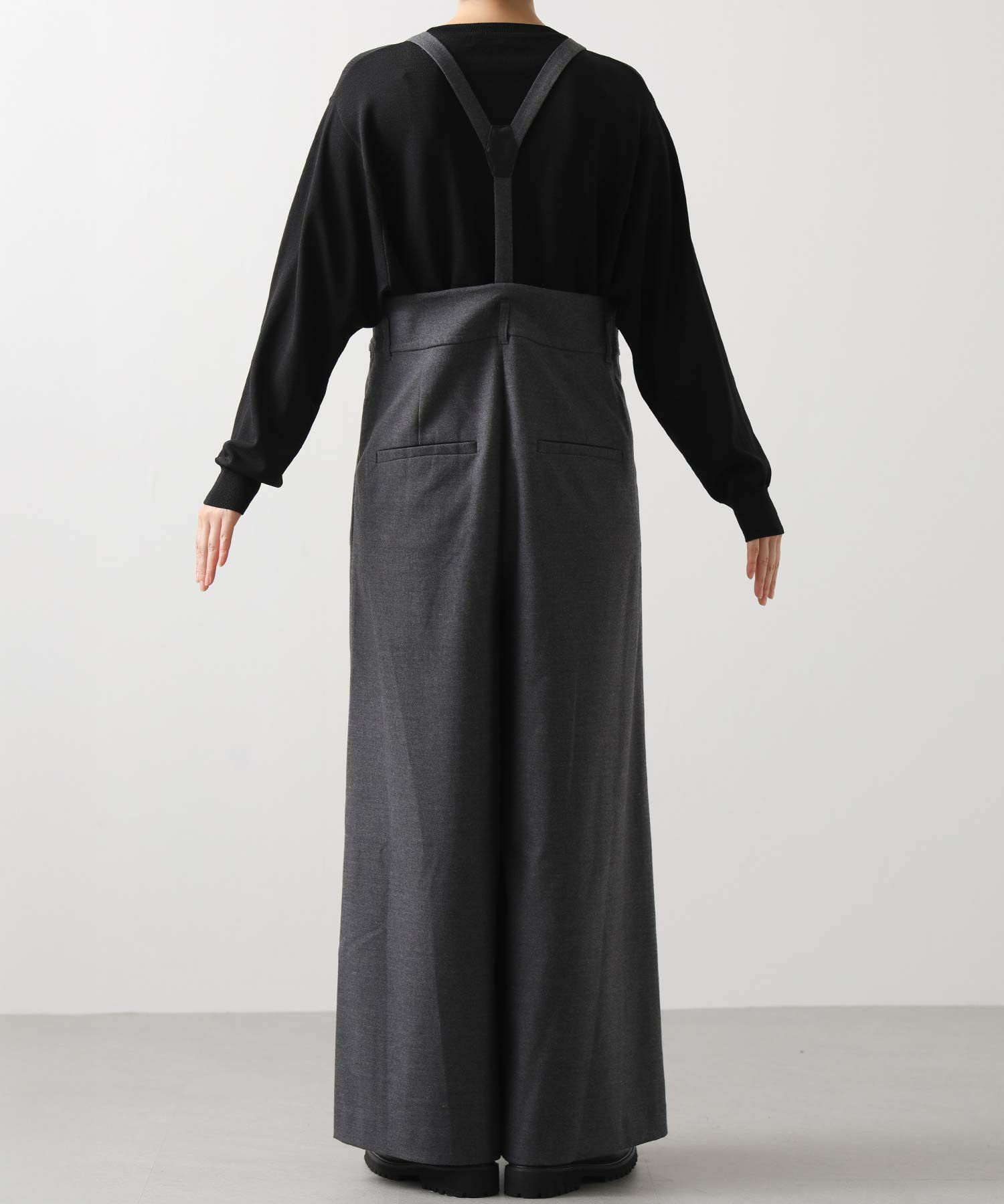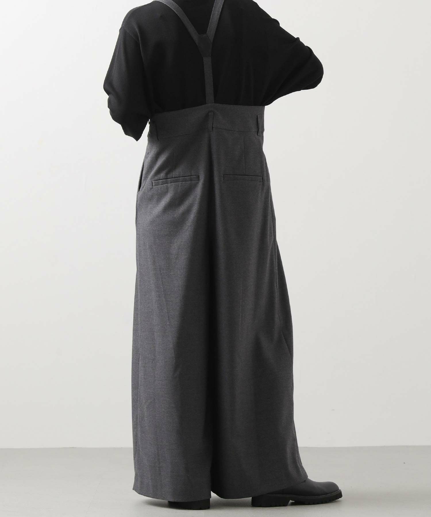 【MARECHALTERRE(マルシャルテル】から、贅沢に広がるシルエットのタック入り超ワイドサロペットパンツをセレクト。