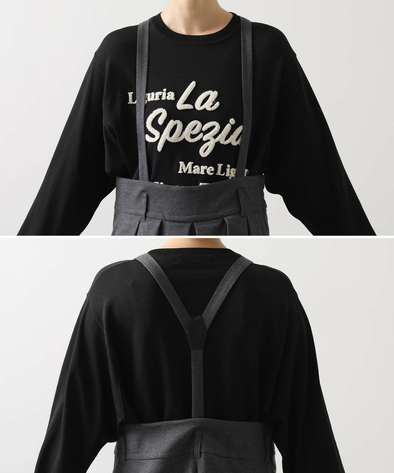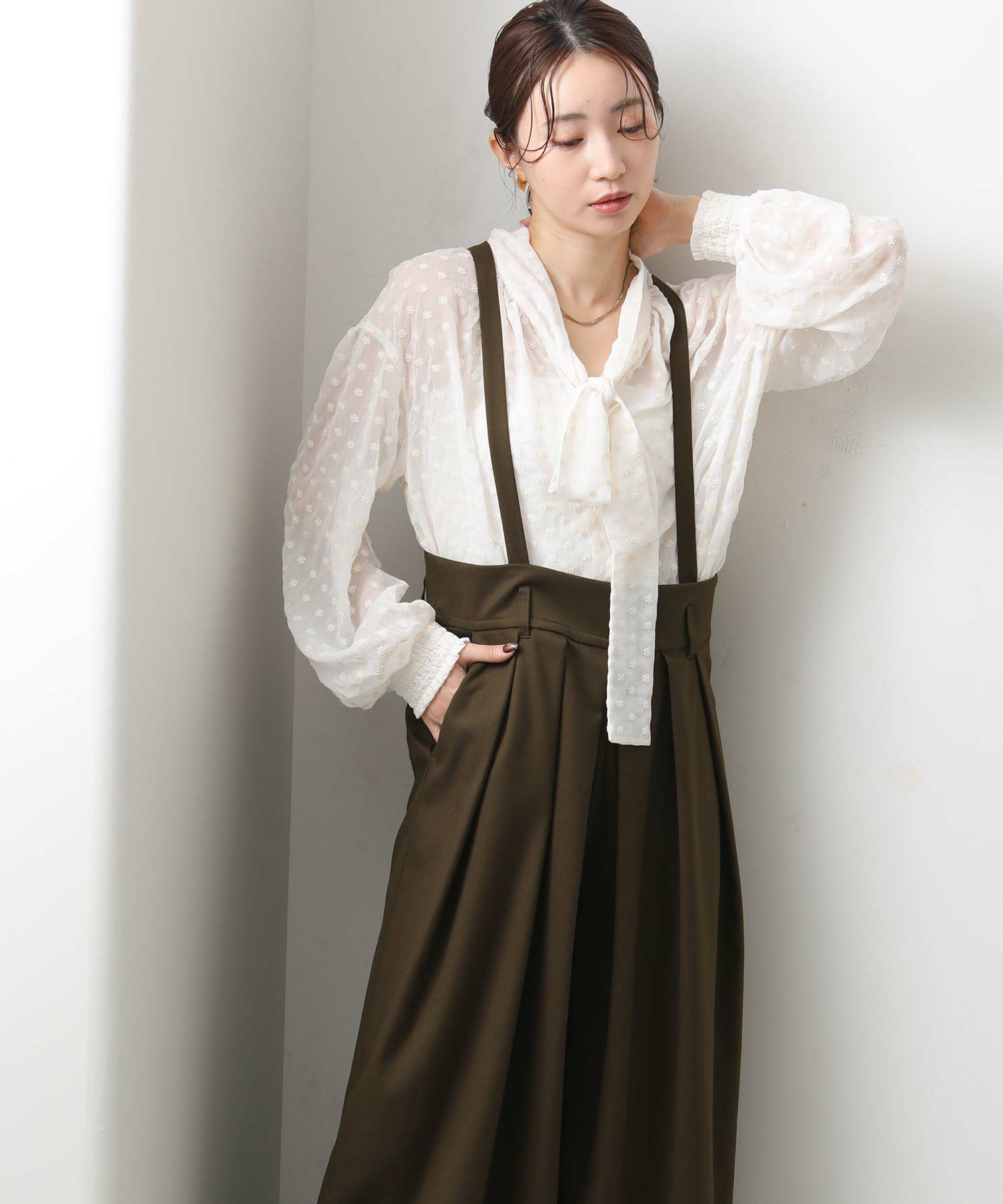 ウエストは大きめでベルト仕様になっており、フロントのたっぷり入ったタックがハの字に広がり、共布の肩ひもベルトで吊って着用するアイテムです。