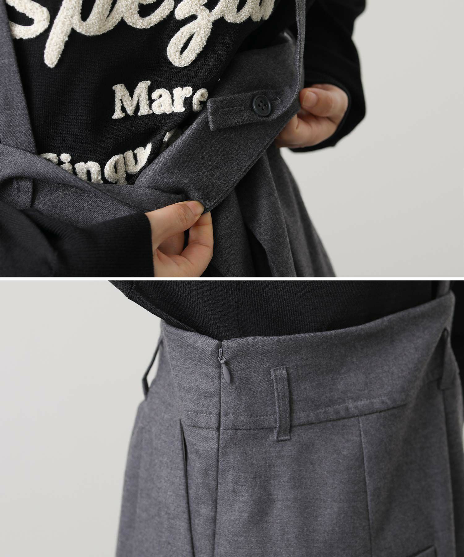 サスペンダーは、ボタンで取外し・長さ調節可能。