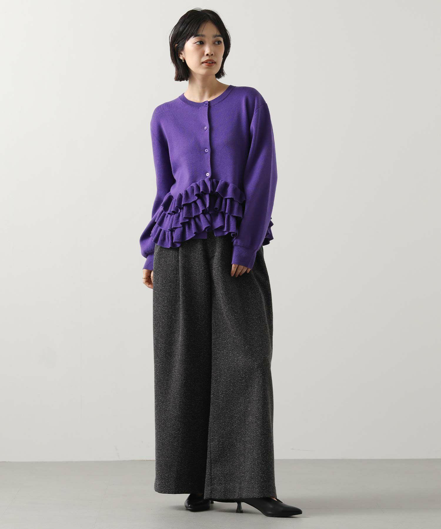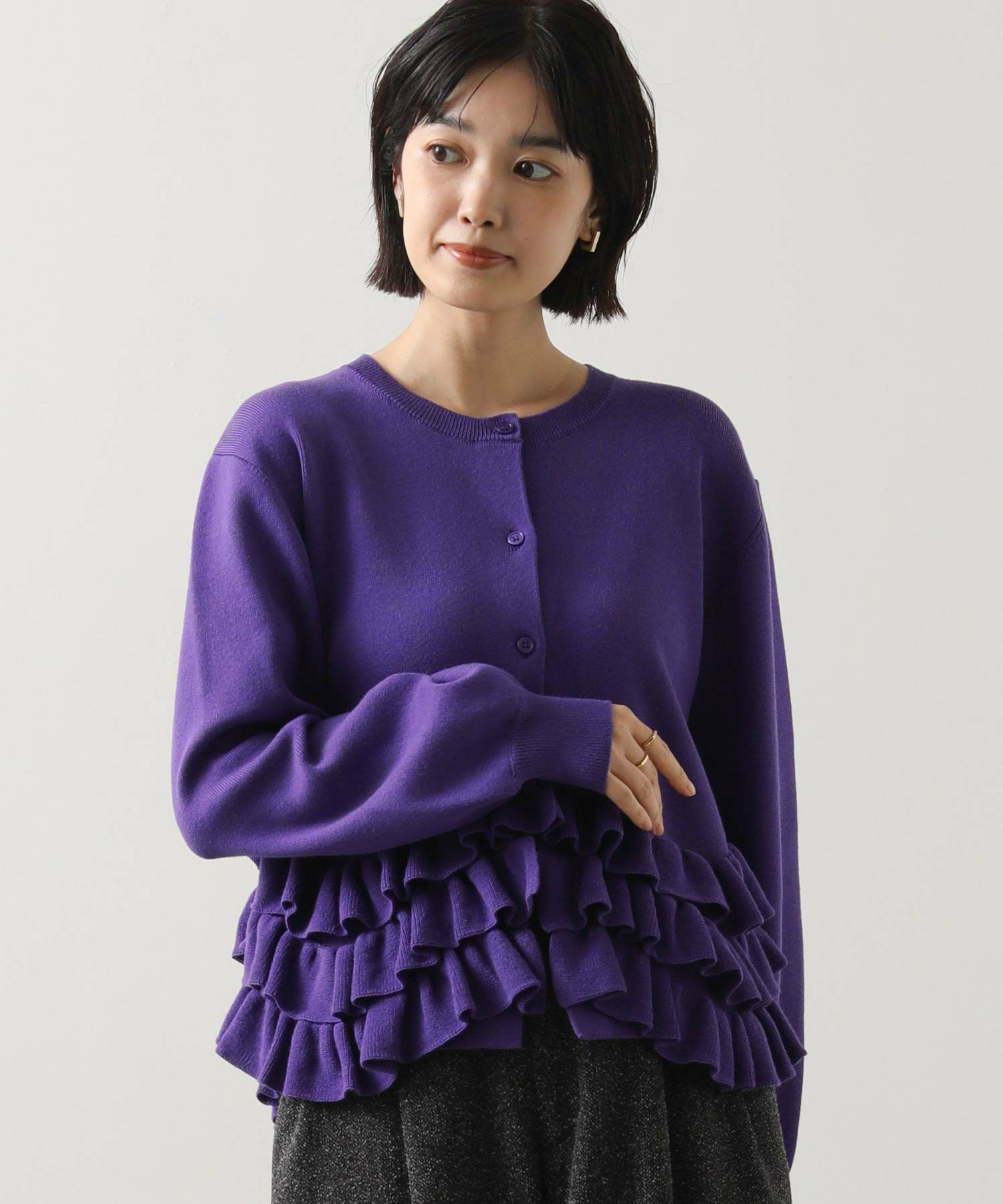 【RAWFUDGE(ローファッジ)】から、モードに着こなすヘムフリルニットカーデをセレクト。