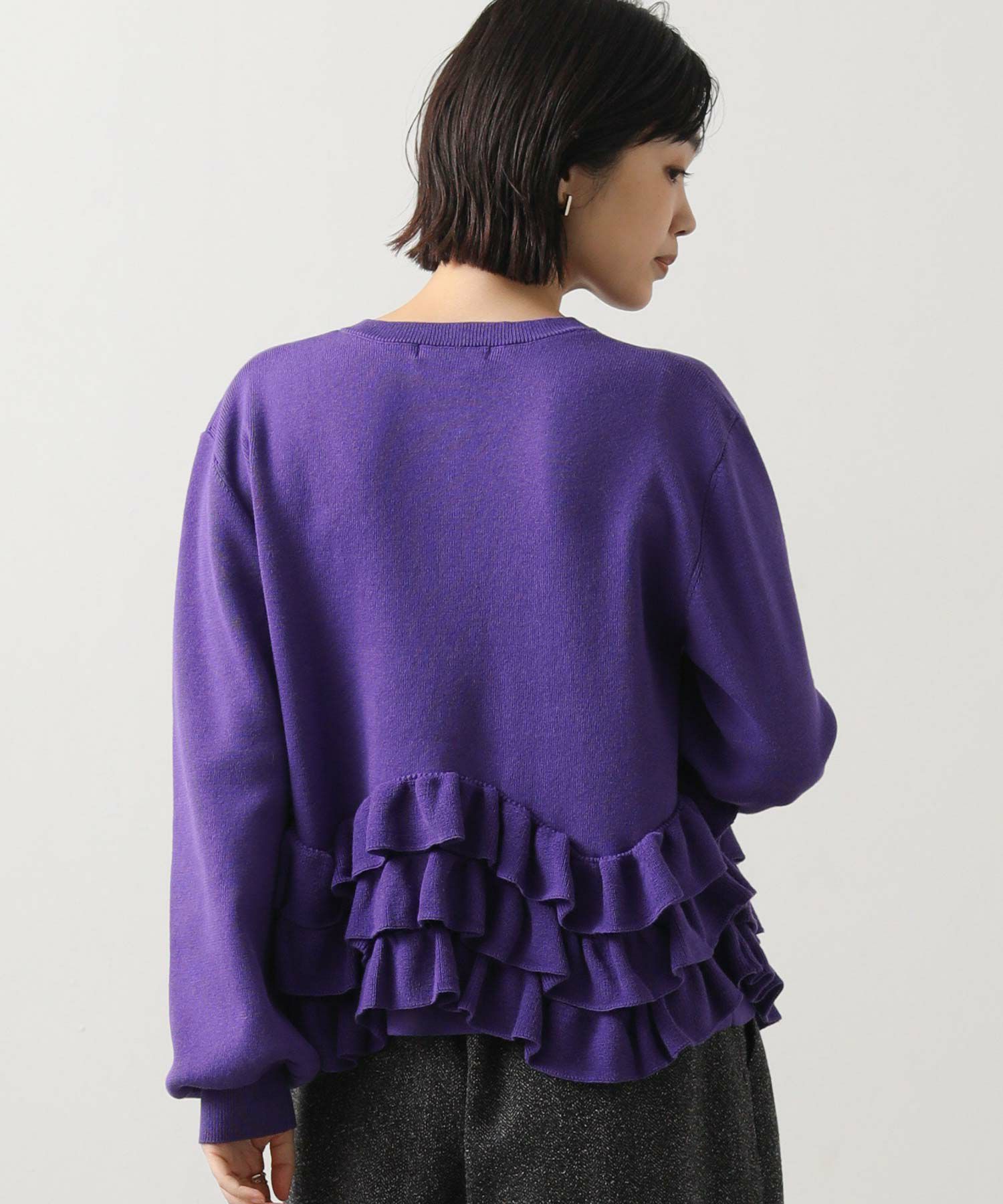 ニットの編みで作るフリルをティアードにして付けることによって、新しいフリルの見え方を表現。