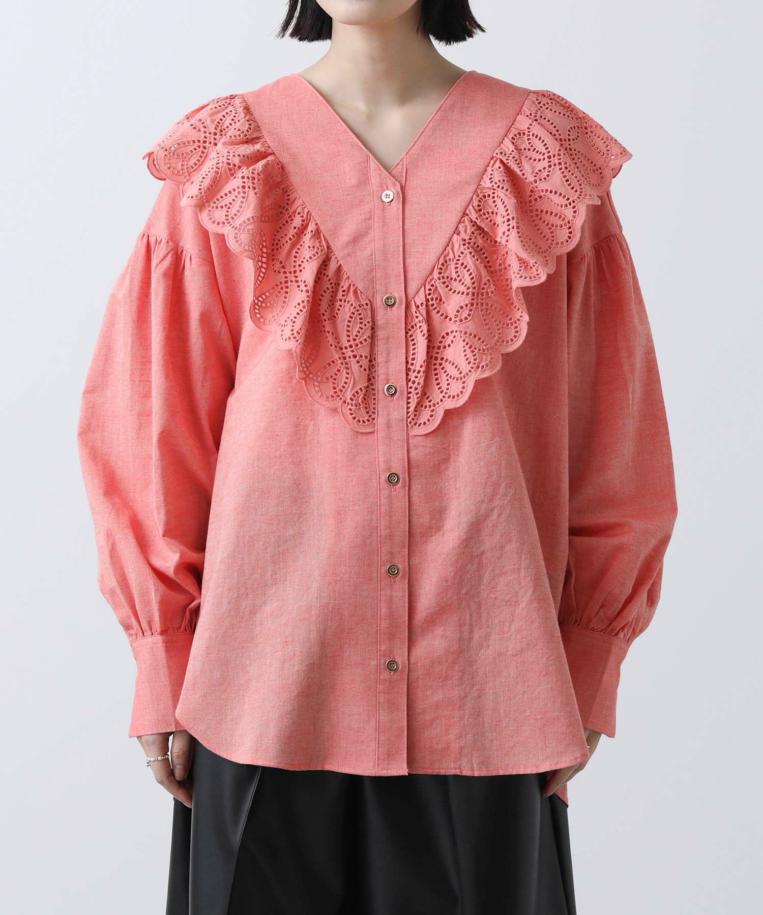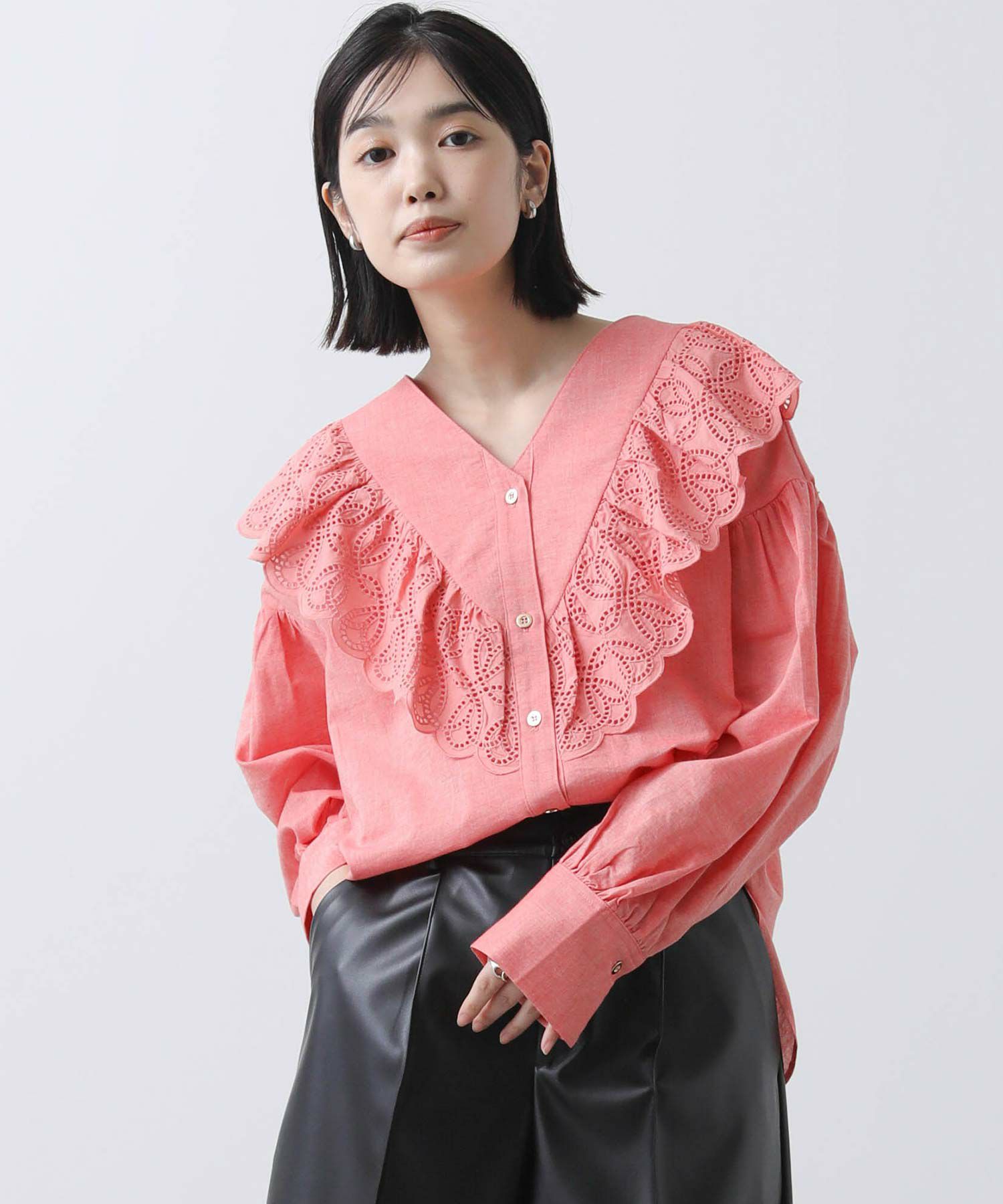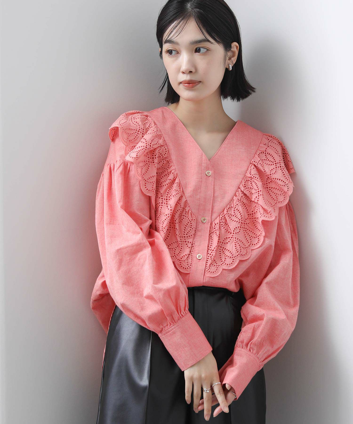 一枚で華やかなブラウスなので、シンプルなボトムスとのコーディネートがおすすめです。
