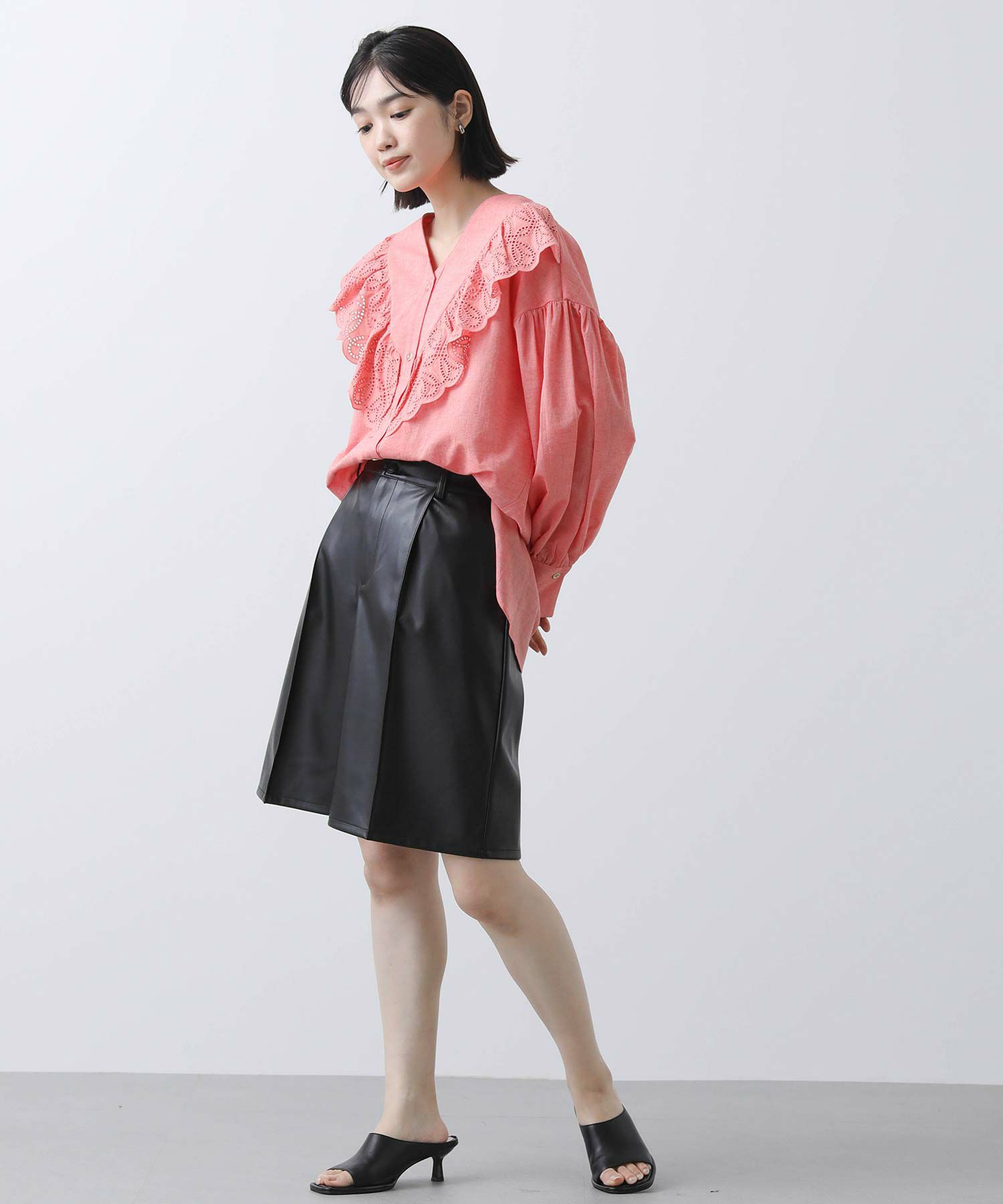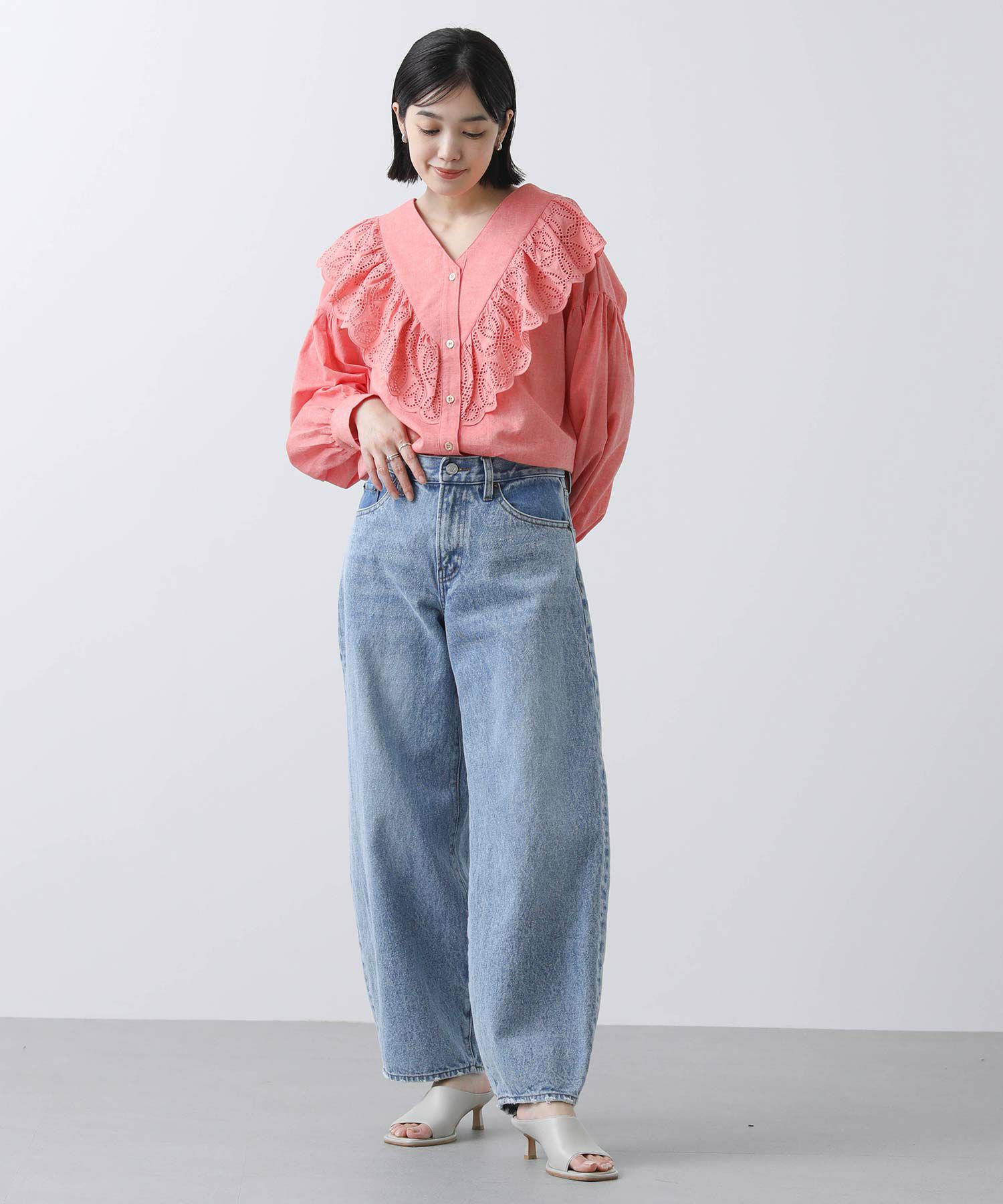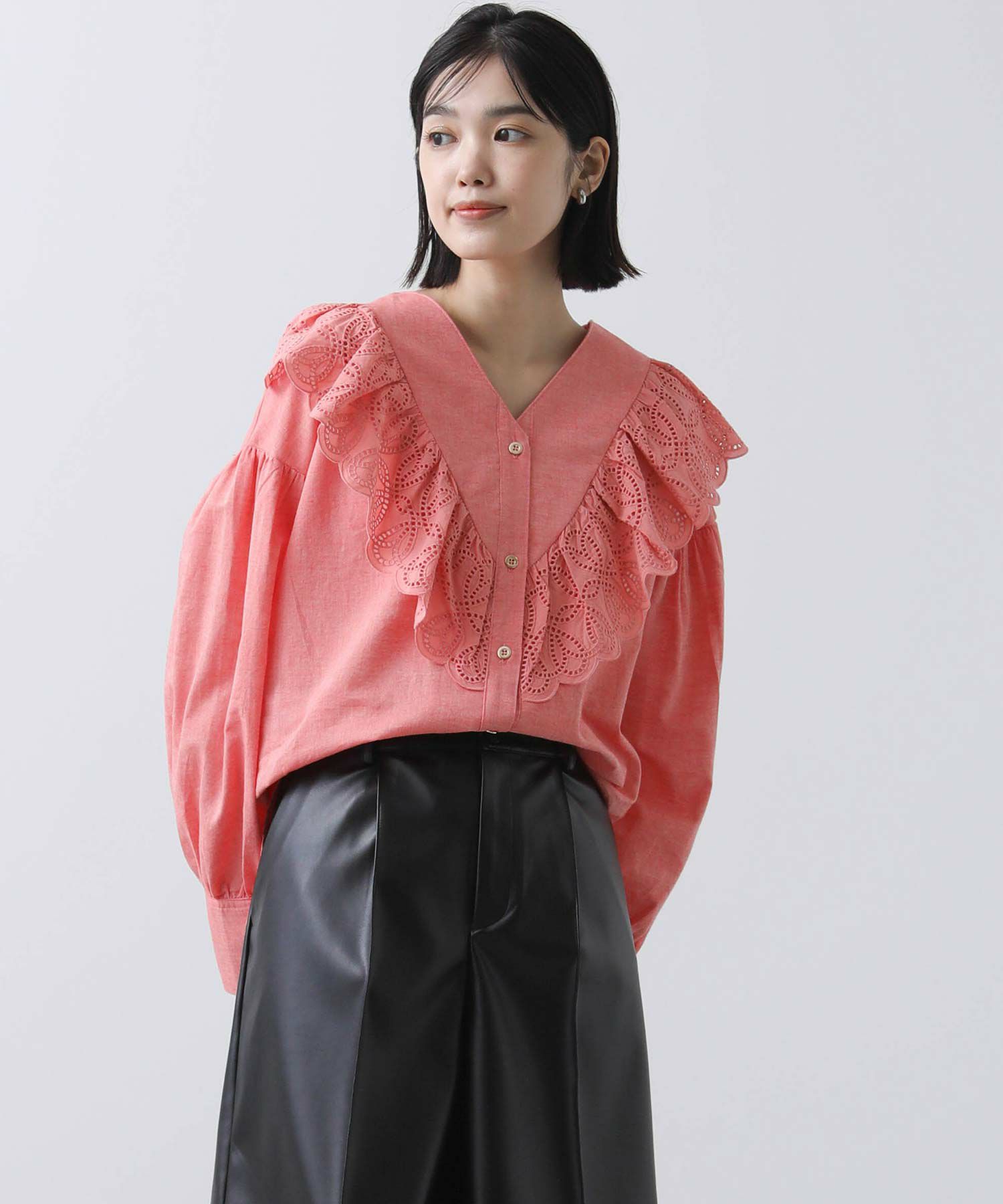 一枚で華やかなブラウスなので、シンプルなボトムスとのコーディネートがおすすめです。