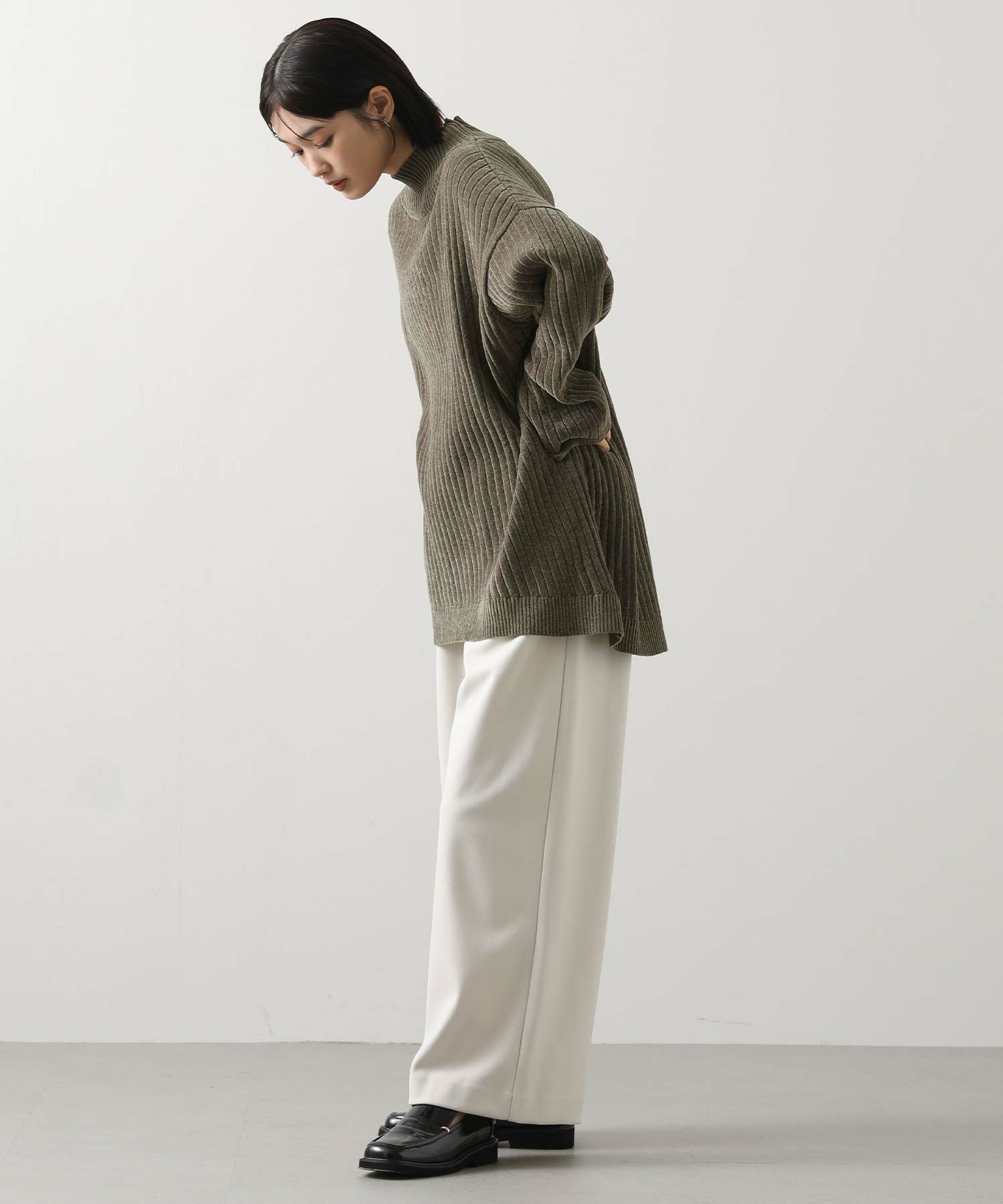 ヒップをカバーするチュニック丈と、ワイドリブデザインでスッキリ見えします。