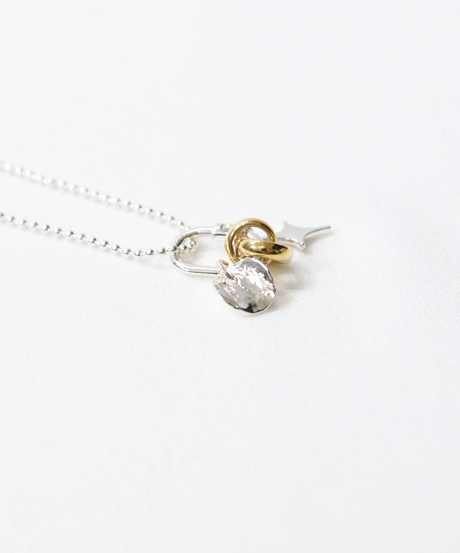 スワロフキーが付いたリングパーツに、プレートチャーム、コイル、オーナメントパーツをあわせた、かわいらしさとトレンド感あるデザインのネックレス。