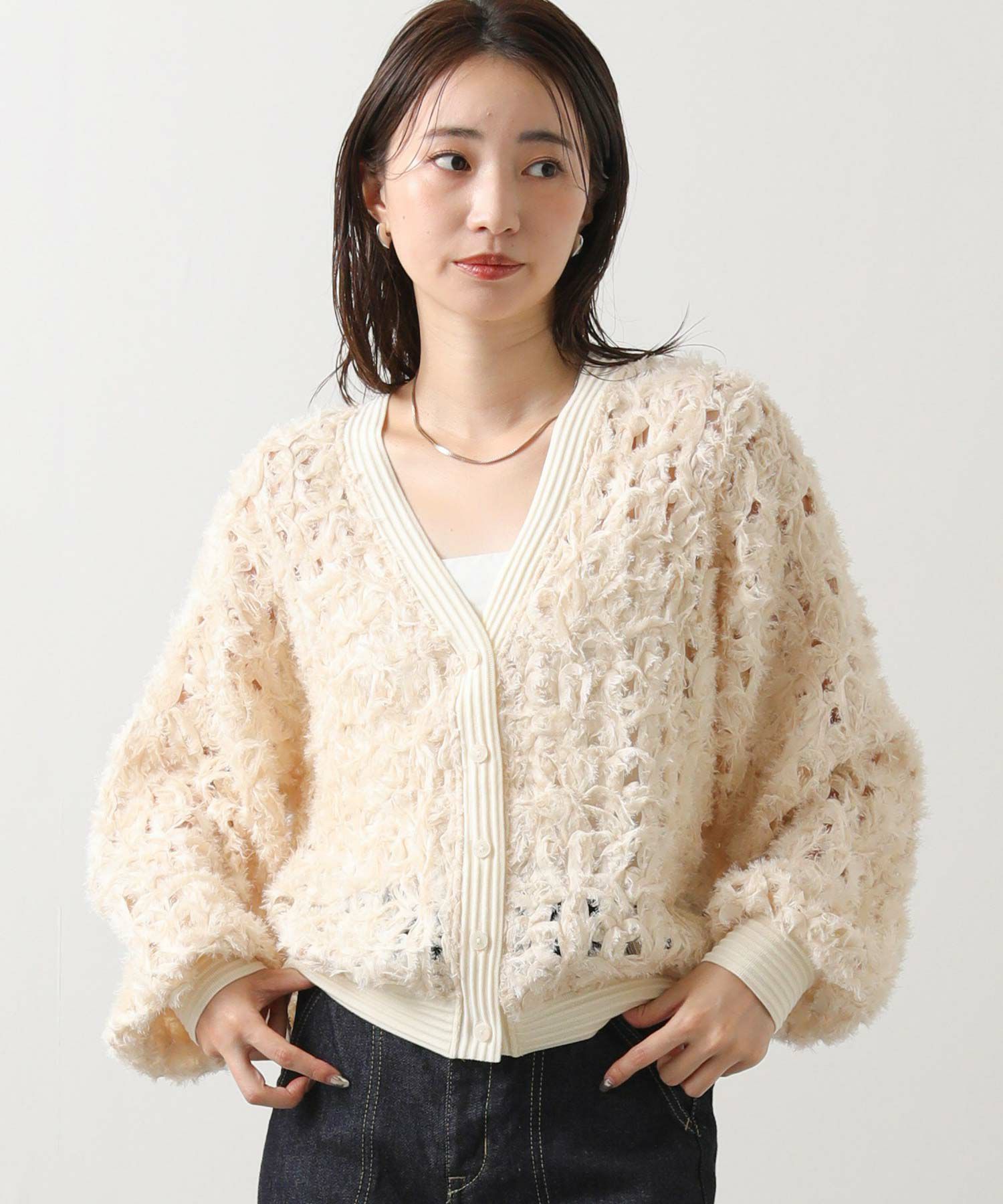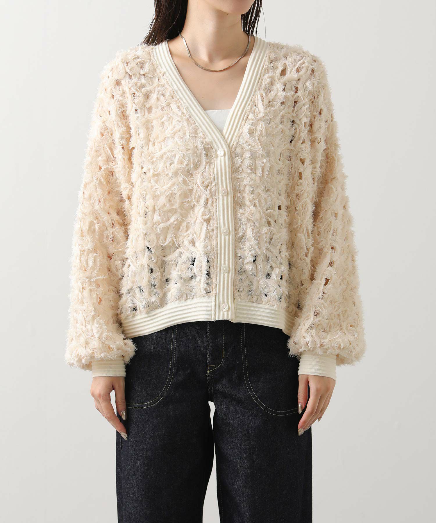フラワーモチーフのレースが印象的なVネックカーデ。
