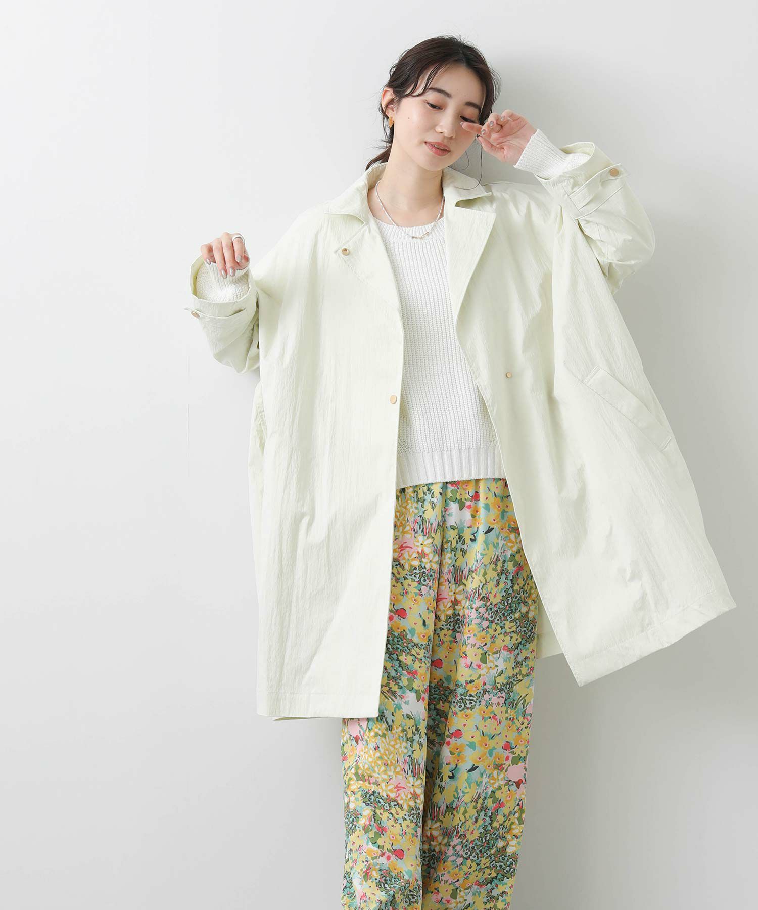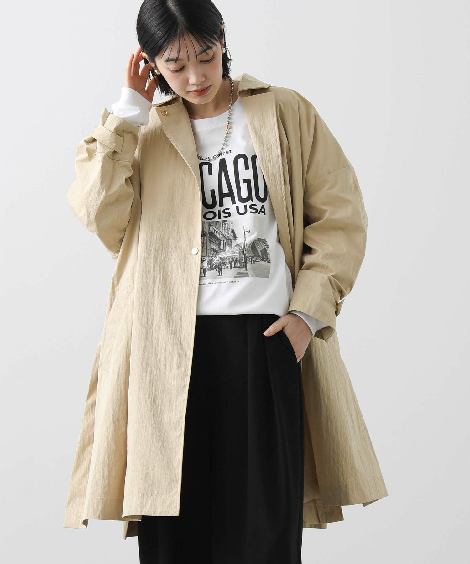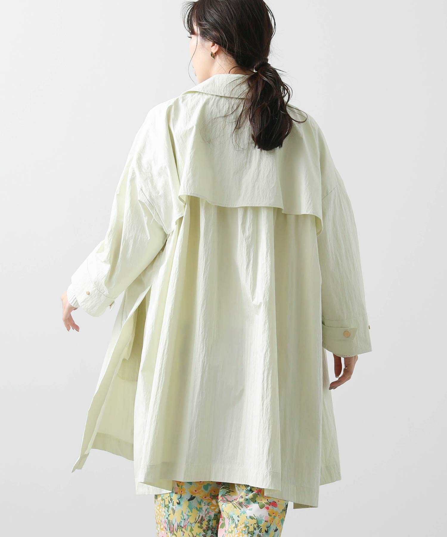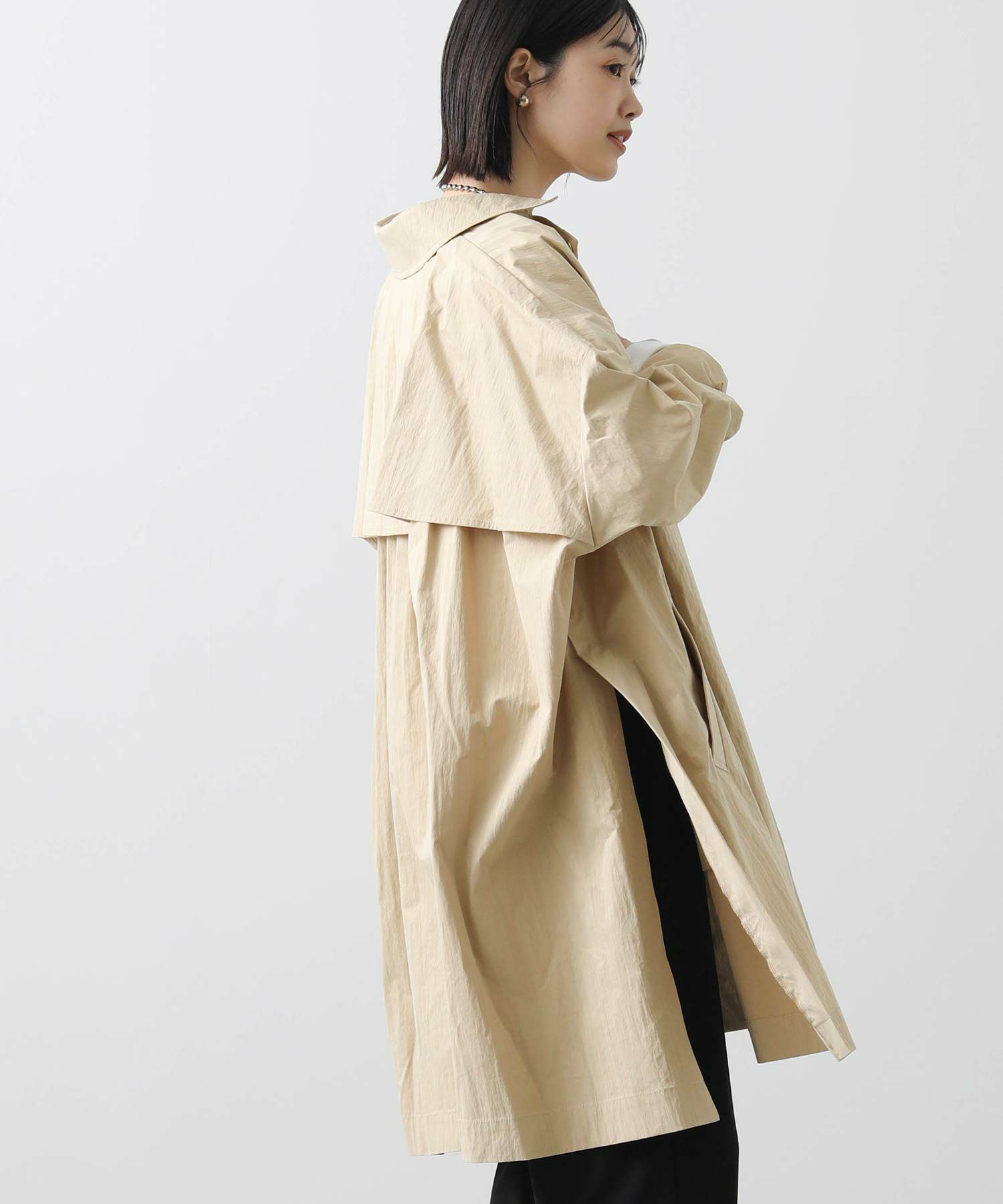 トレンチコートから着想を得たこなれ感のあるコートで、閉じても開いてもサマになるスタンダードなステンカラーデザイン。ピーチ感のある表面と程よい厚み、ハリのある素材でシルエットを美しく保ちます。