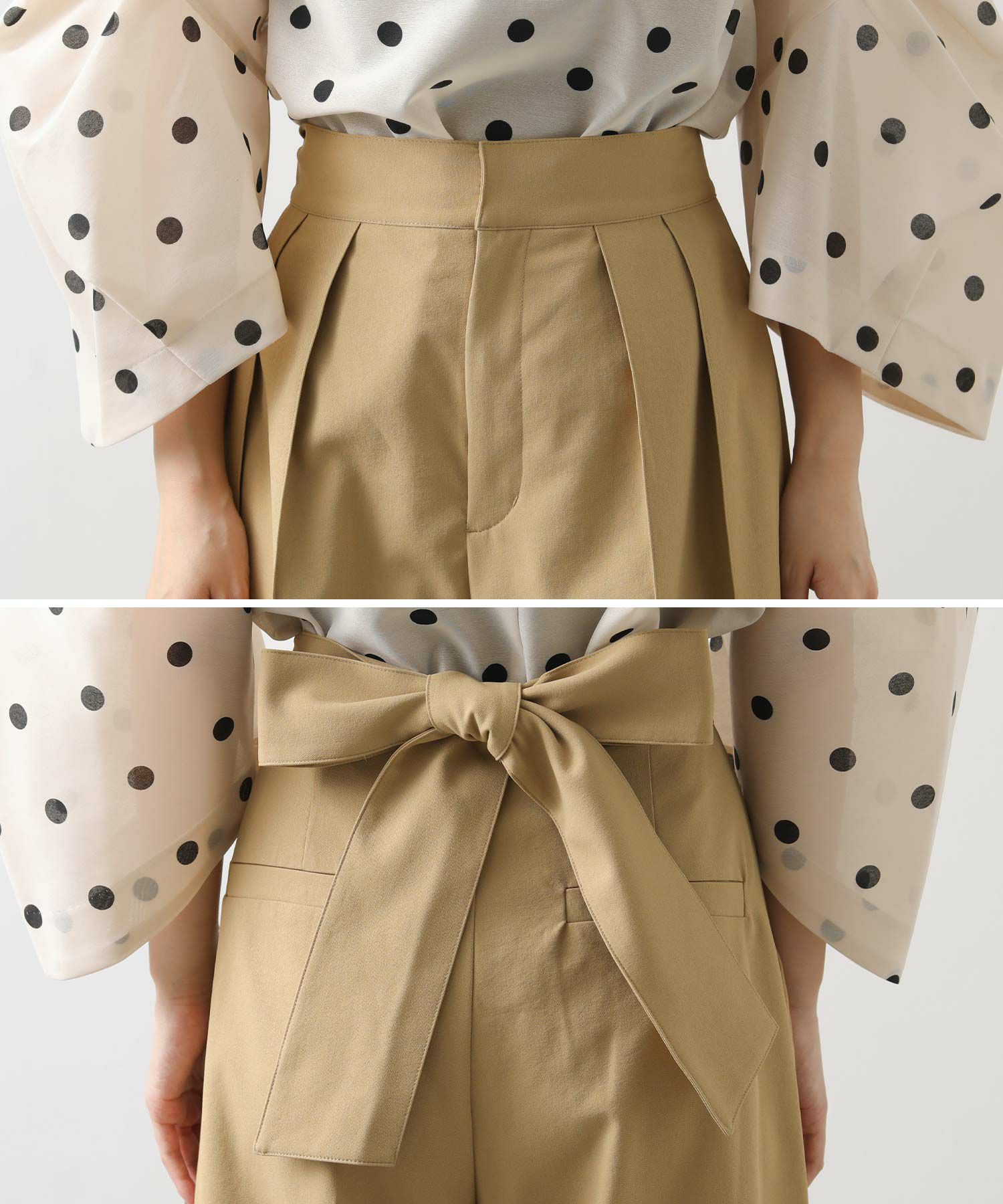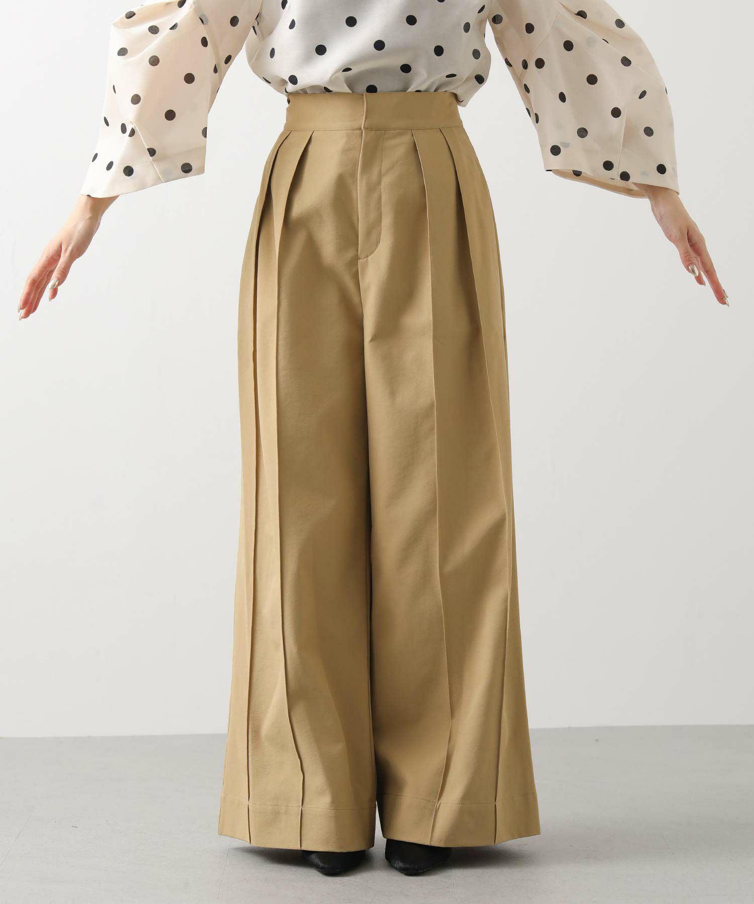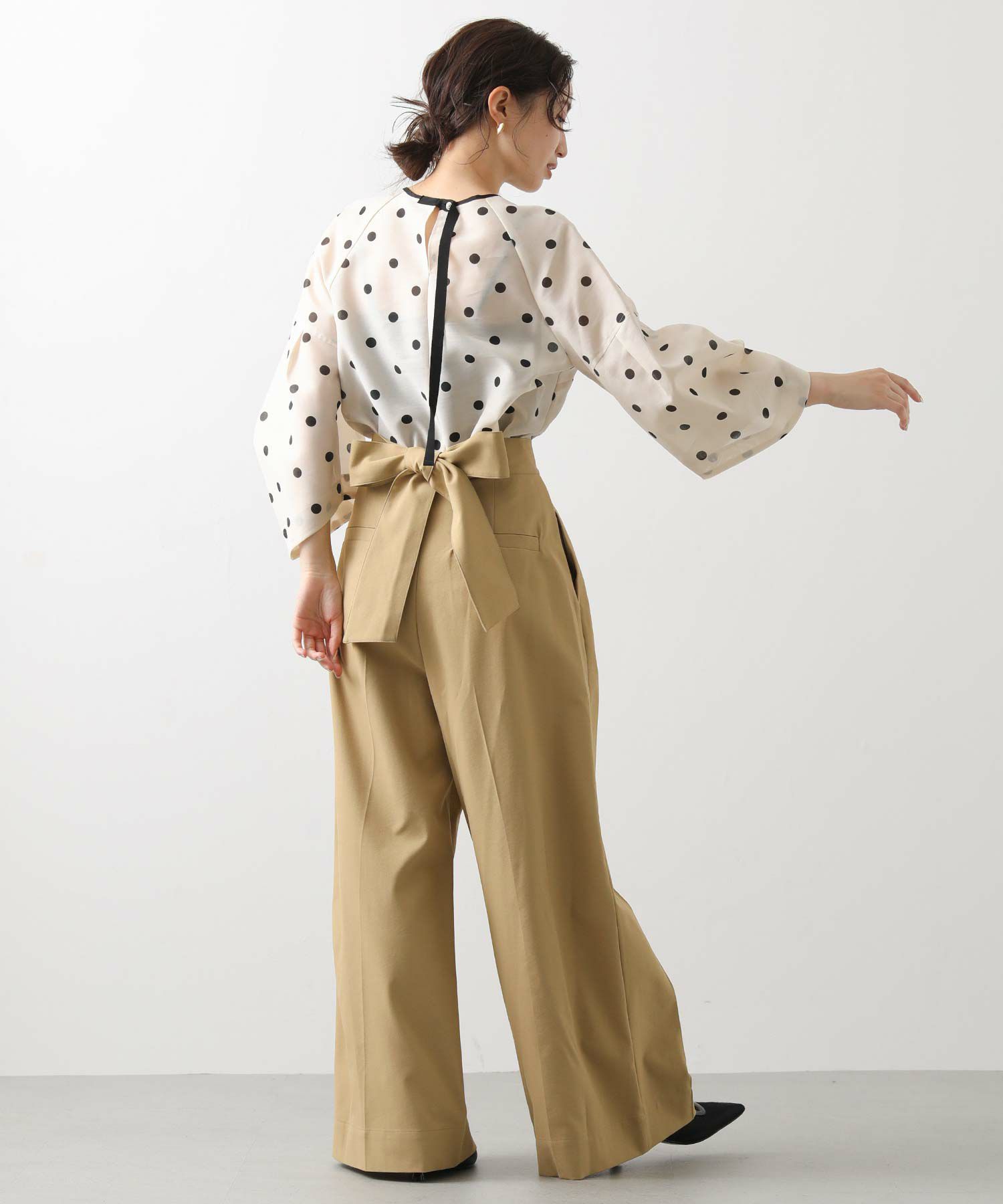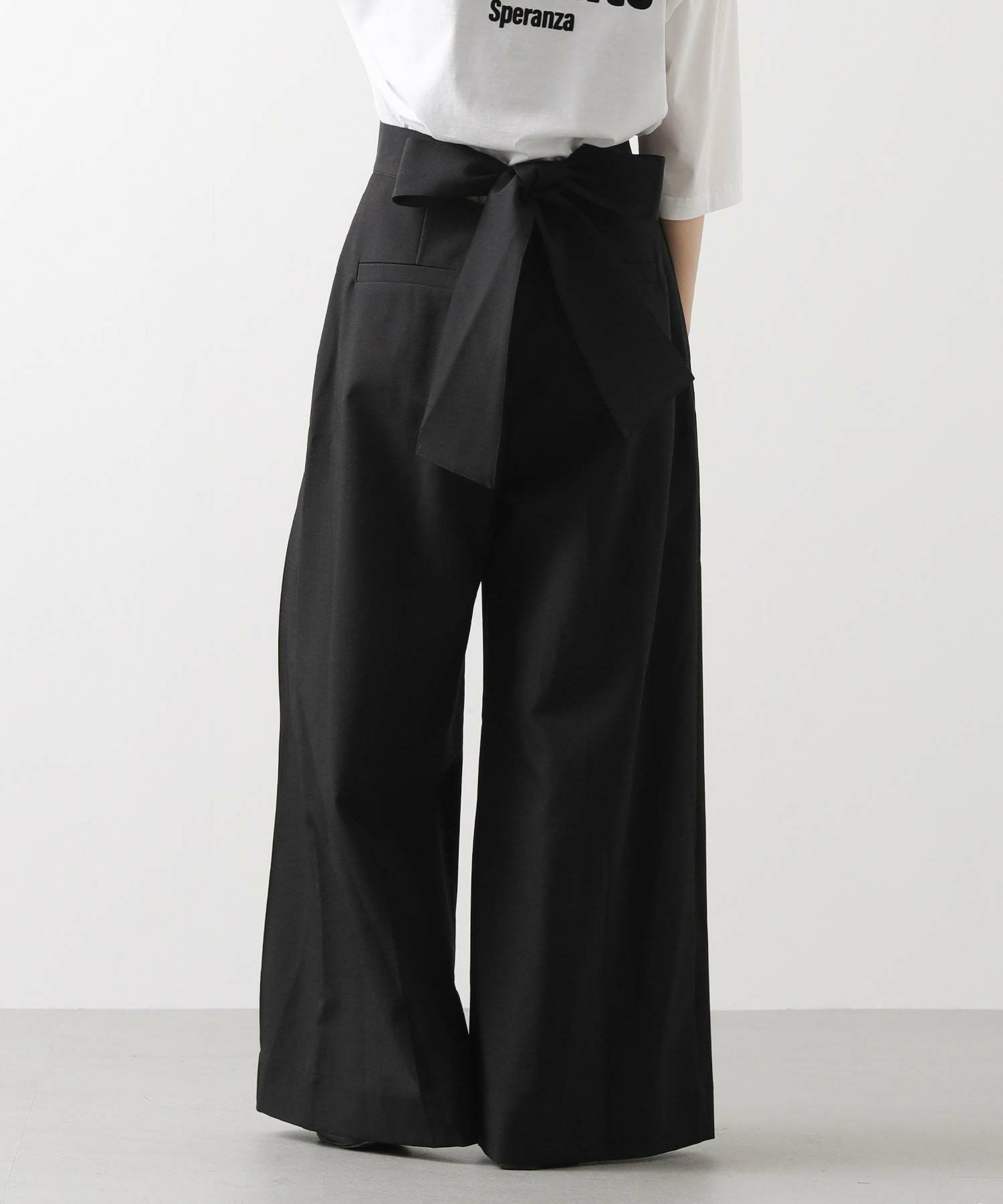 【Mewl(ミュール】から、バックスタイルの大きめリボンがポイントになったピンタックワイドパンツをセレクト。