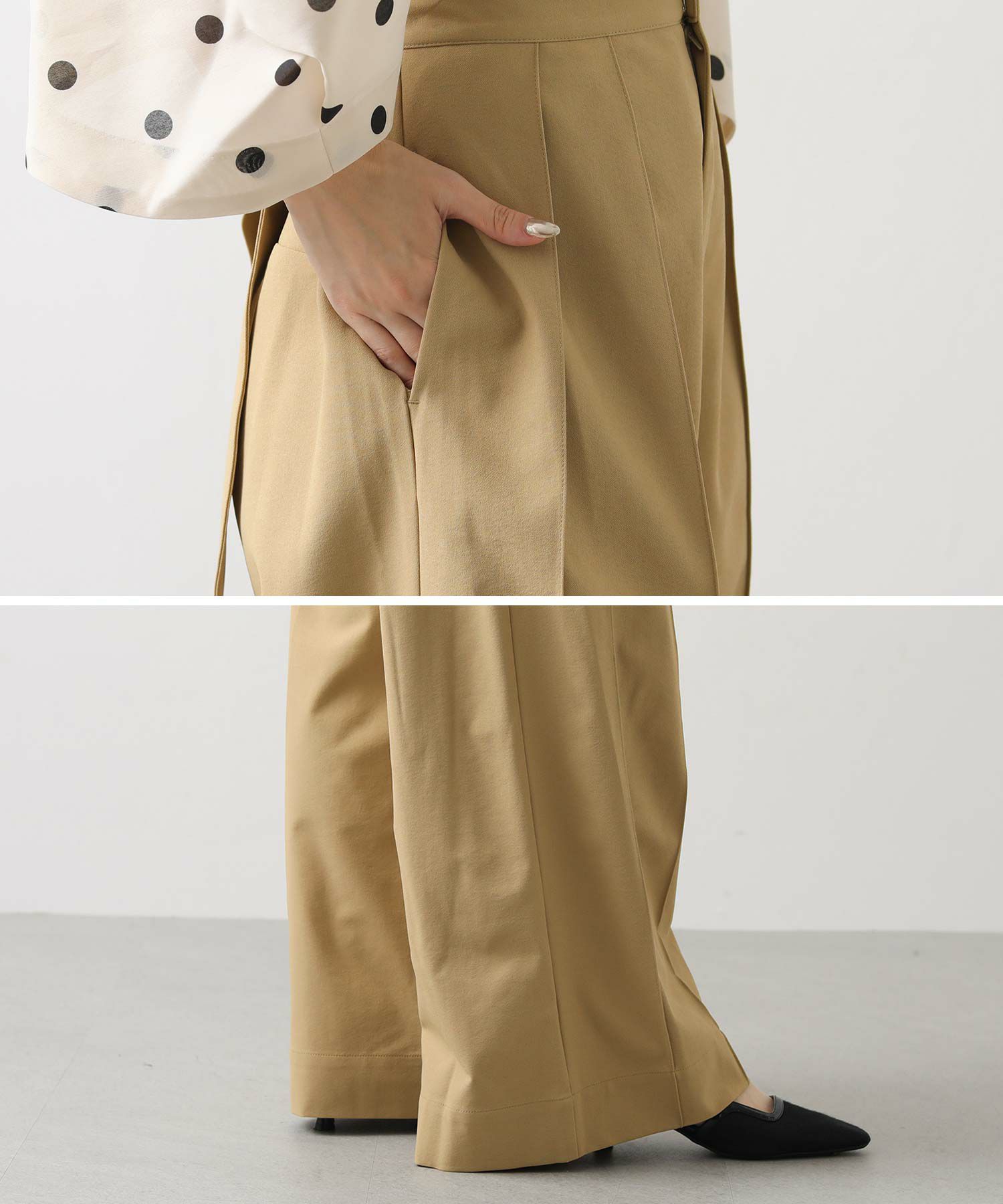 タック端にもピンタックを入れているので、縦に入る2本のピンタックのラインが、脚をスッキリ見せてくれます。