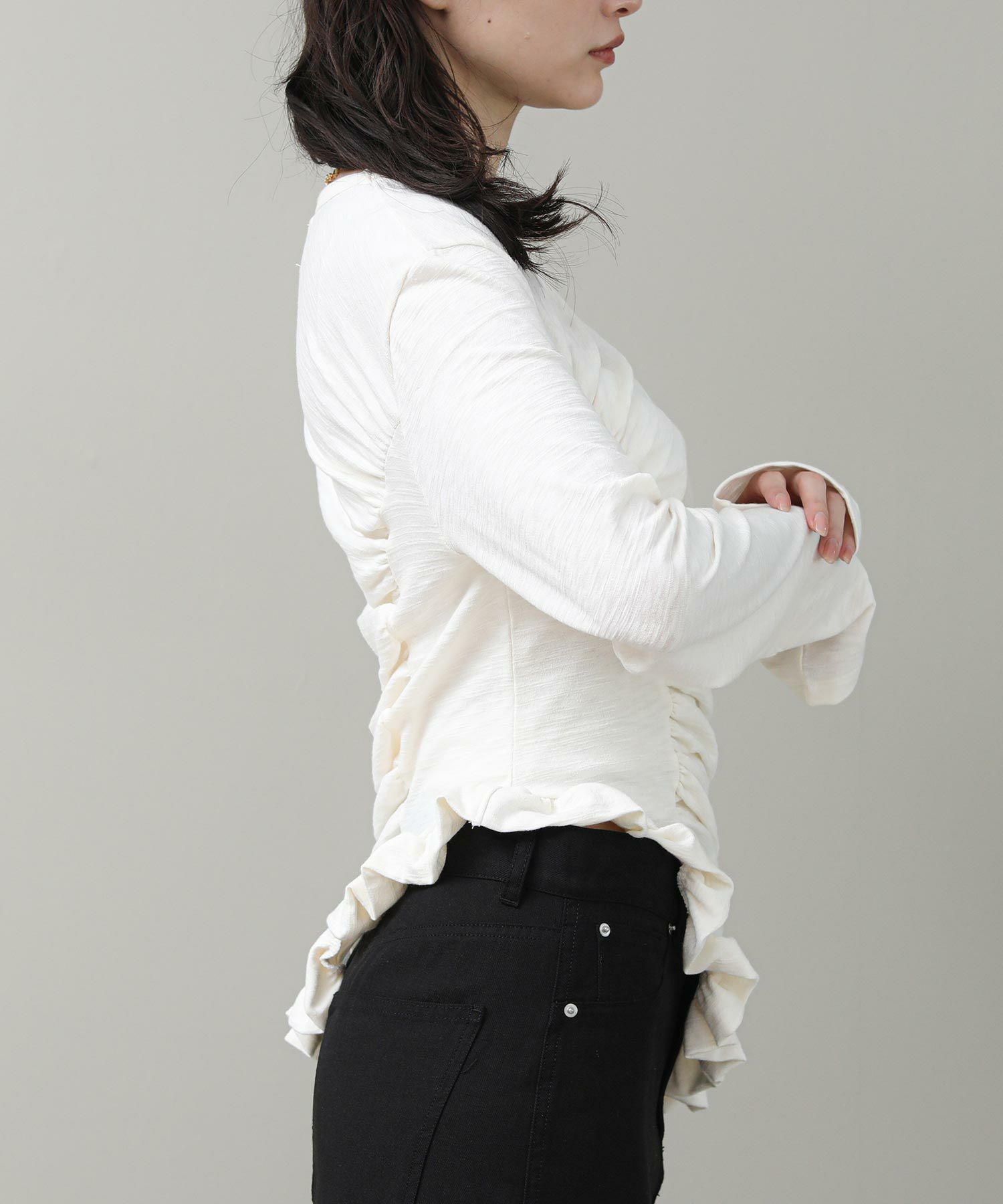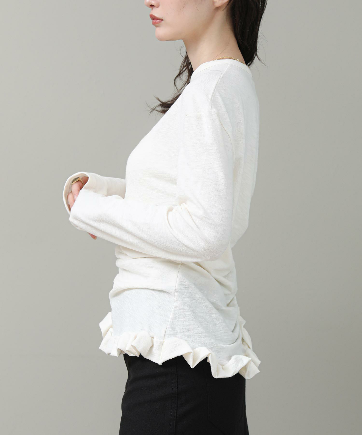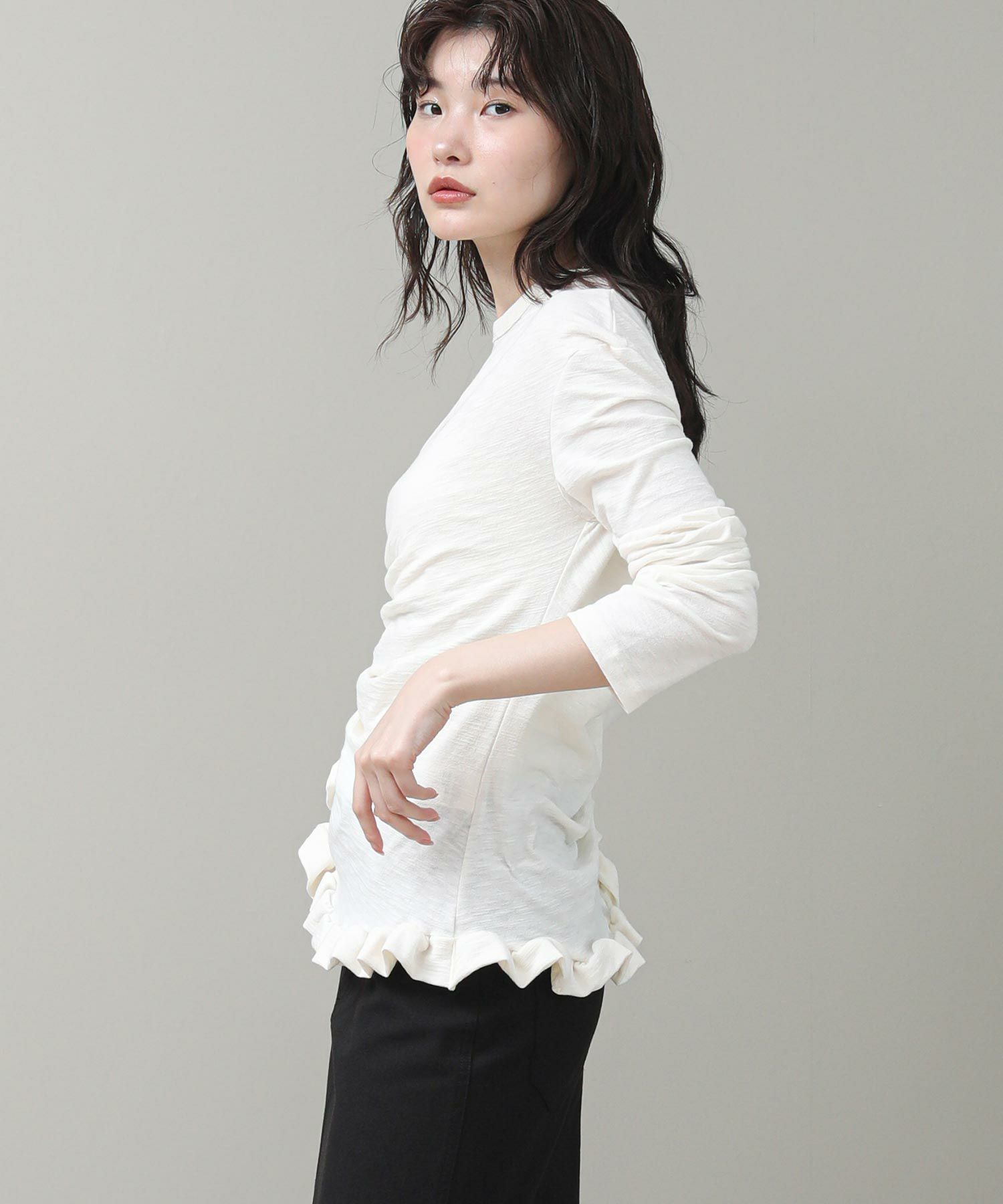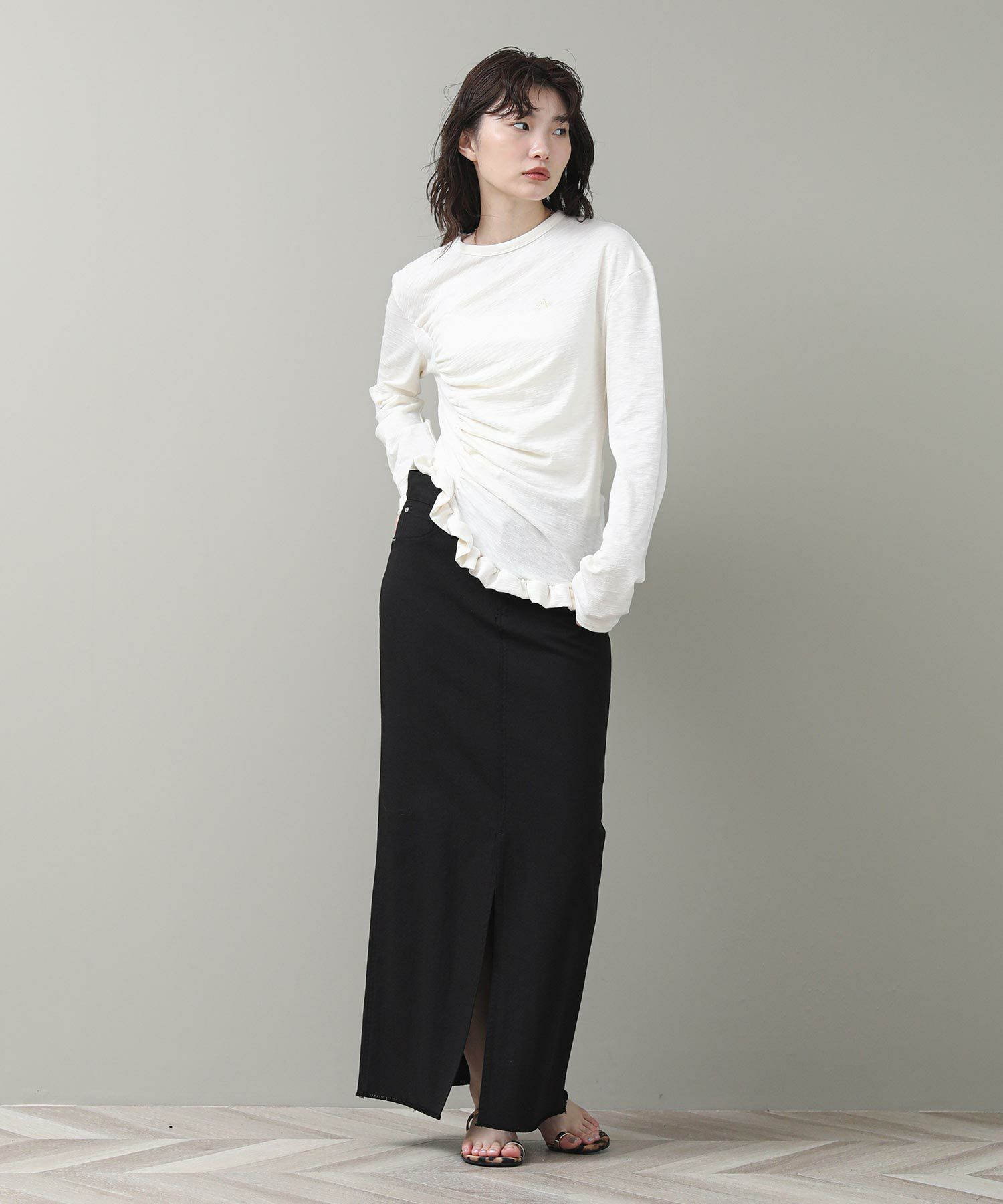 カットソーやスウェットなど日常的なアイテムにエッジの効いたデザインを加え、着心地の良さとデザイン性を両立させたアイテムが魅力のブランド。1枚で着映えるデザイントップス。デニムやスラックスなどベーシックなボトムと合わせてもモードな印象にまとまります。