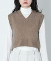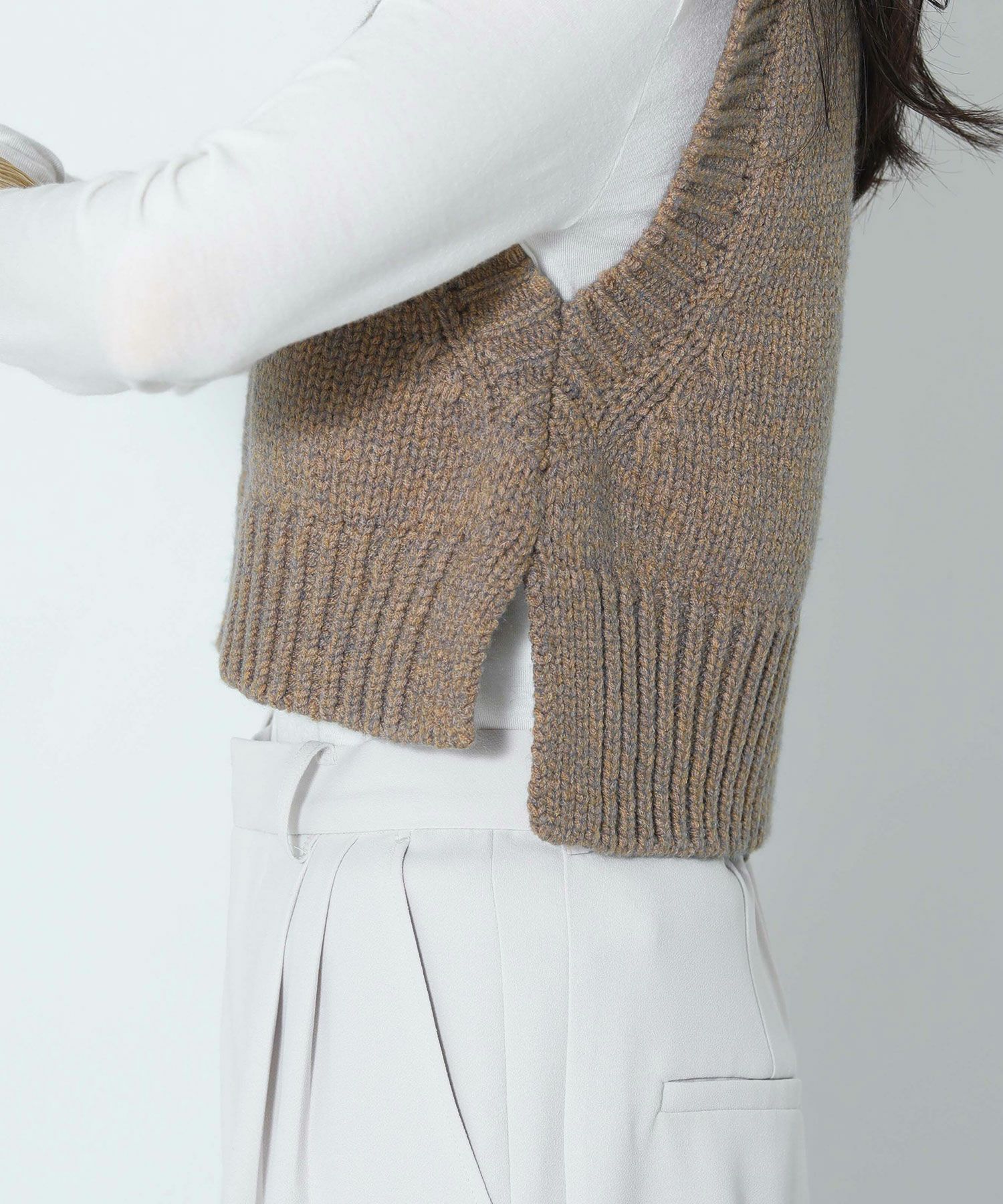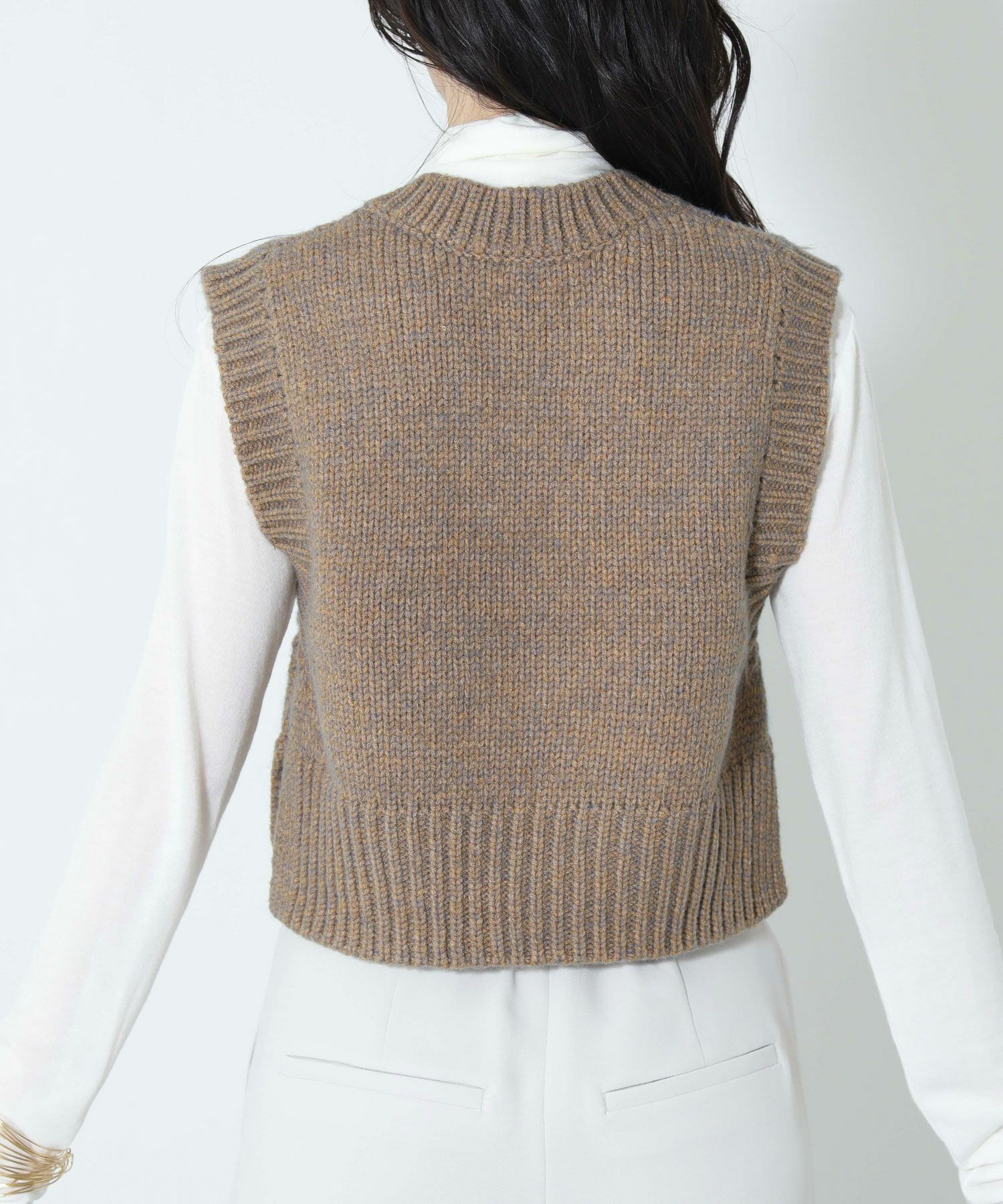 メランジの糸を使用して編んだニットベスト。