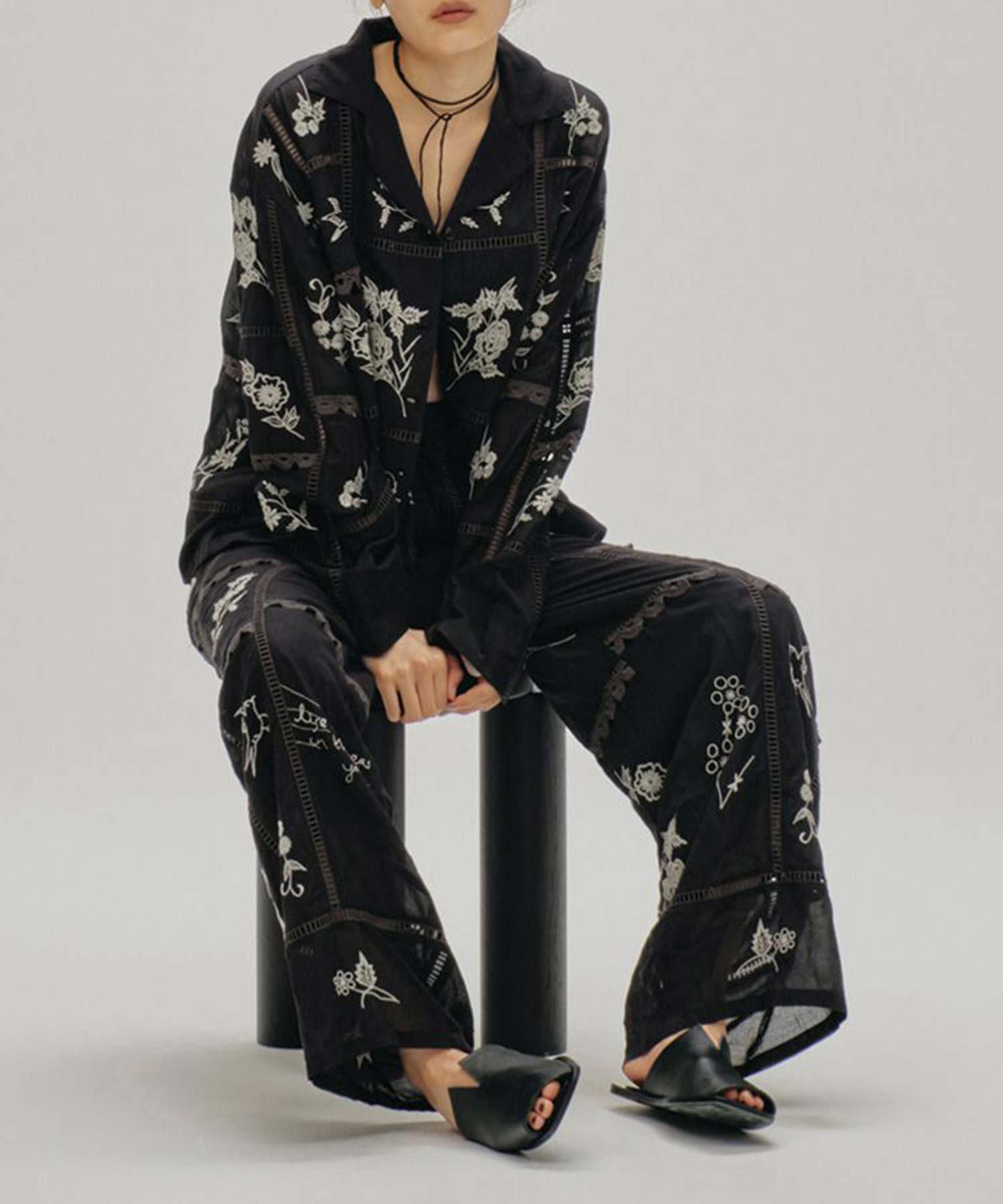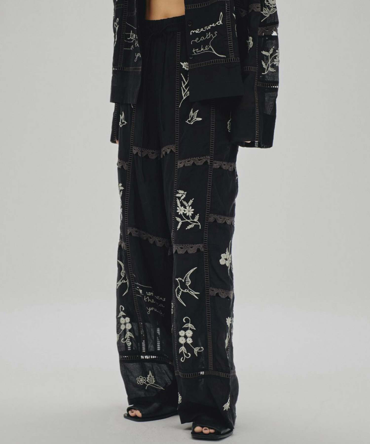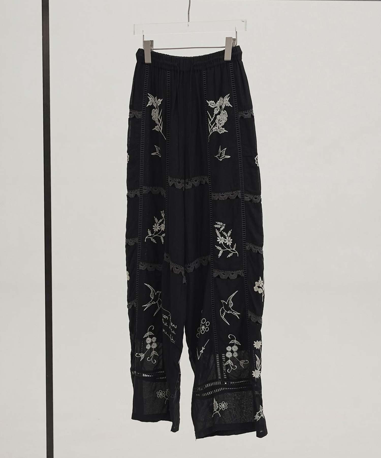 13種類もの刺繍をふんだんにあしらったパッチワークが目を惹くトラウザーズ。