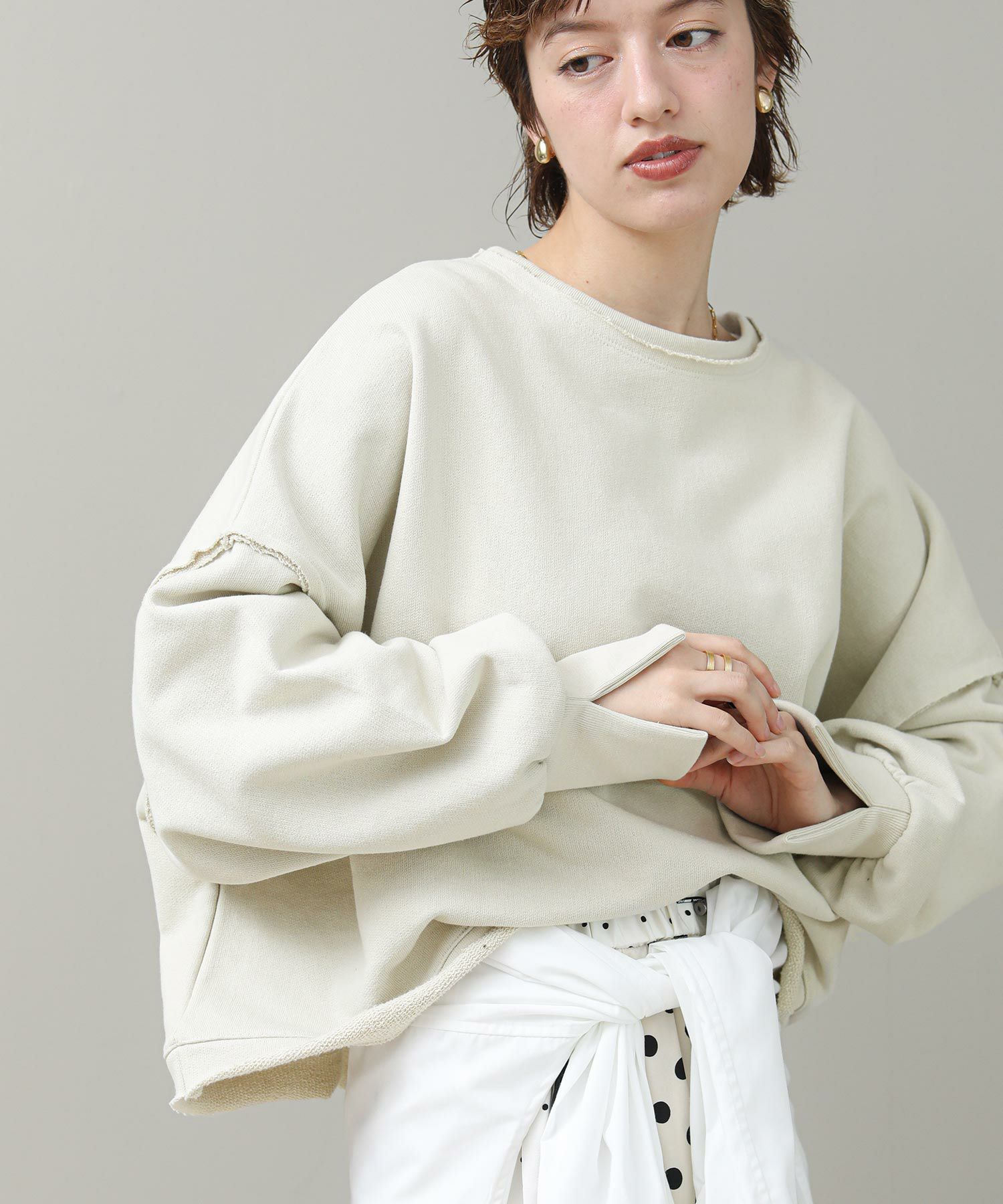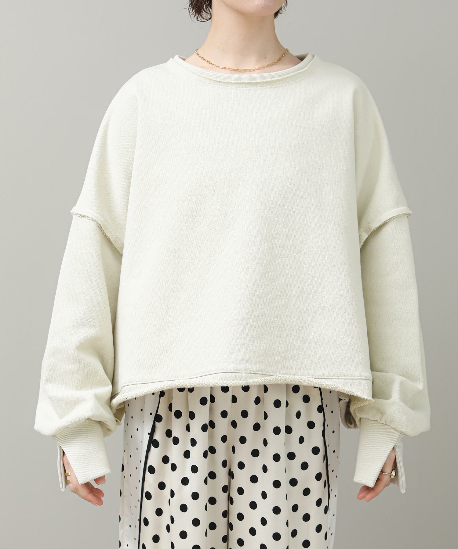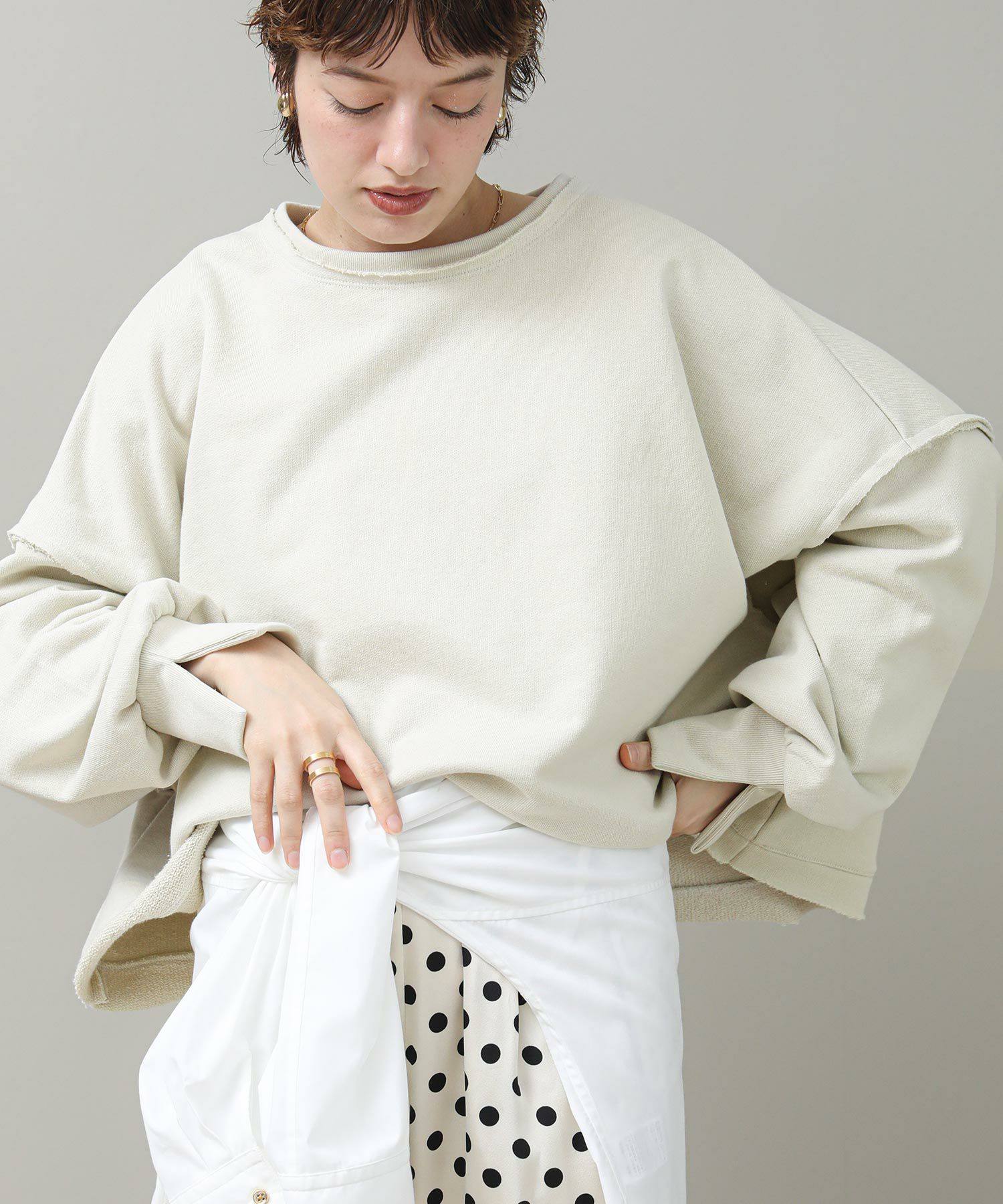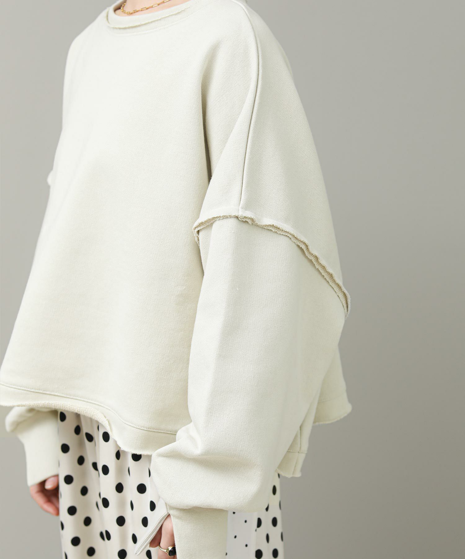 袖と裾でネックのレイヤード風のカットオフデザインが目を惹きます。たっぷりとしたオーバーシルエットですが、着丈を短めに設定しているのでワイドパンツやスカートとも好相性。