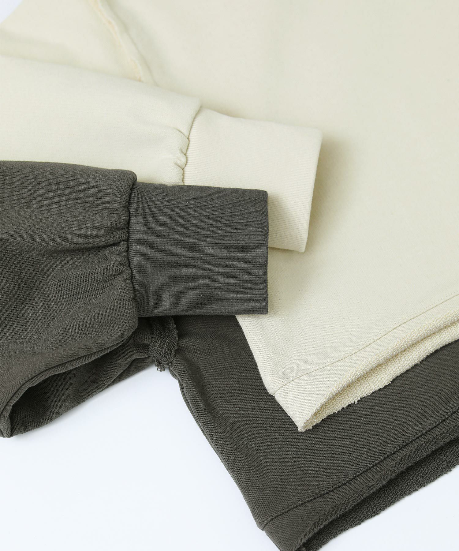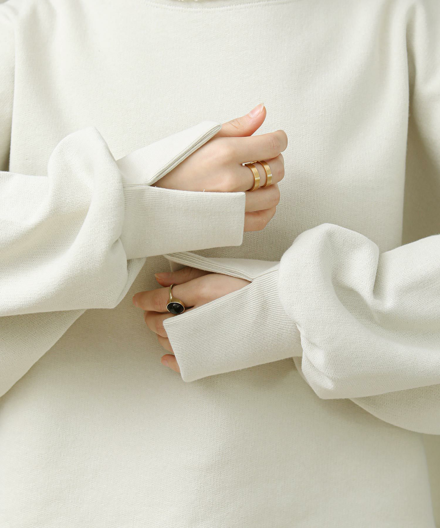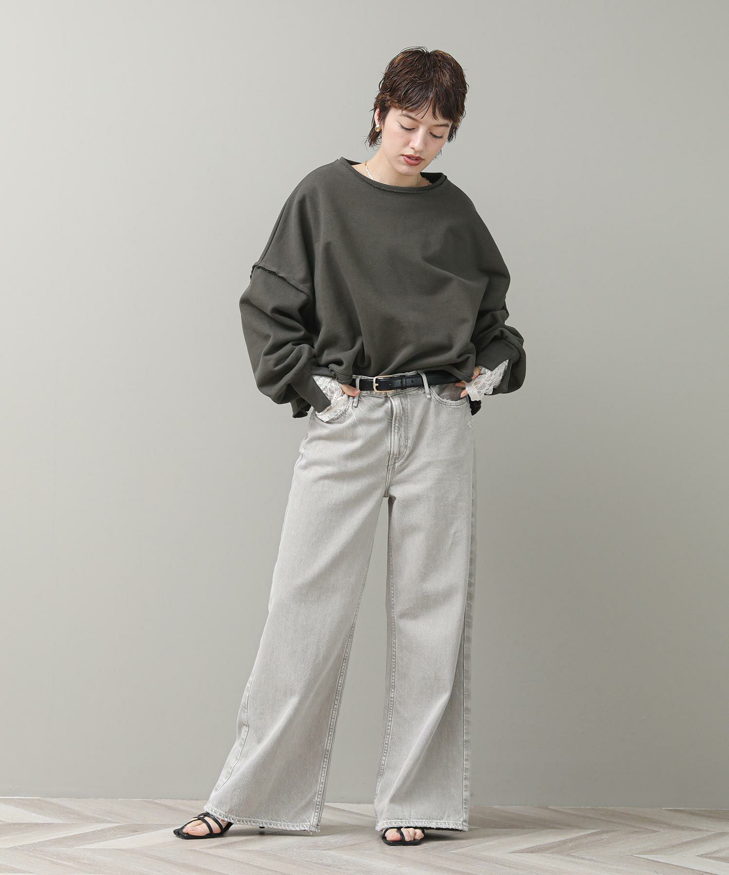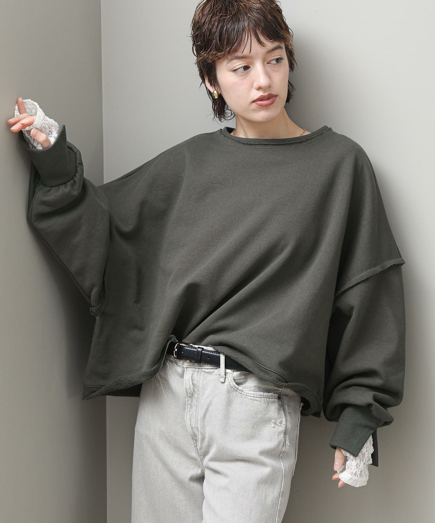 袖と裾でネックのレイヤード風のカットオフデザインが目を惹きます。たっぷりとしたオーバーシルエットですが、着丈を短めに設定しているのでワイドパンツやスカートとも好相性。