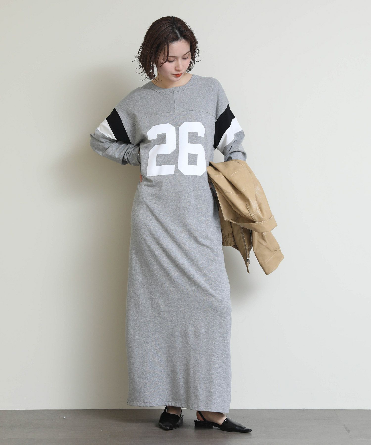 存在感のある「26」ロゴと、程よいIラインシルエットがラフなのに大人っぽい印象を演出します。