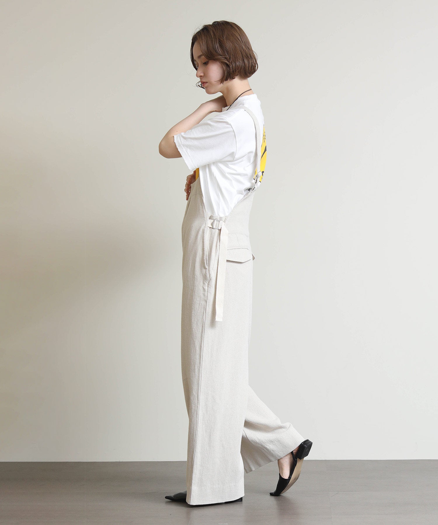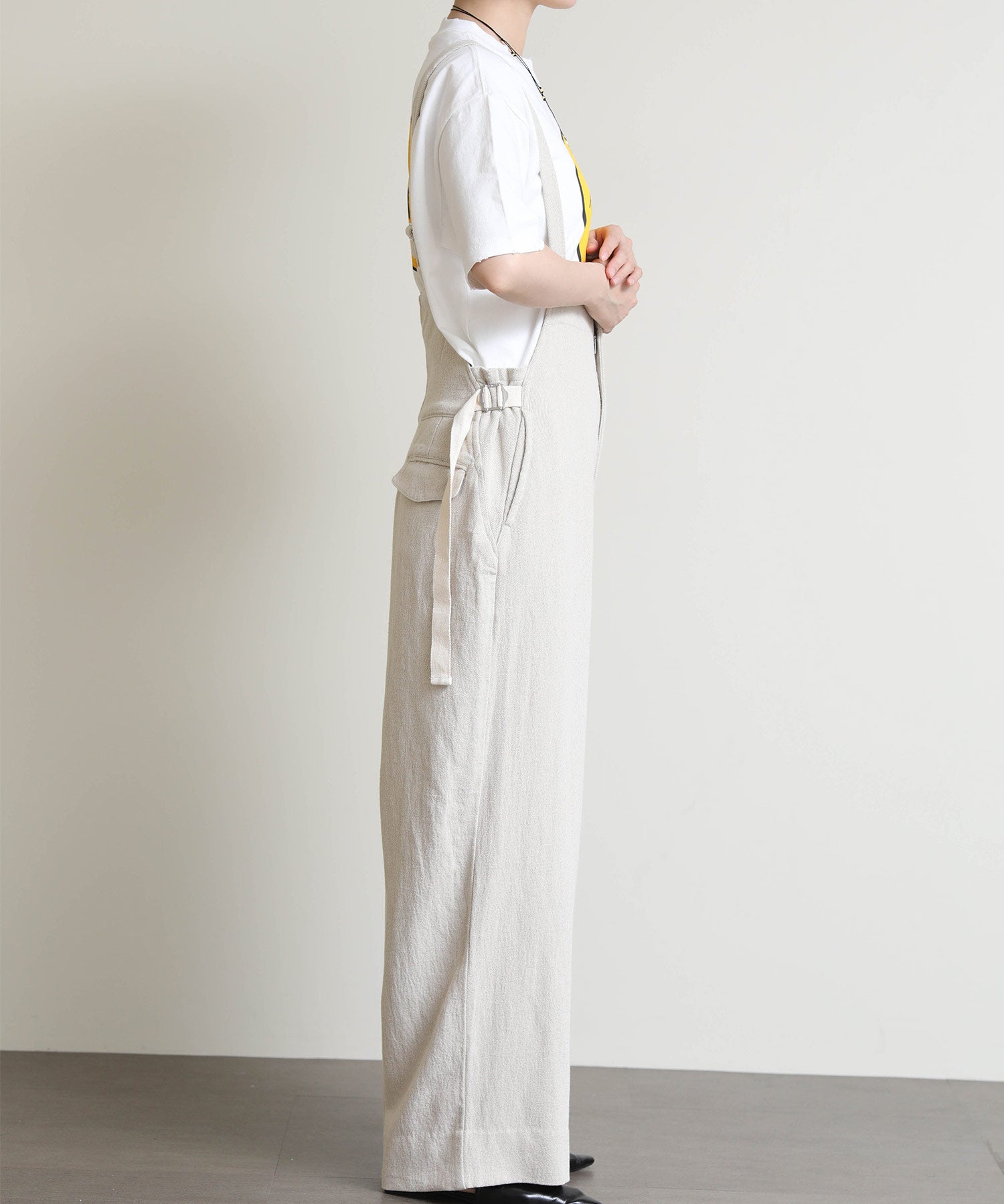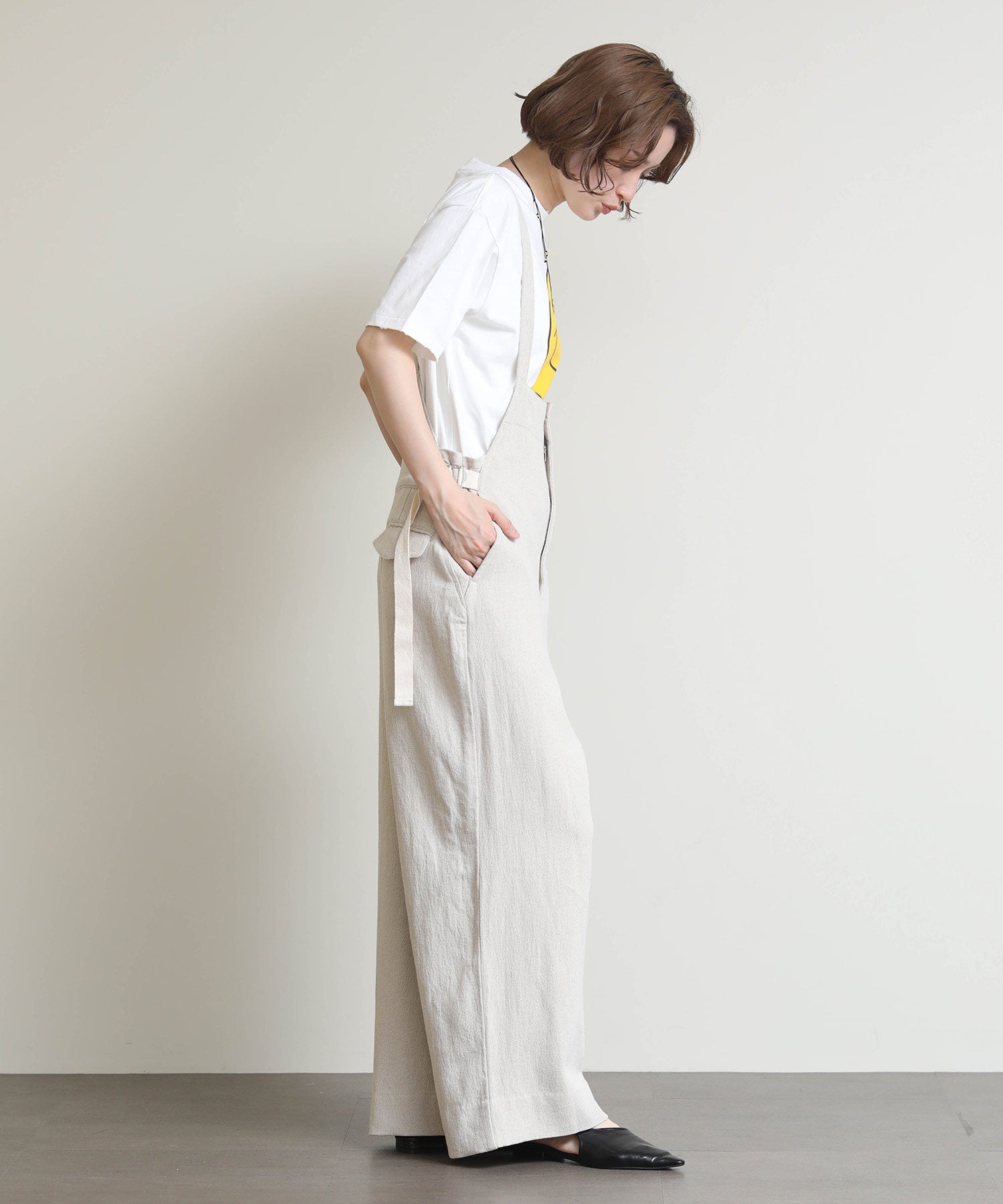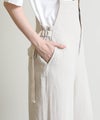 ラフな雰囲気の中に大人っぽさをプラスした、デイリーに活躍する一着。通気性に優れた麻混素材で、さらっと軽やかな着心地。ワイドめのシルエットが身体のラインを拾わず、リラックス感がありながらもバランスよく着こなせます。肩紐で長さ調整が可能なので、好みのバランスで着用できるのも嬉しいポイント。