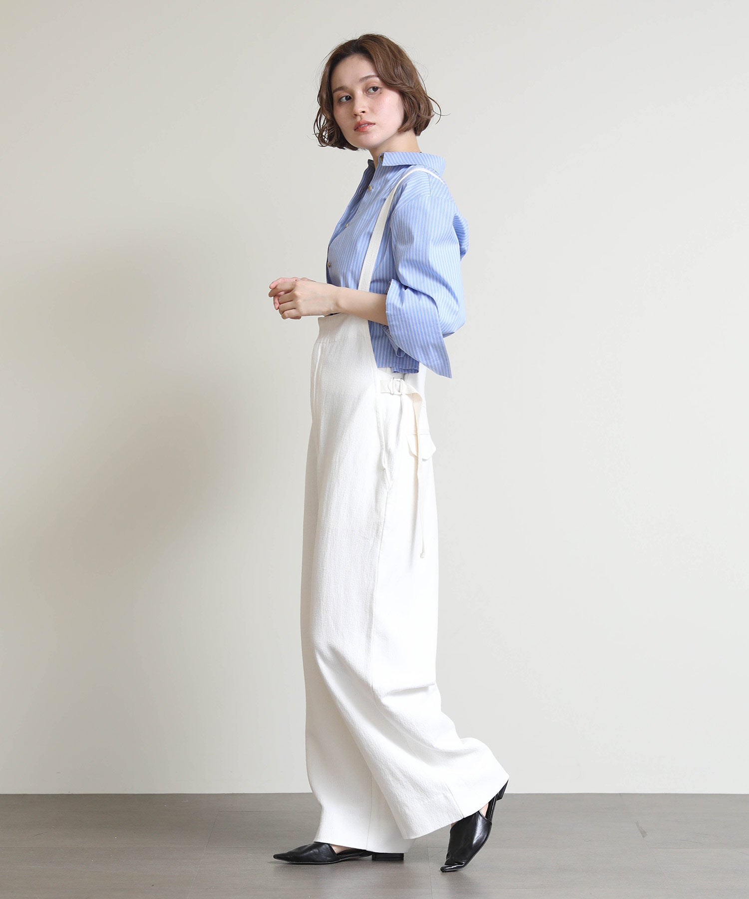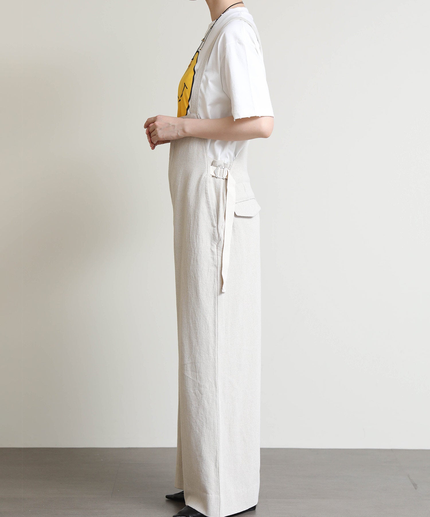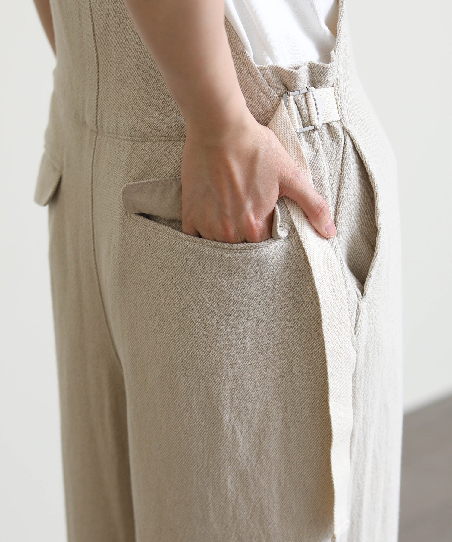 ラフな雰囲気の中に大人っぽさをプラスした、デイリーに活躍する一着。通気性に優れた麻混素材で、さらっと軽やかな着心地。ワイドめのシルエットが身体のラインを拾わず、リラックス感がありながらもバランスよく着こなせます。肩紐で長さ調整が可能なので、好みのバランスで着用できるのも嬉しいポイント。