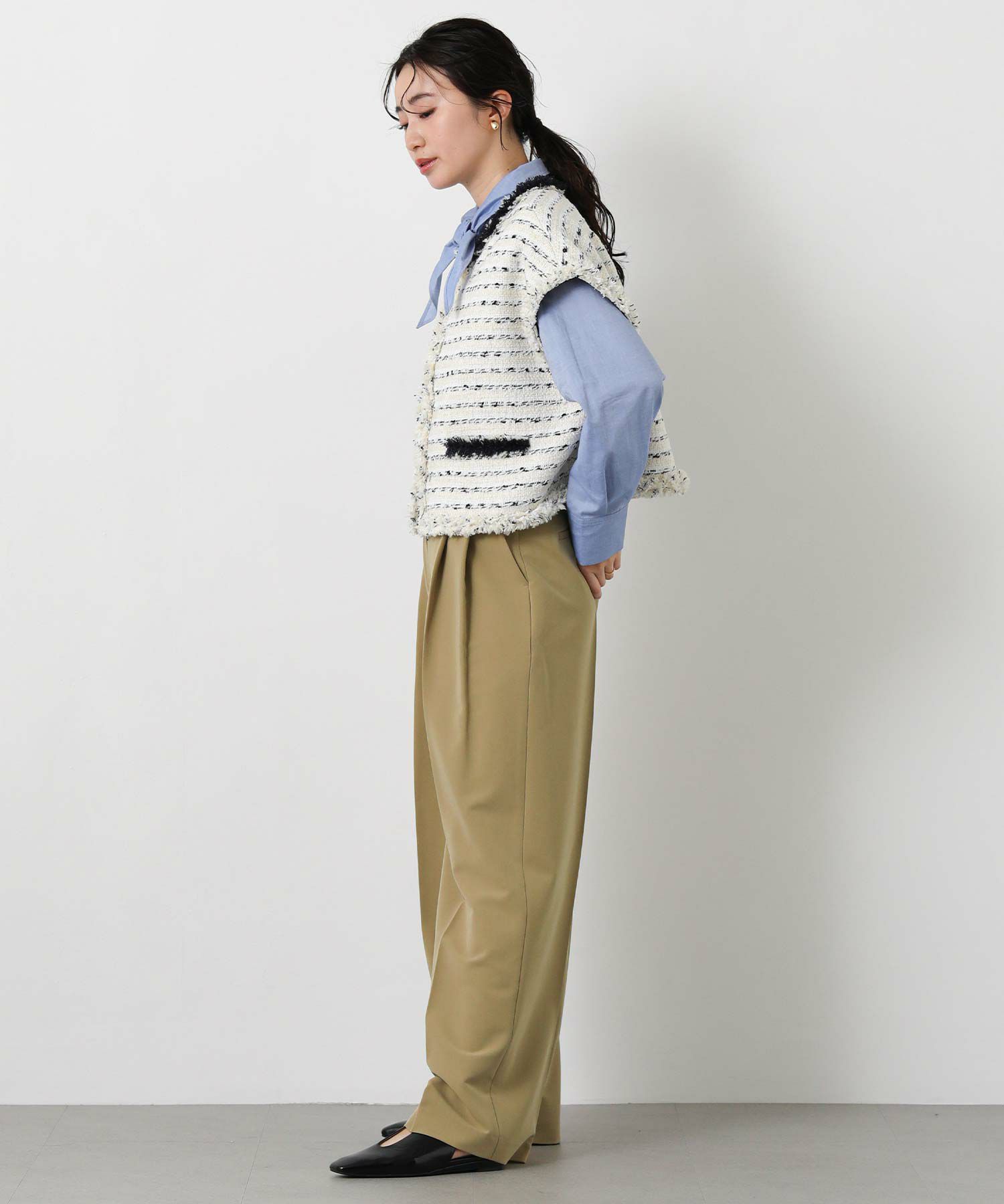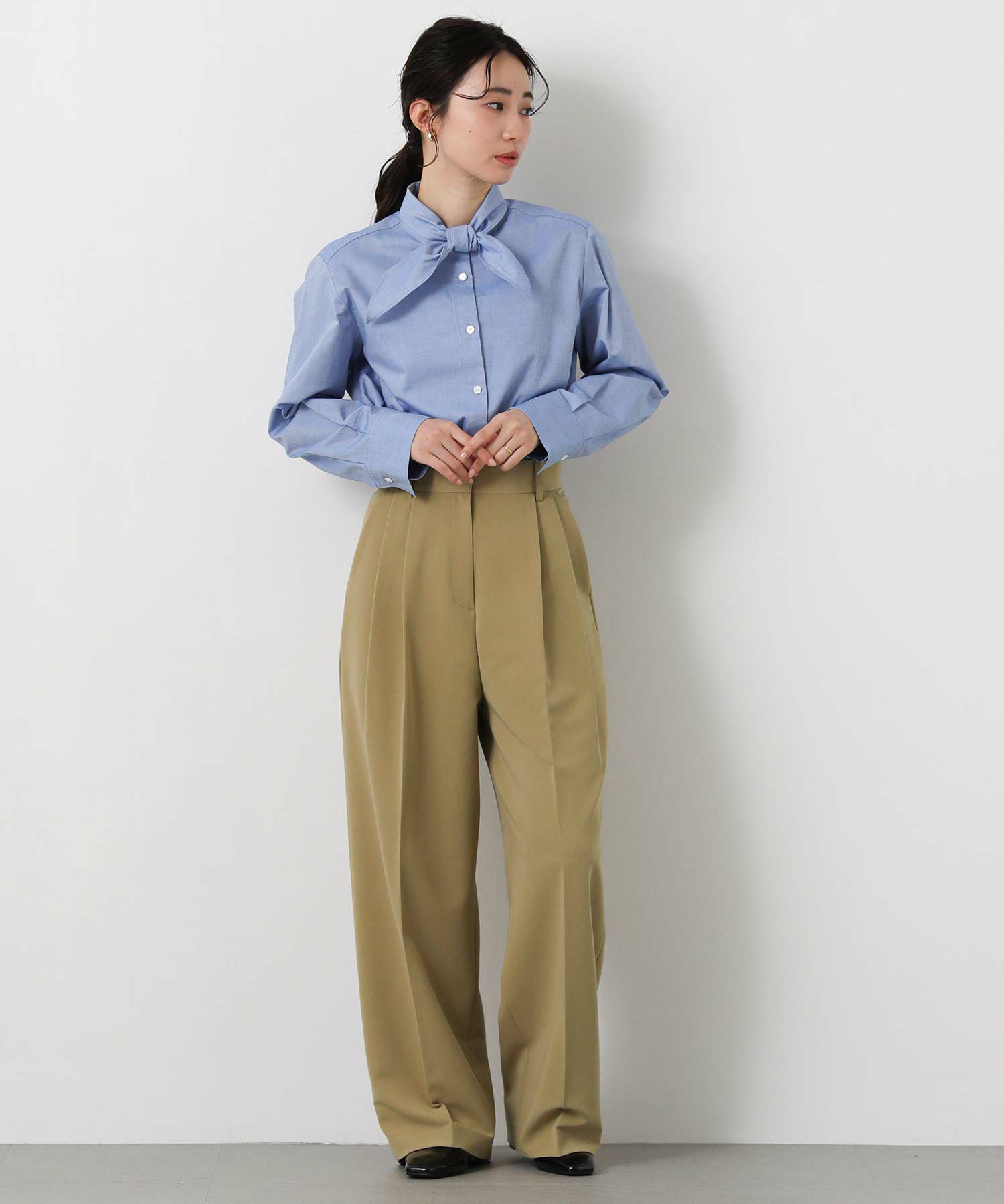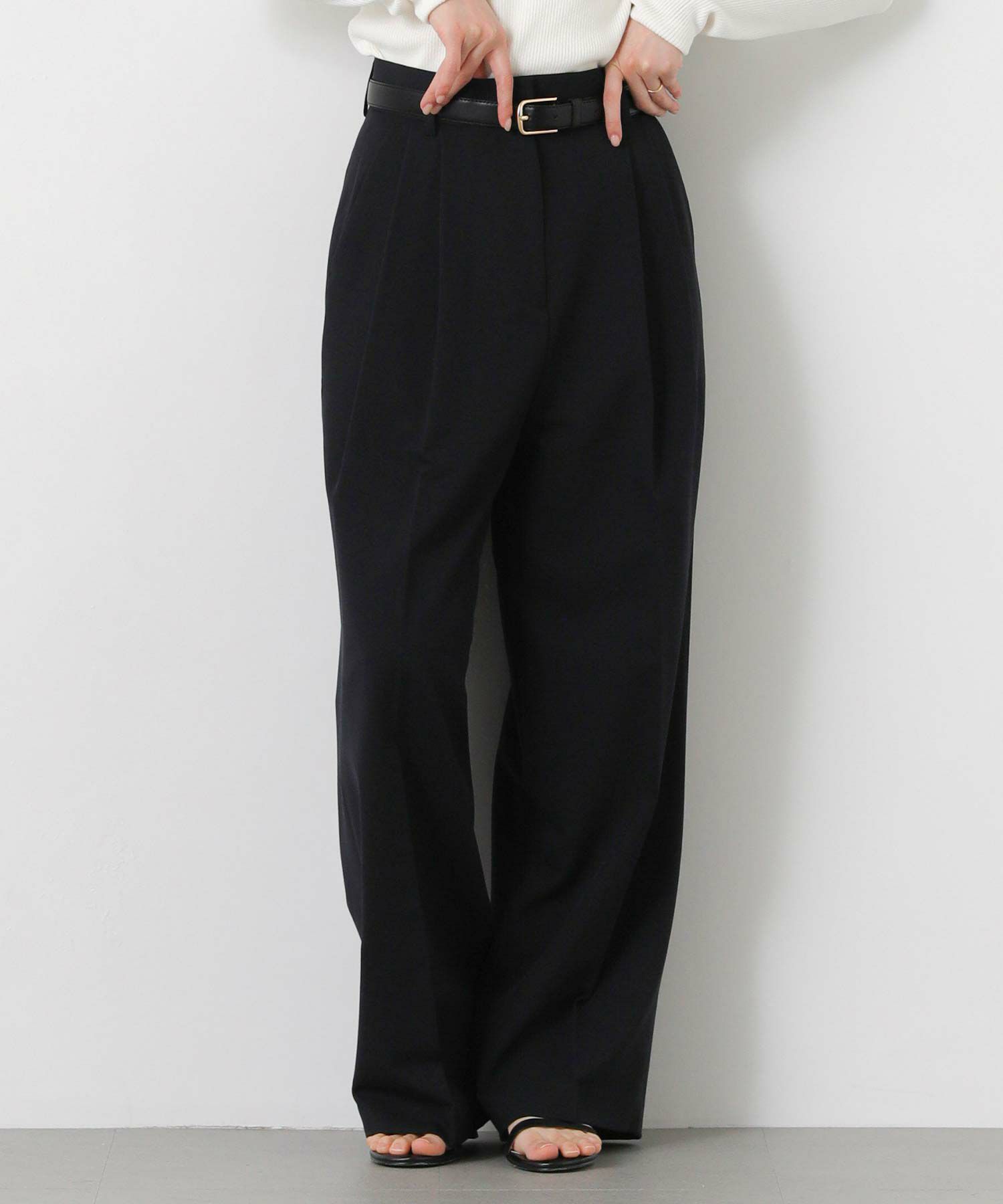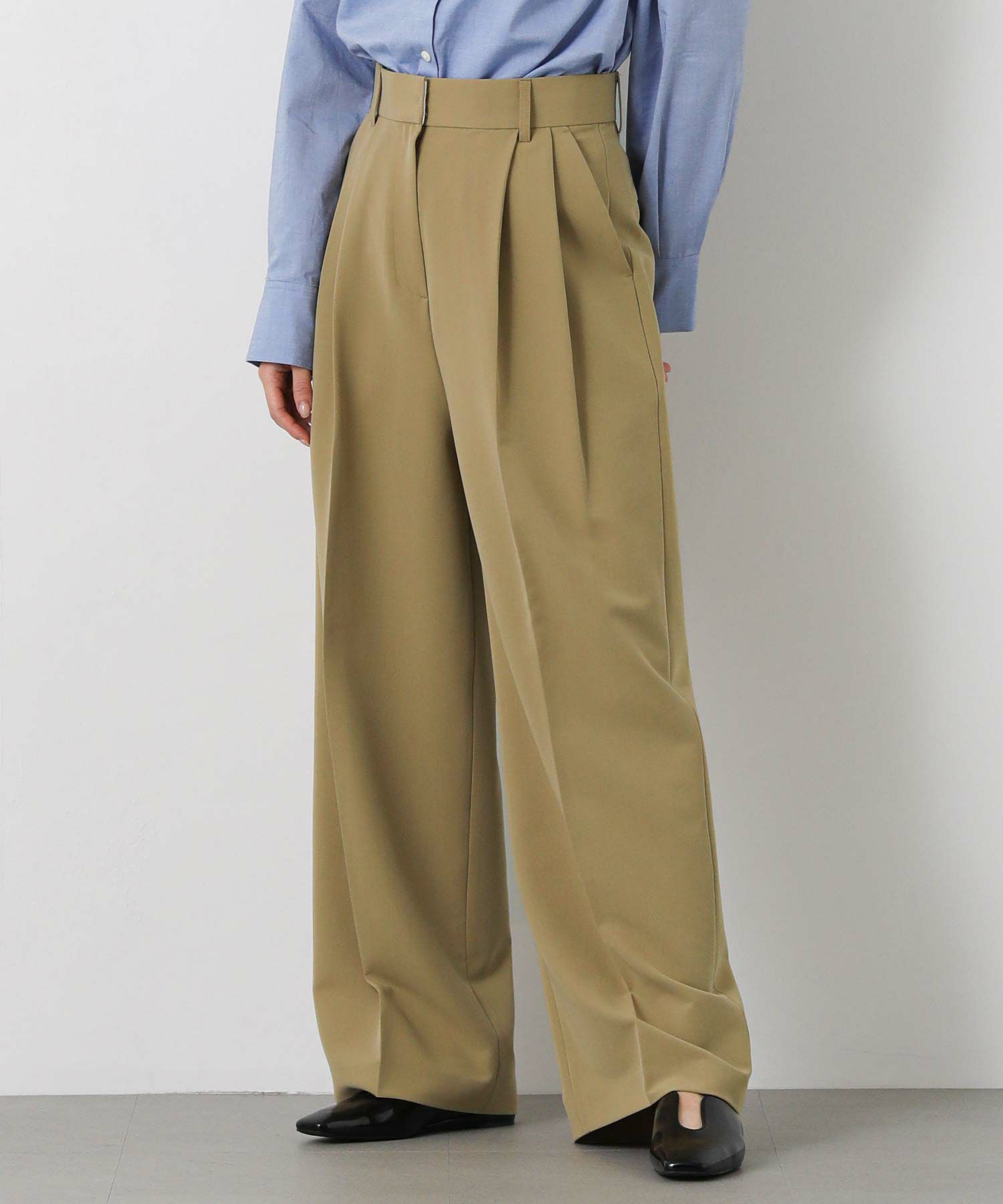 ジャストウエスト設定で、ウエストをすっきりと見せてくれる2タックデザインと、脚のラインを拾いすぎないストレートシルエットに拘った1本。