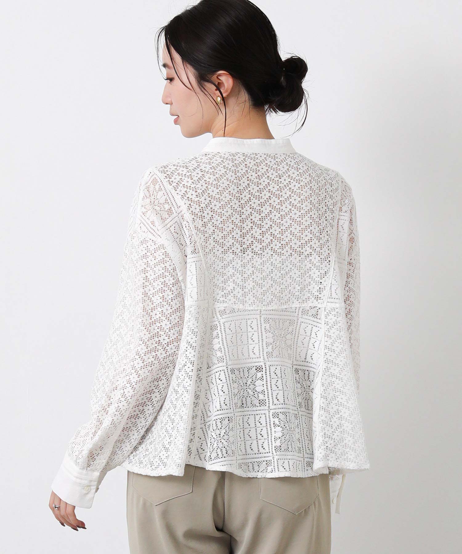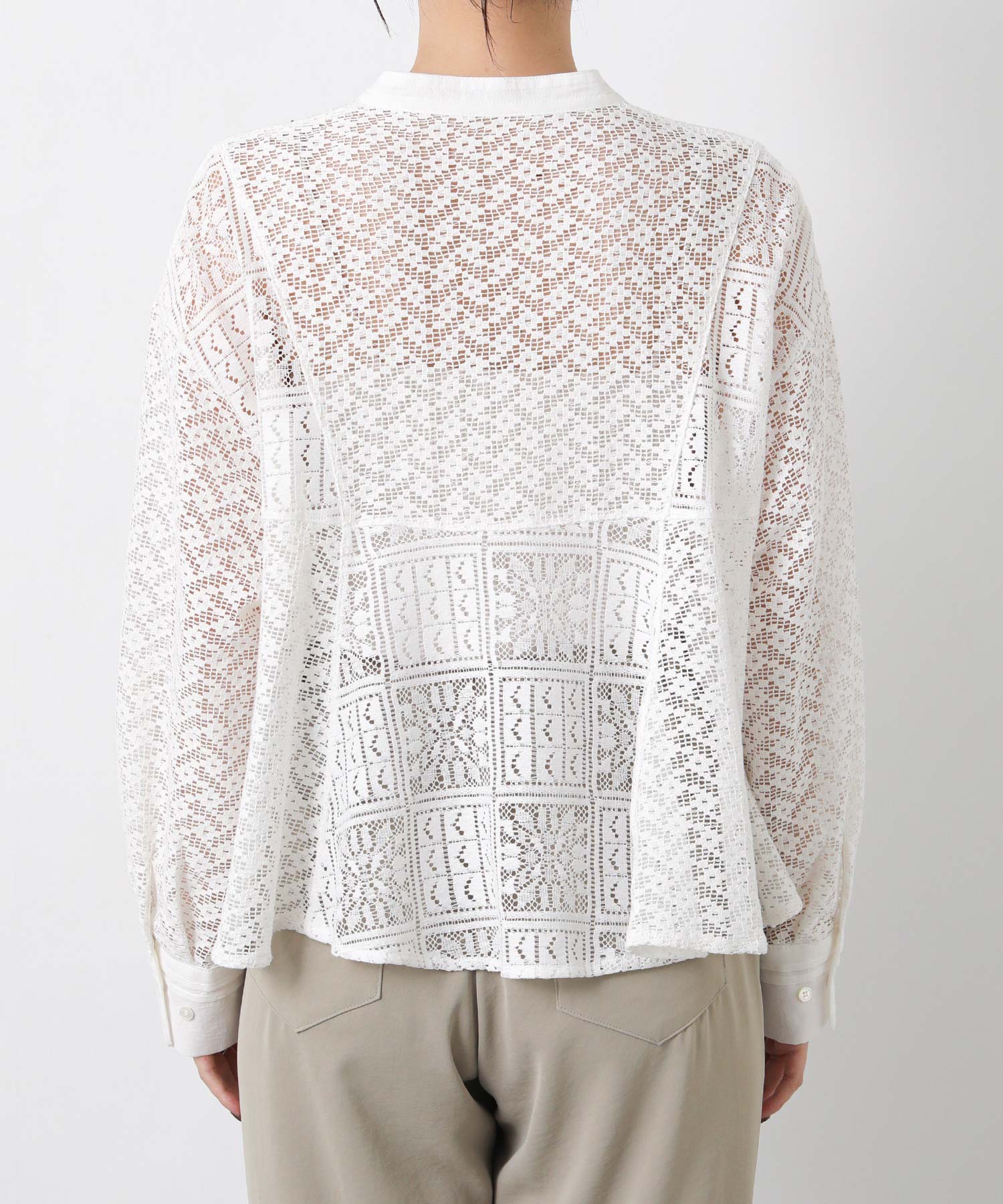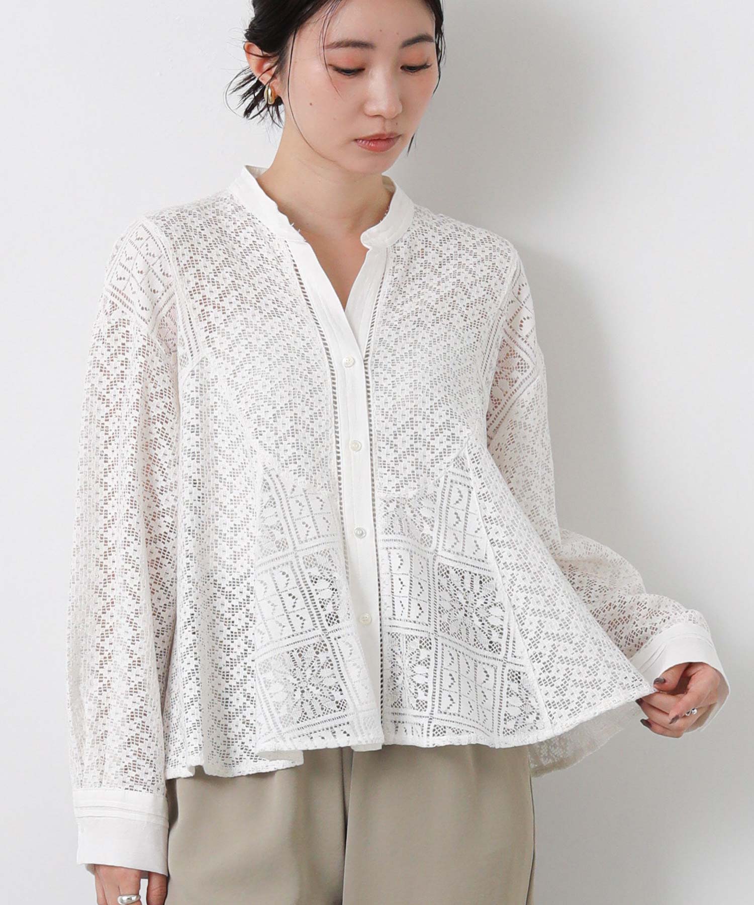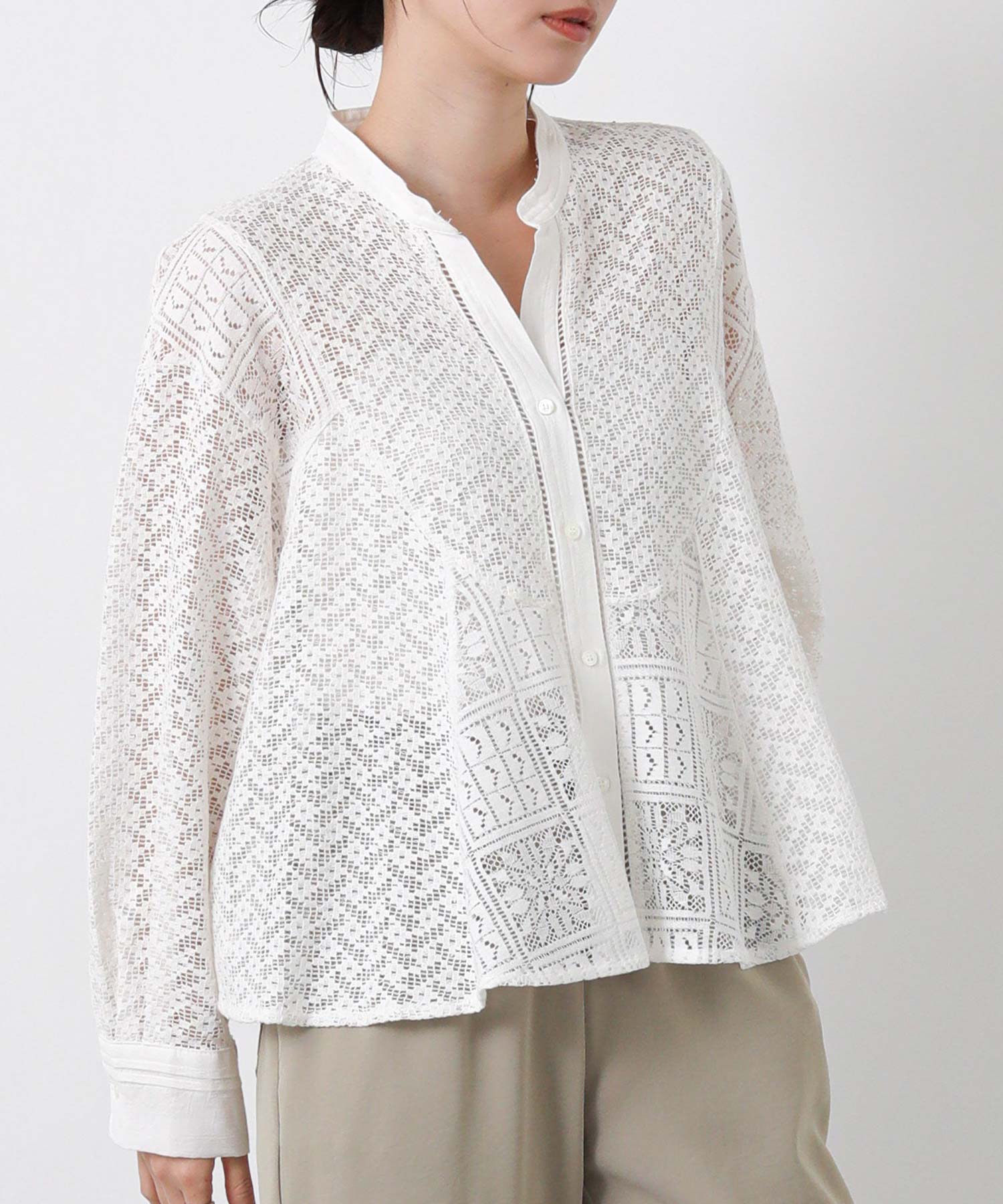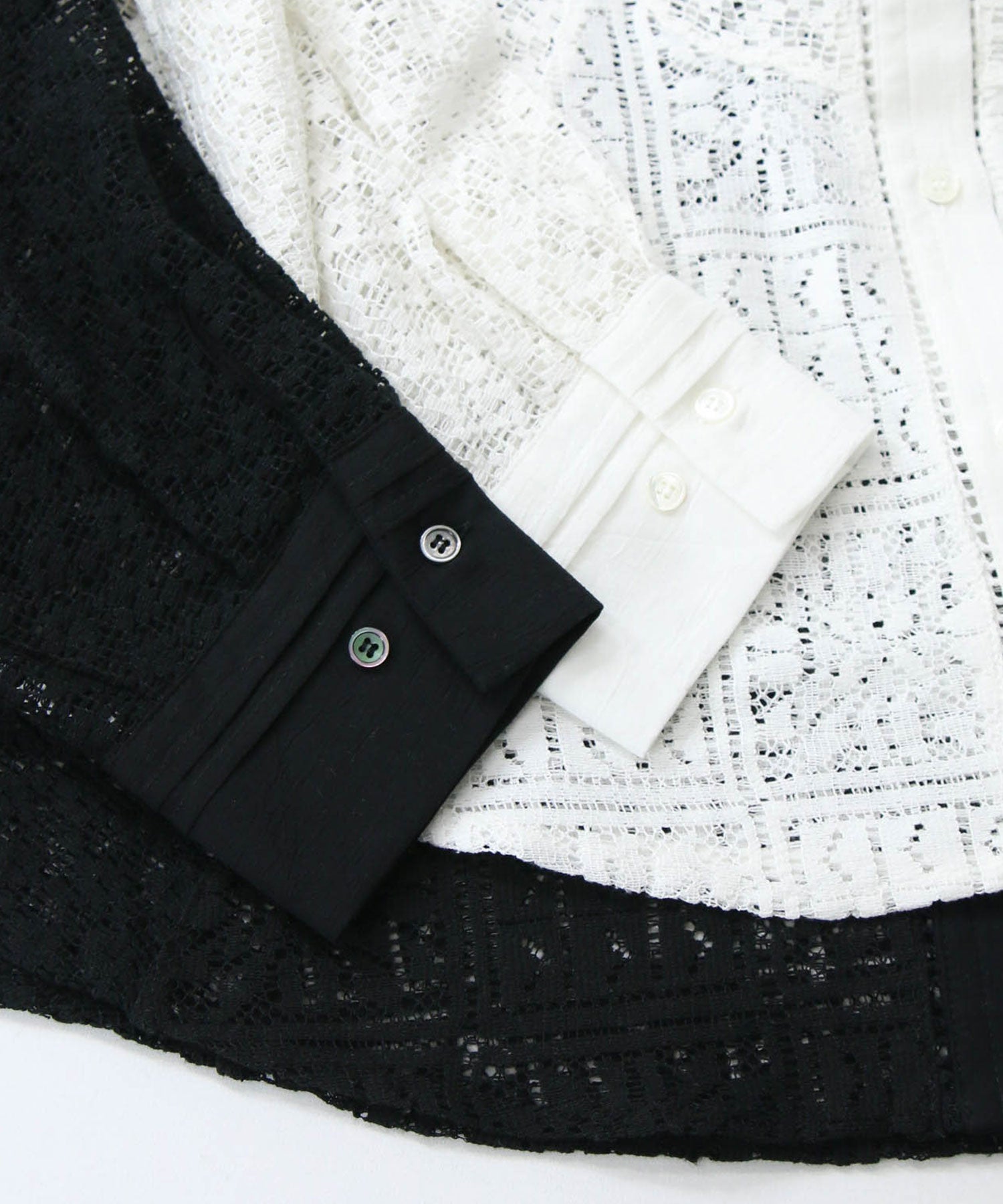 ラフなムードを演出する総レースのシャツは、ジオメトリックなレースとパッチワーク風のレースを切り替えたクラフト感のあるデザイン。