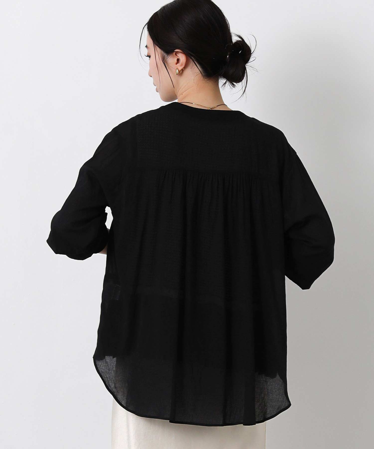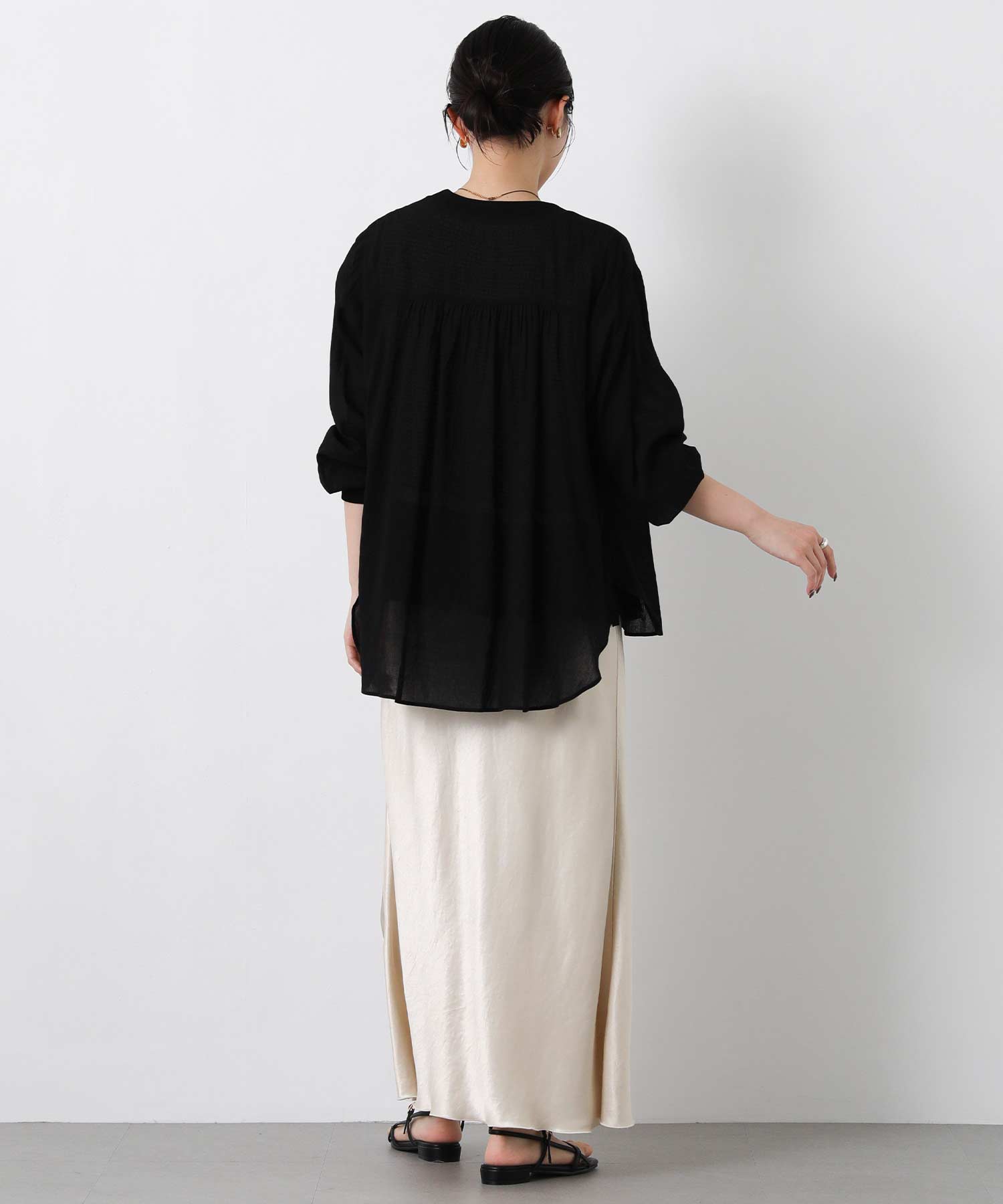 背中にたっぷりとギャザーを寄せ、ゆとりのあるデザイン。 ふんわり広がるシルエットでお尻周りもカバーできます。