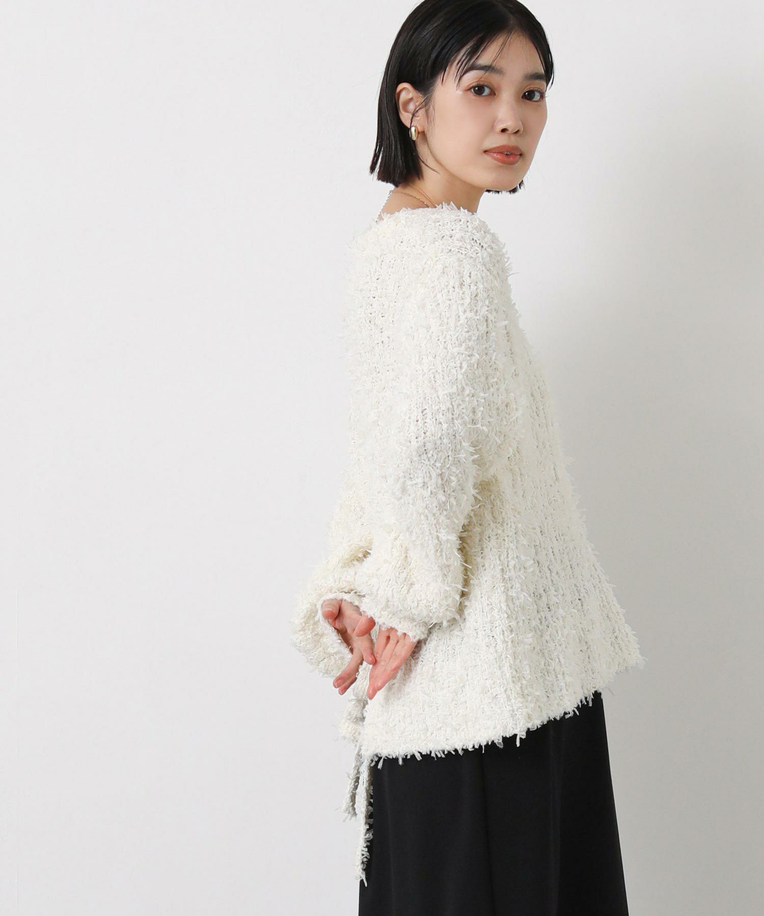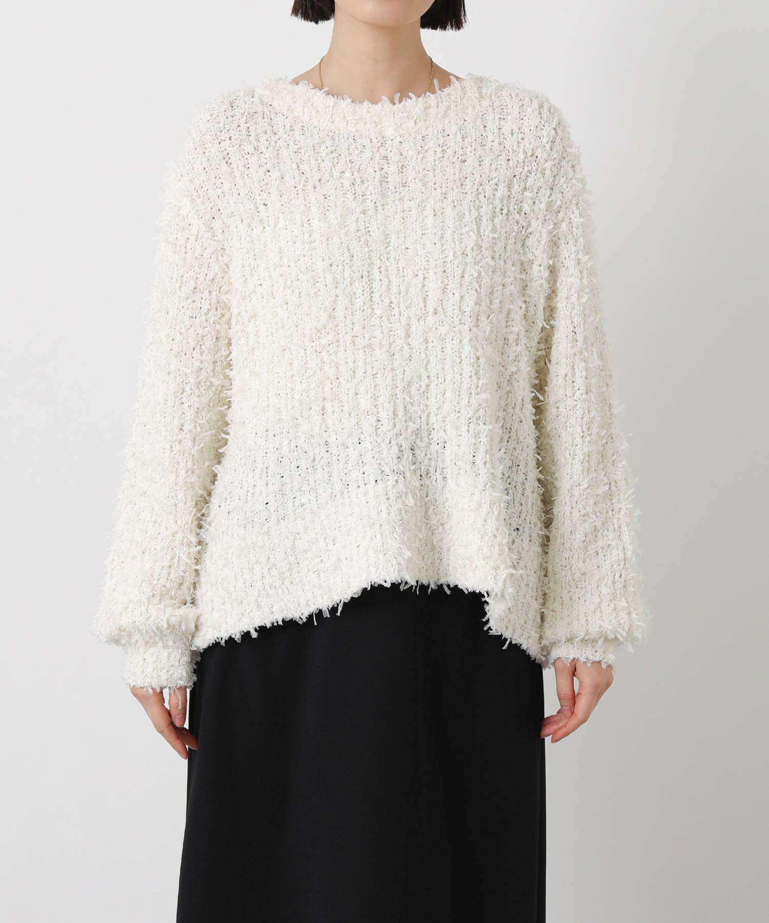 ひらひらとふんわり揺れるチュールのファンシーヤーンのメッシュ編みのニットプルオーバー。