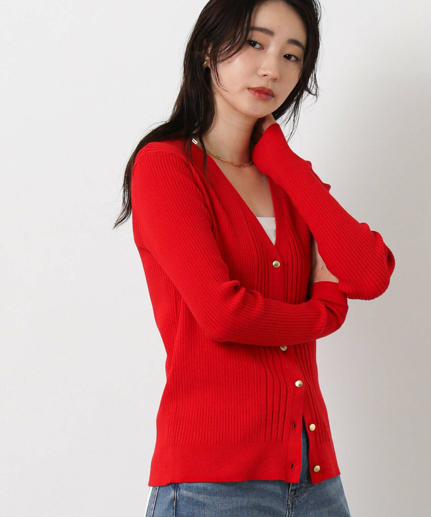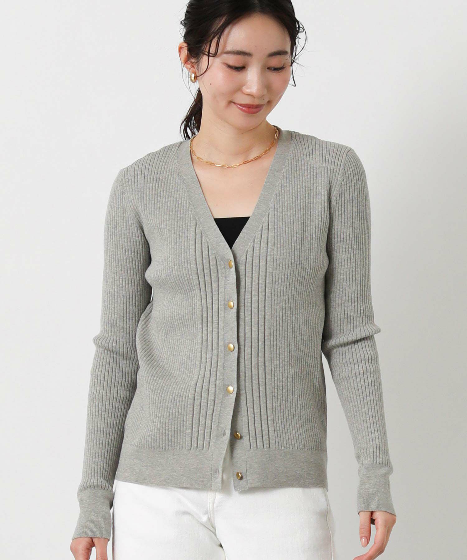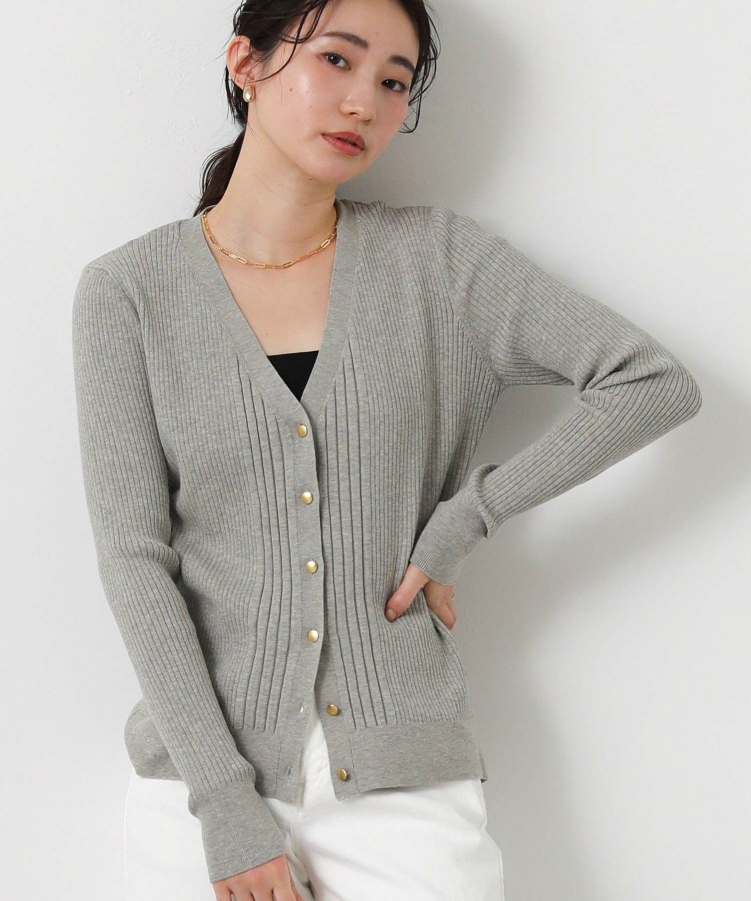 羽織としても、ボタンを止めてタンクやキャミと合わせてプルオーバーのようにした着こなしもオススメ。