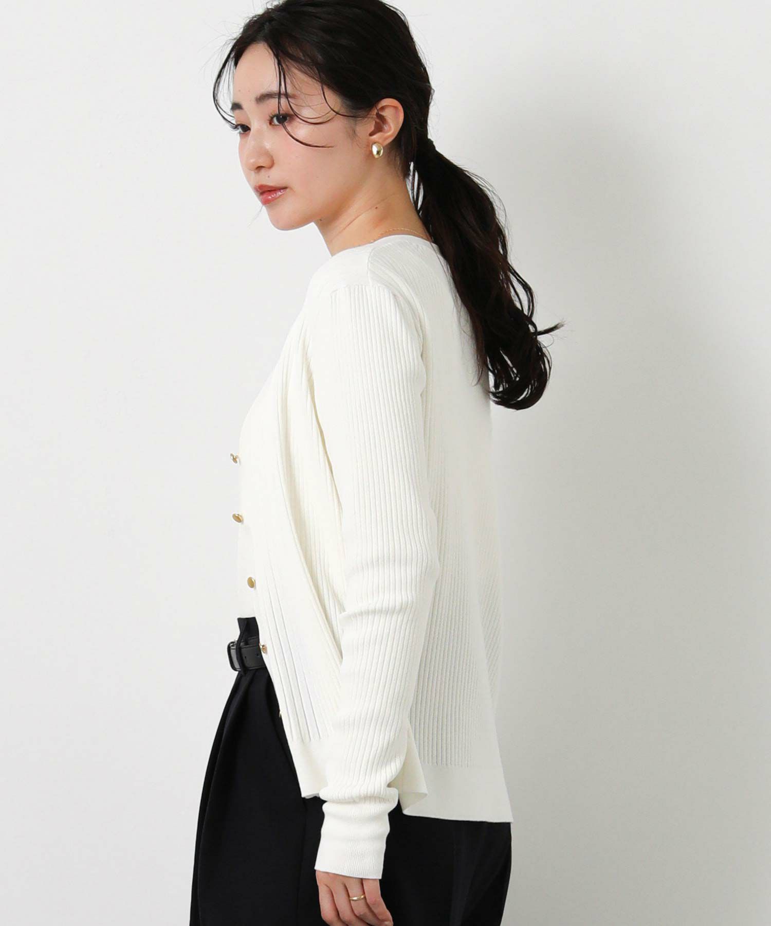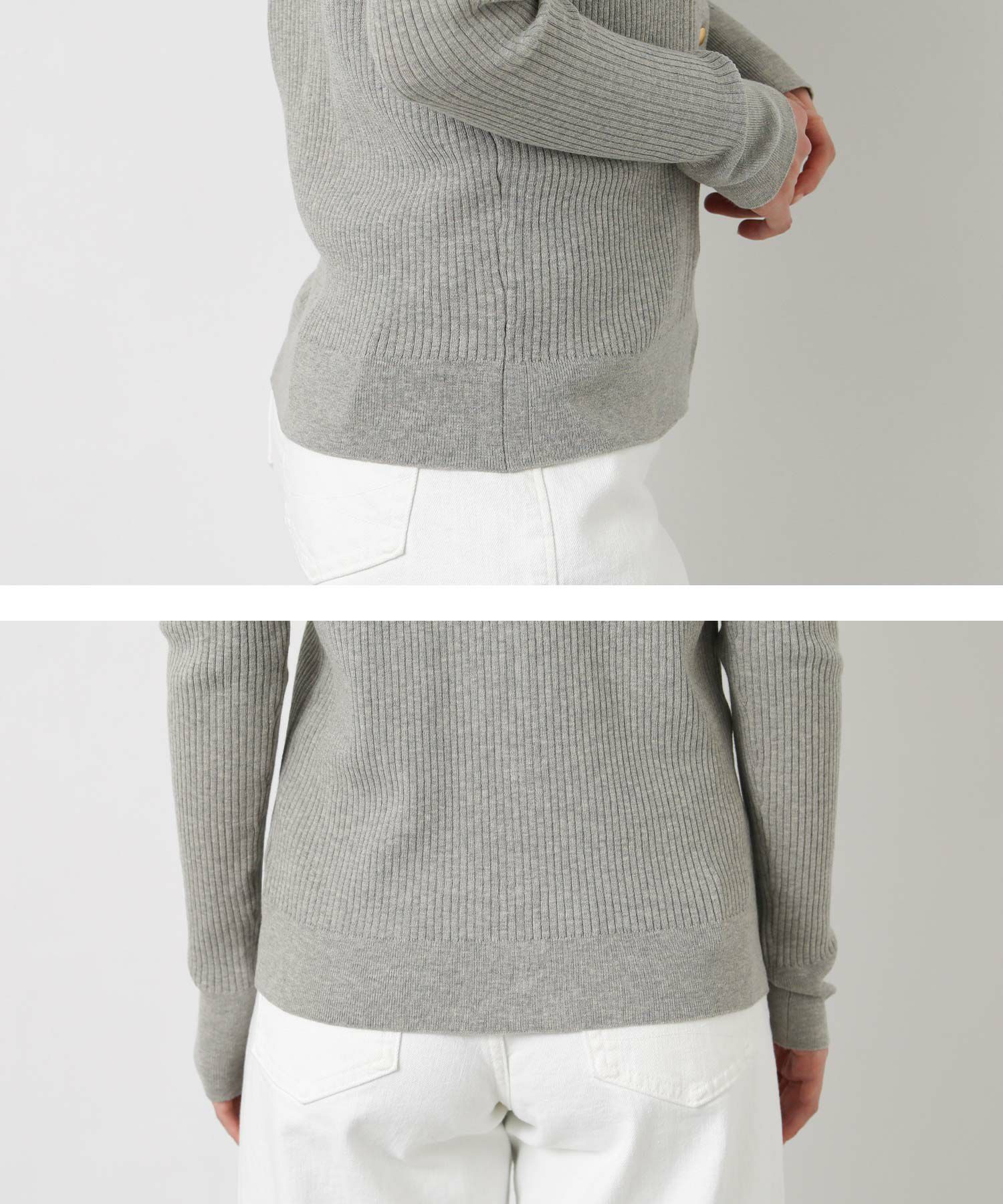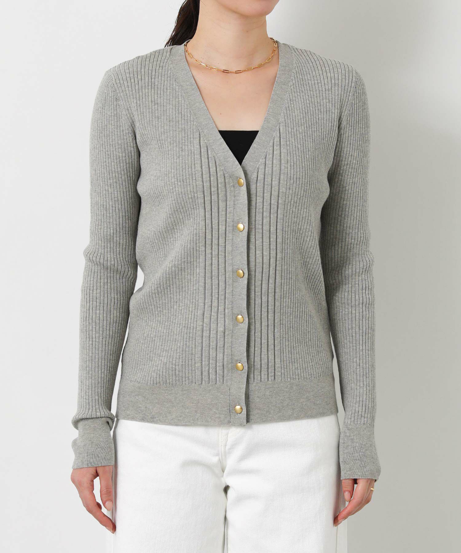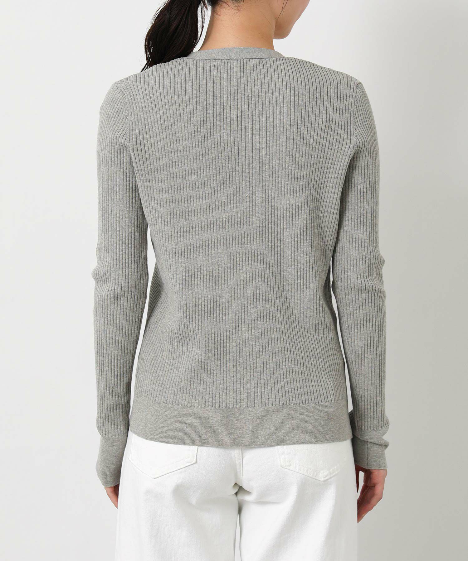 シャリ感のあるサラサラとした肌触りの綿混の糸を使用したリブカーデ。