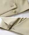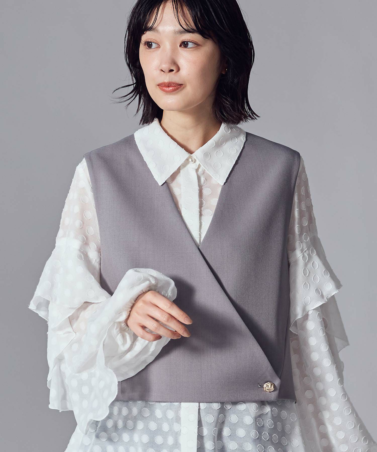 カシュクールのV開きが顔周りをスッキリ見せてくれ、ゴールドの釦がアクセントに。