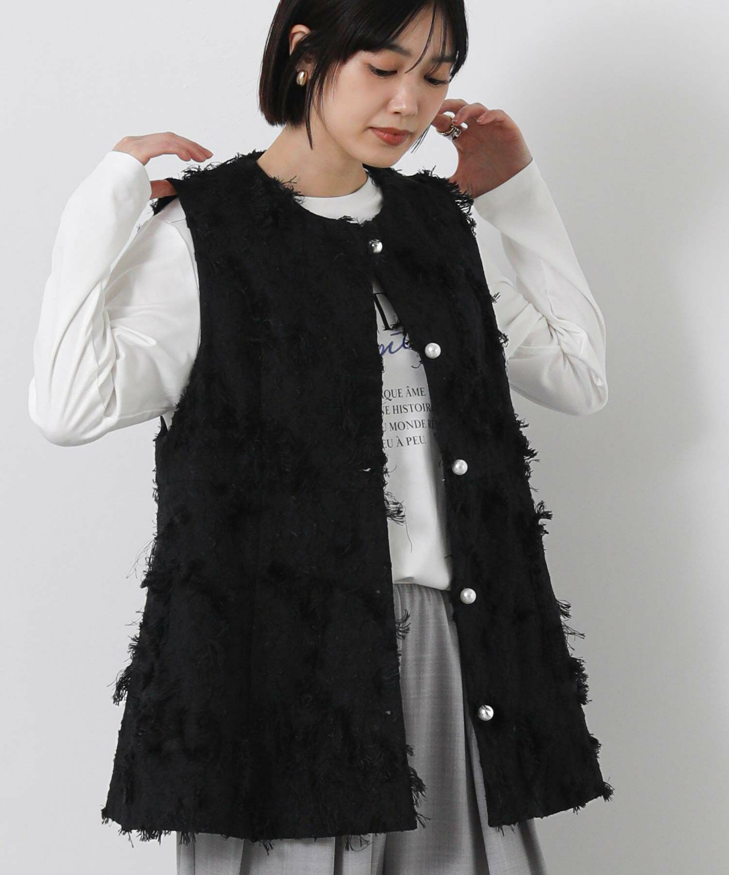大き目のパール釦が、コーデに華やかさをプラスしてくれます。