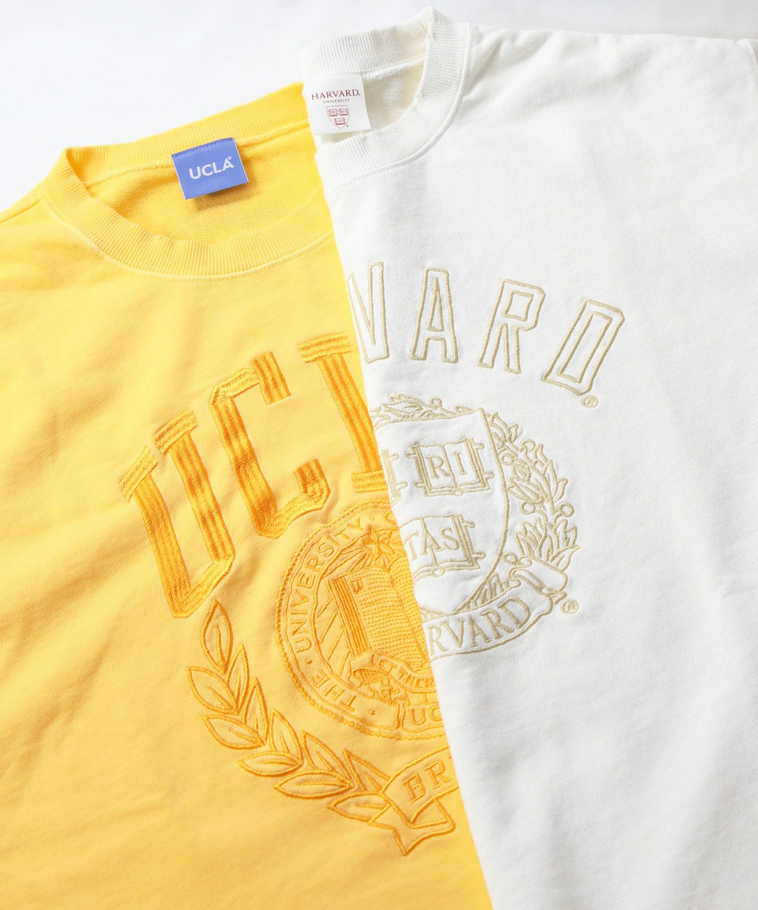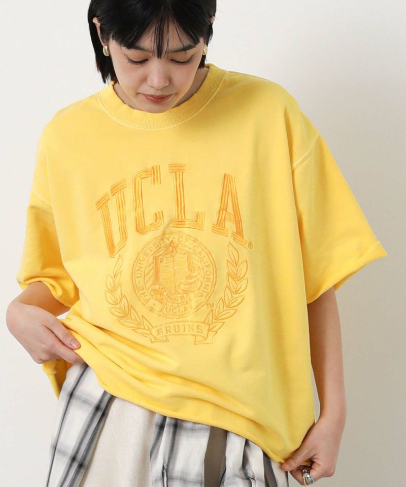 1919年に設立されたUCLA(カリフォルニア州立大学ロサンゼルス校)の定番のカレッジロゴを刺繍し、その後にピグメント染めをして、リメイク古着のように仕上がっています。