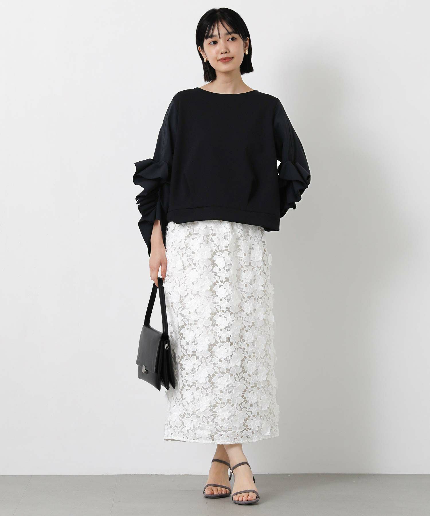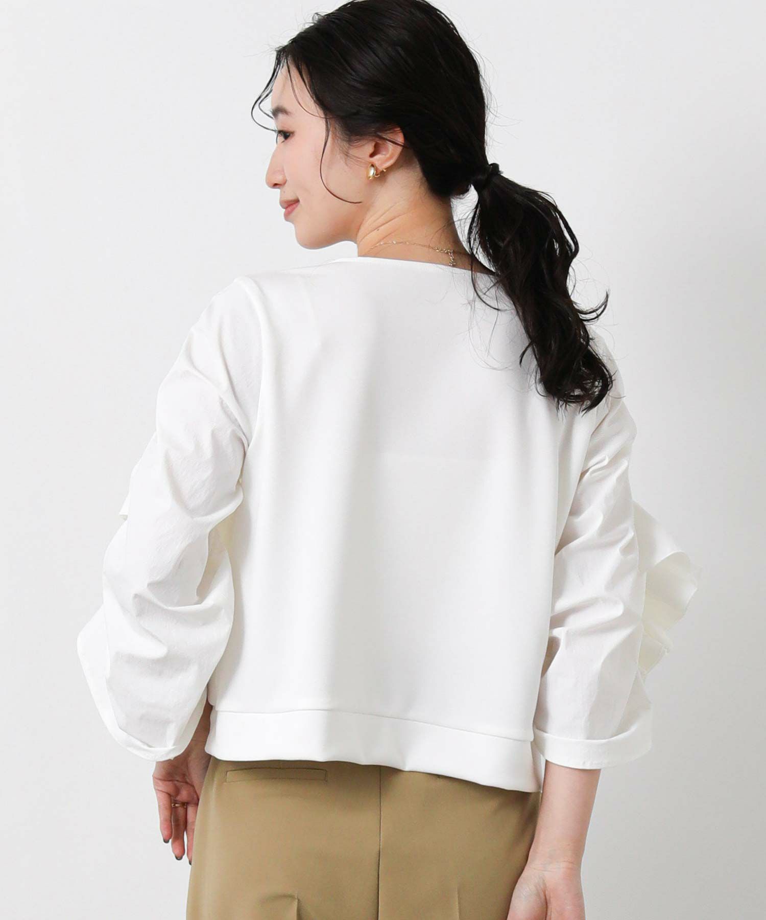 ボリュームのあるフリルが視線を上に集め、自然と腕を細く見せる効果も。
