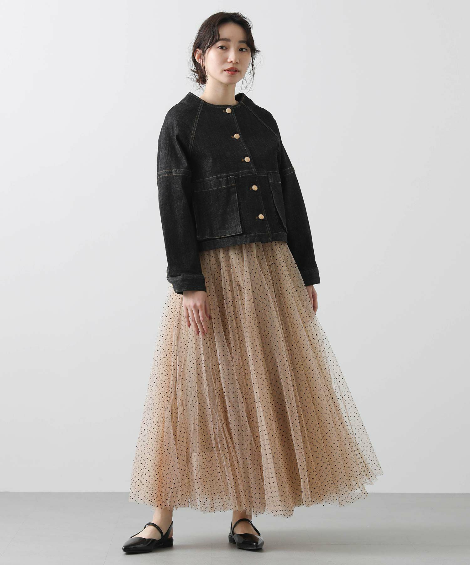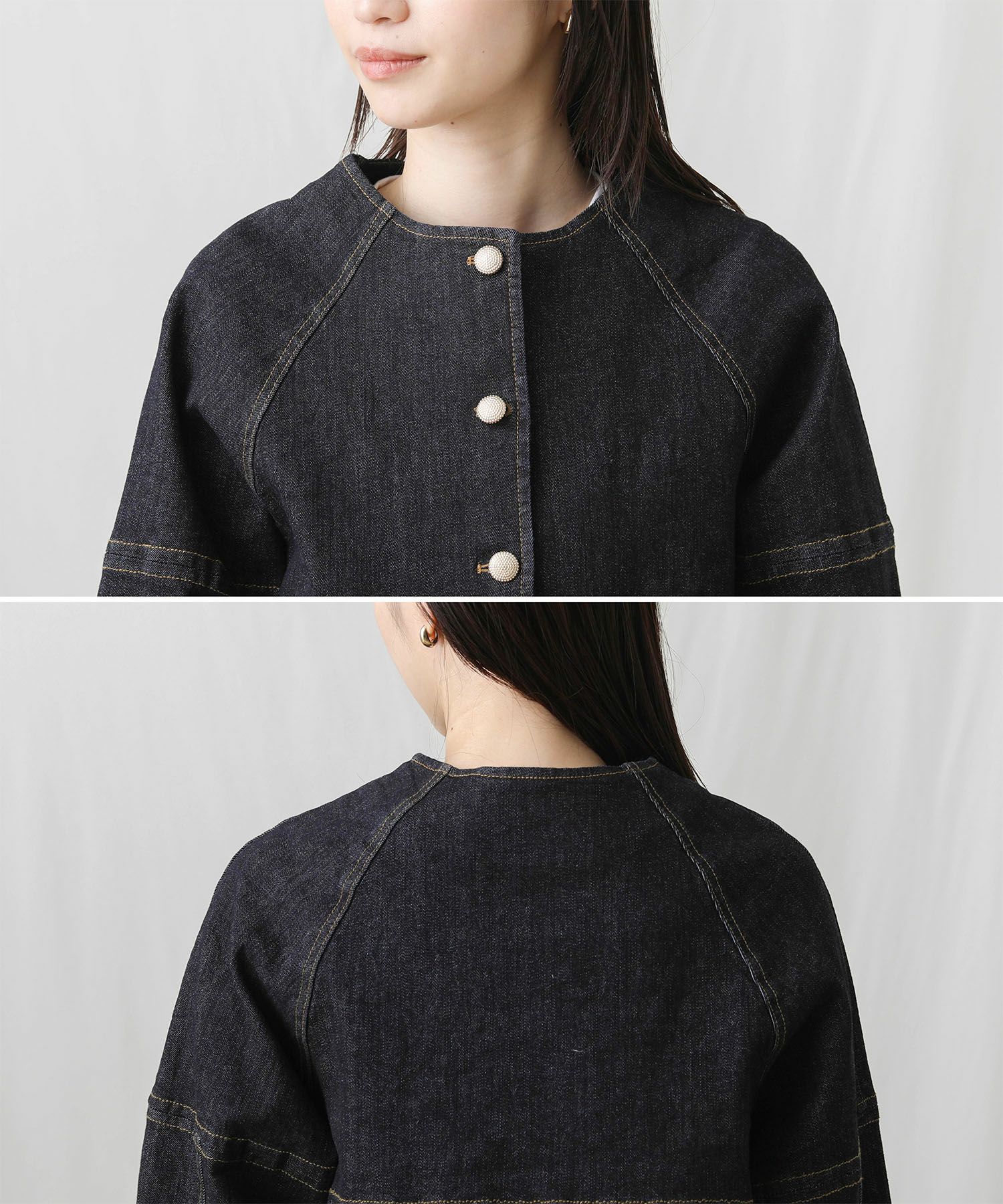 デニムのカジュアル感を楽しみつつ、女性らしい着こなしにもマッチするノーカラーデニムジャケット。