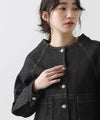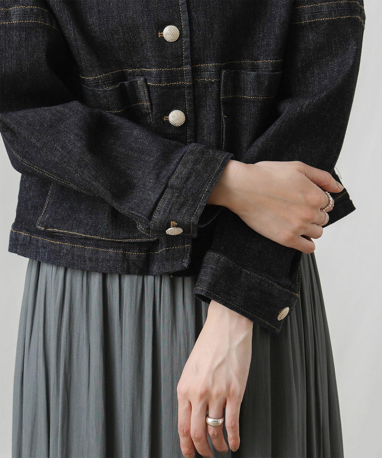 デニムのカジュアル感を楽しみつつ、女性らしい着こなしにもマッチするノーカラーデニムジャケット。