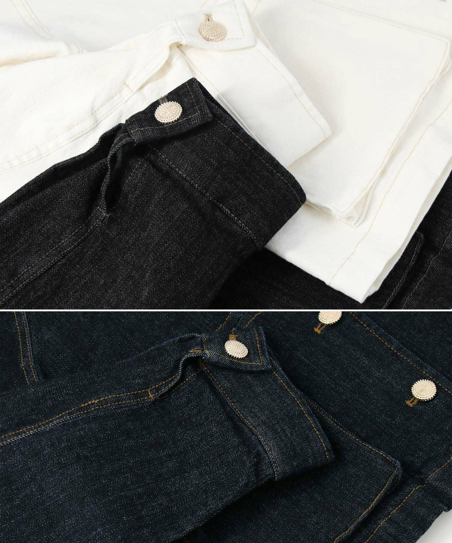 存在感のあるゴールド釦や配色ステッチがポイントでシンプルになり過ぎず、ストレッチが効いているので着心地も◎