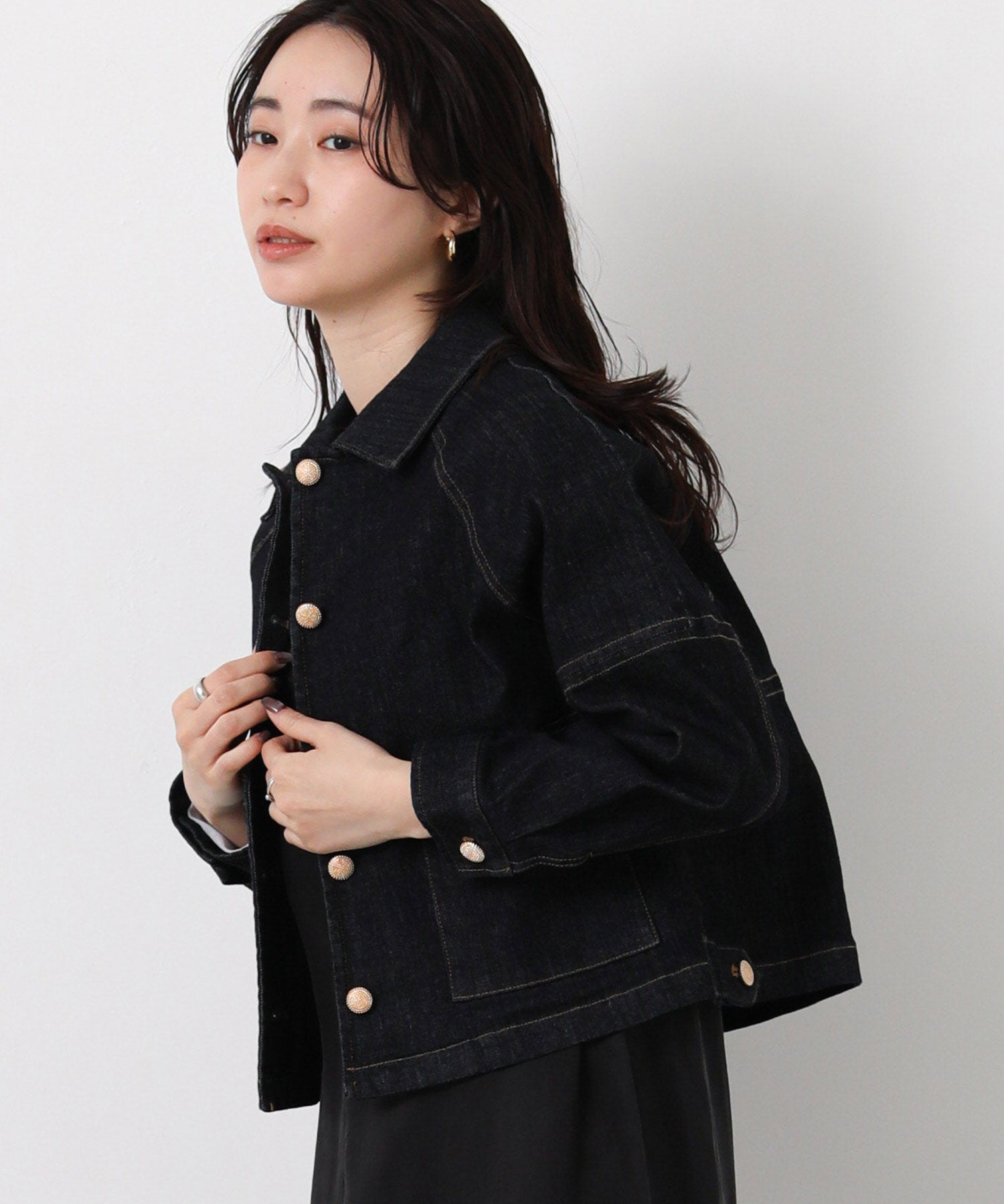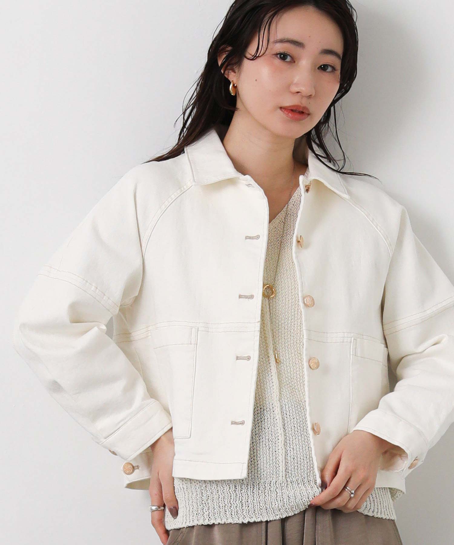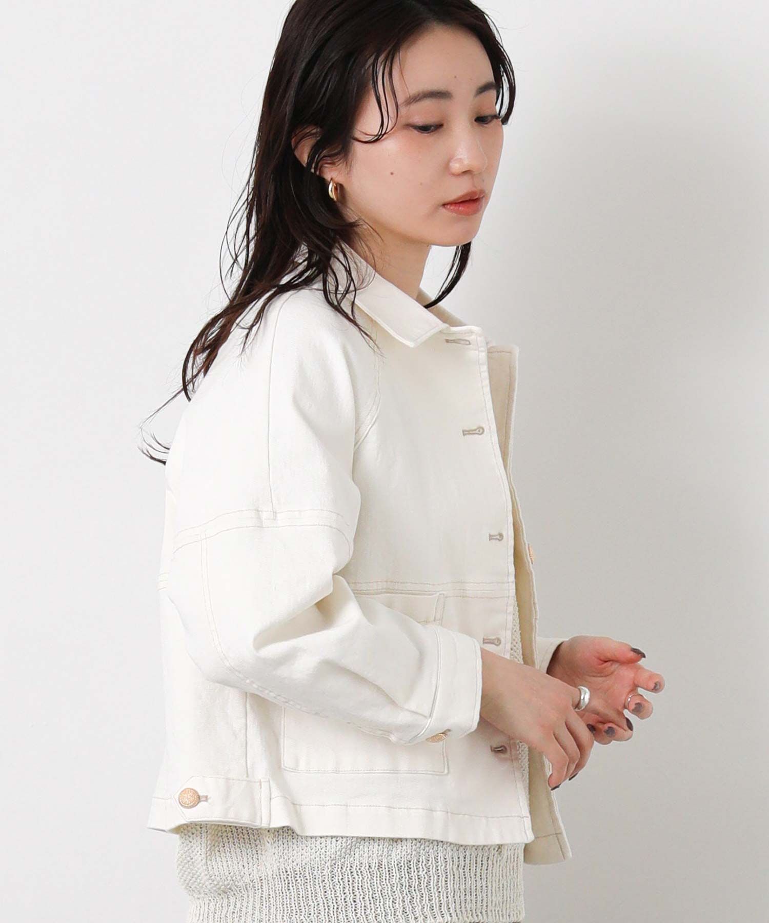 デニムのカジュアル感を楽しみつつ、女性らしい着こなしにもマッチするGジャン。襟付きだと、前を開けて着た時にサマになります。存在感のあるゴールド釦や配色ステッチがポイントでシンプルになり過ぎず、ストレッチが効いているので着心地が良いのも特徴です。