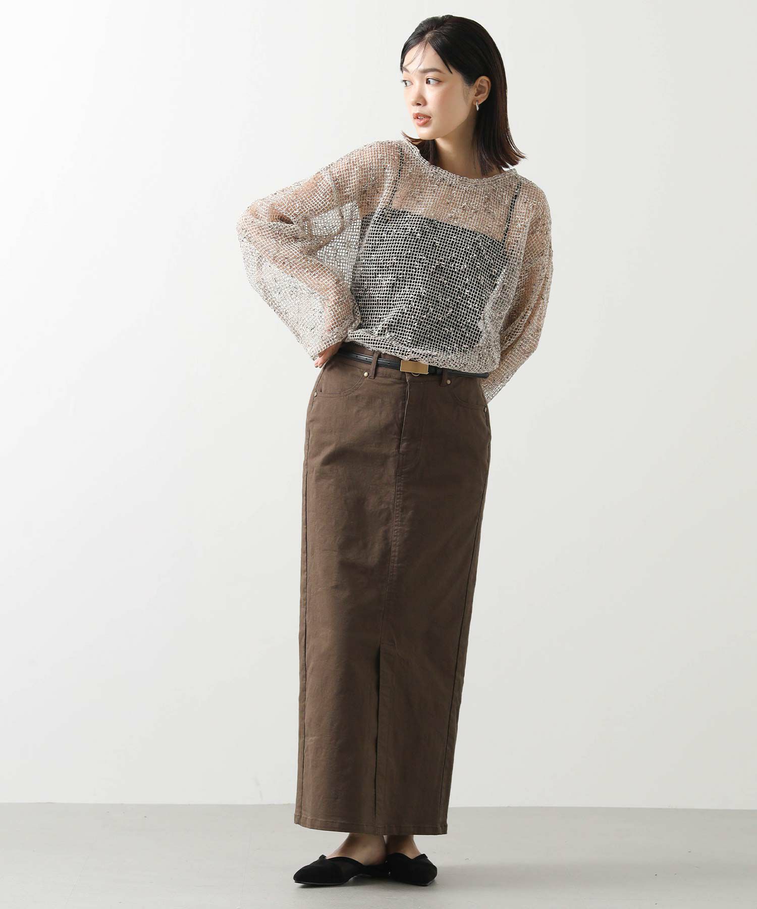 スカートやパンツはもちろん、ワンピースやジレ、ニットカーディガンの上から付けてウエストマークするのもオススメ。