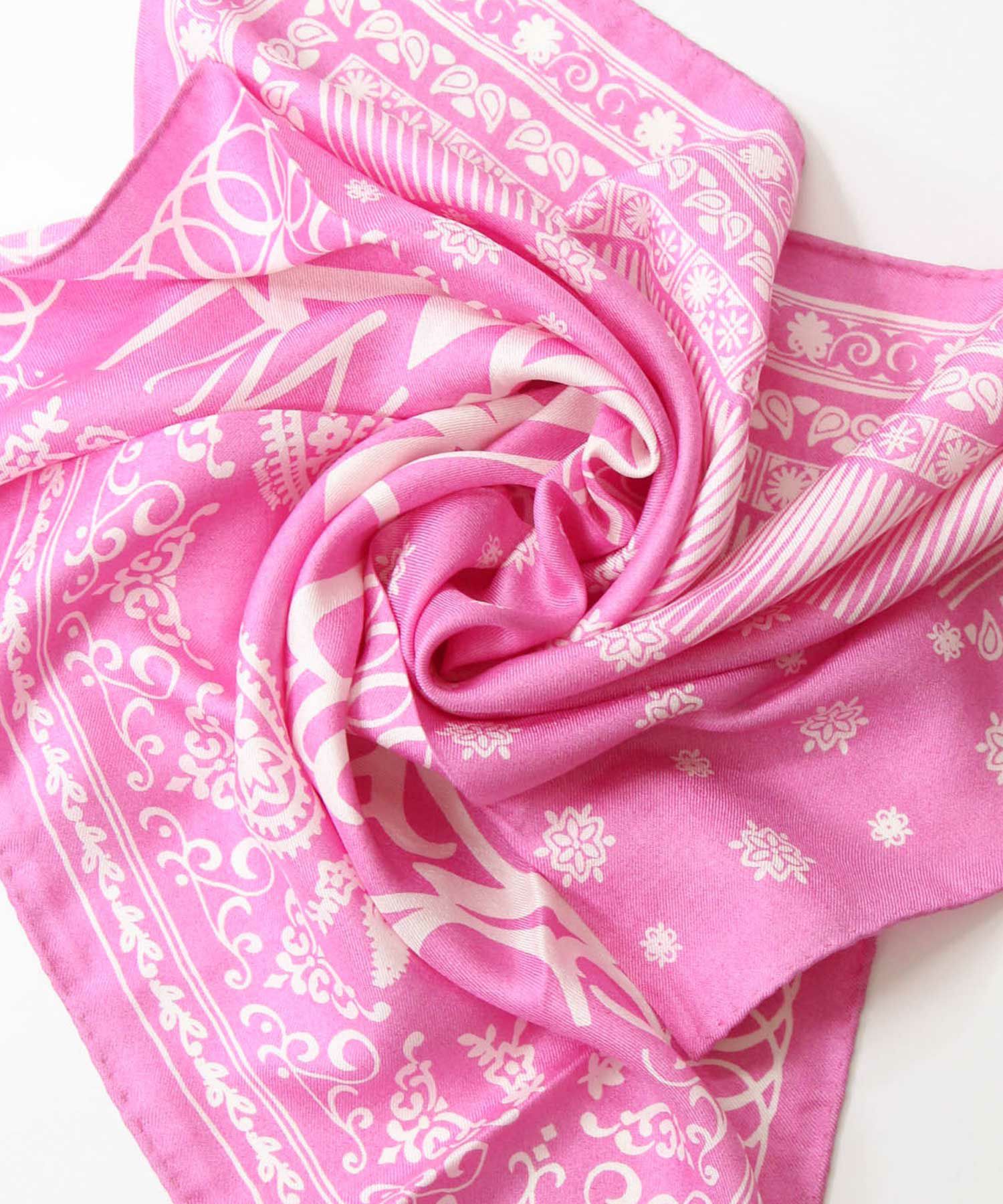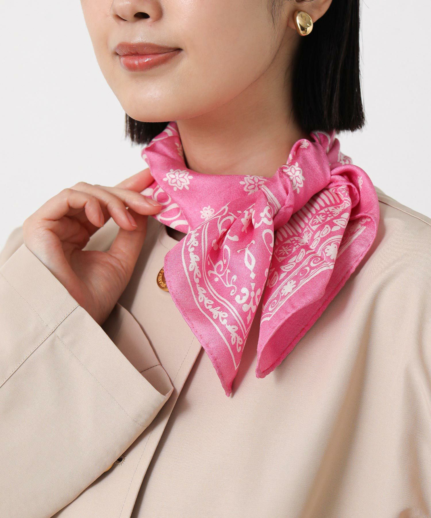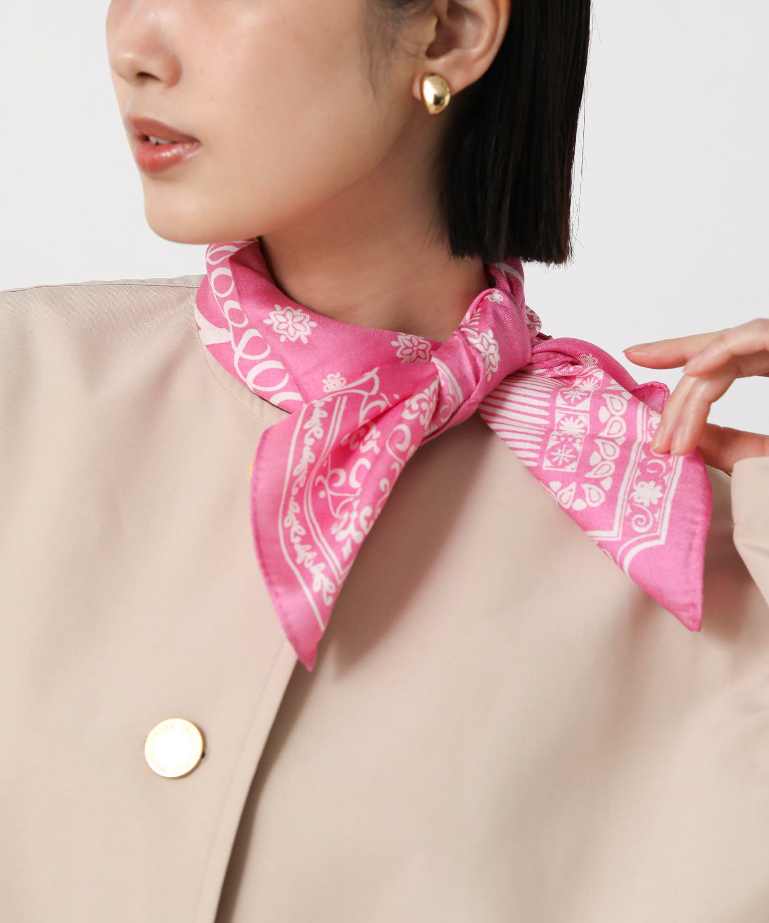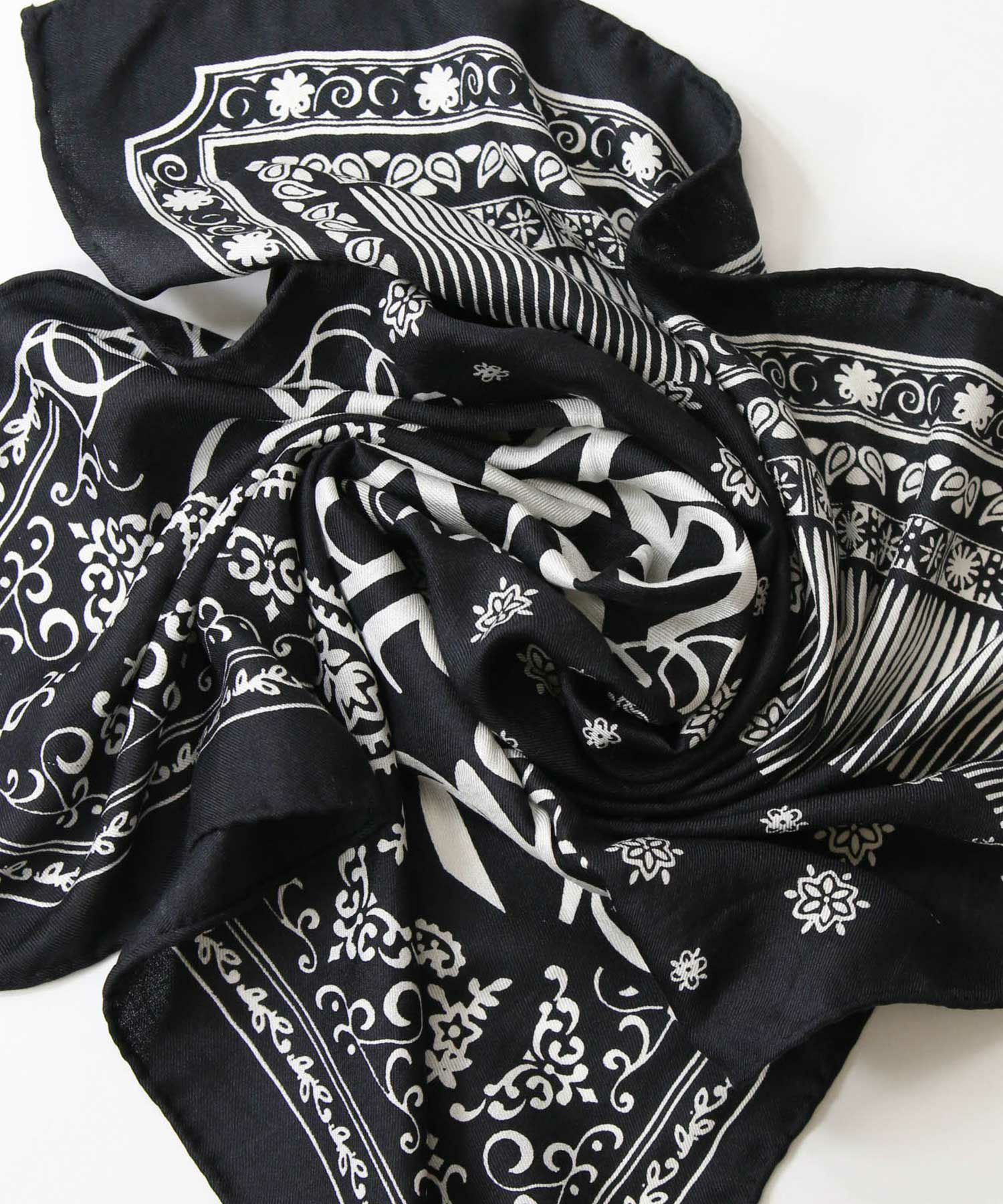 ラフなタッチで描かれたペイズリーやオリエンタルな柄がキャッチーで、スタイリングのポイントになるスカーフ。