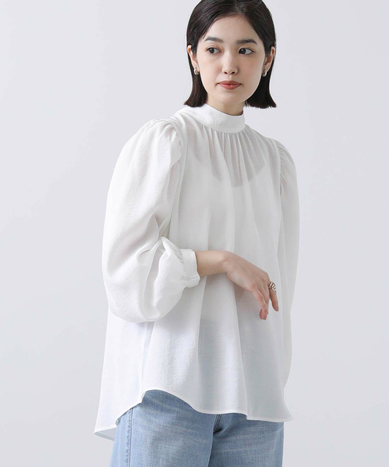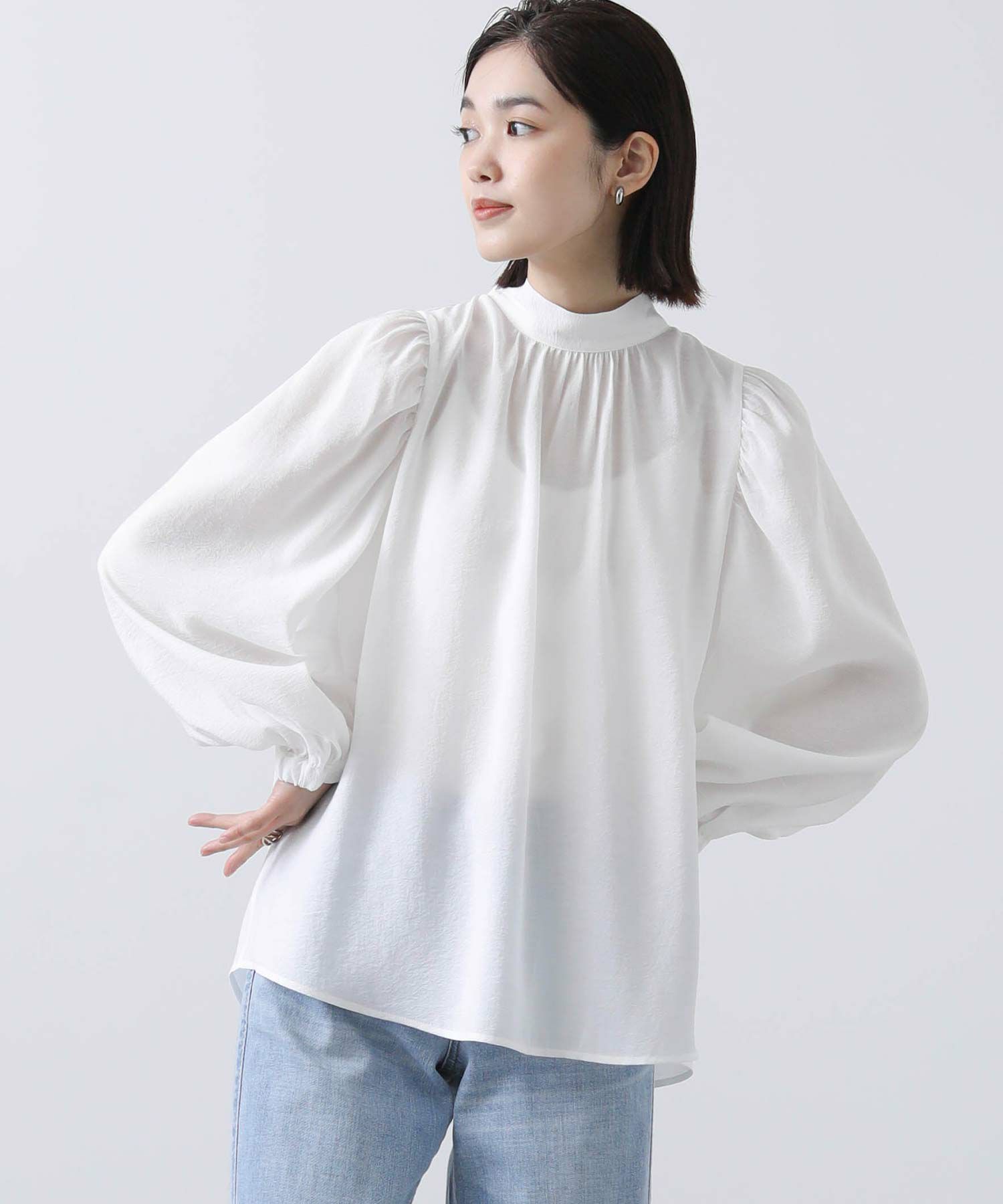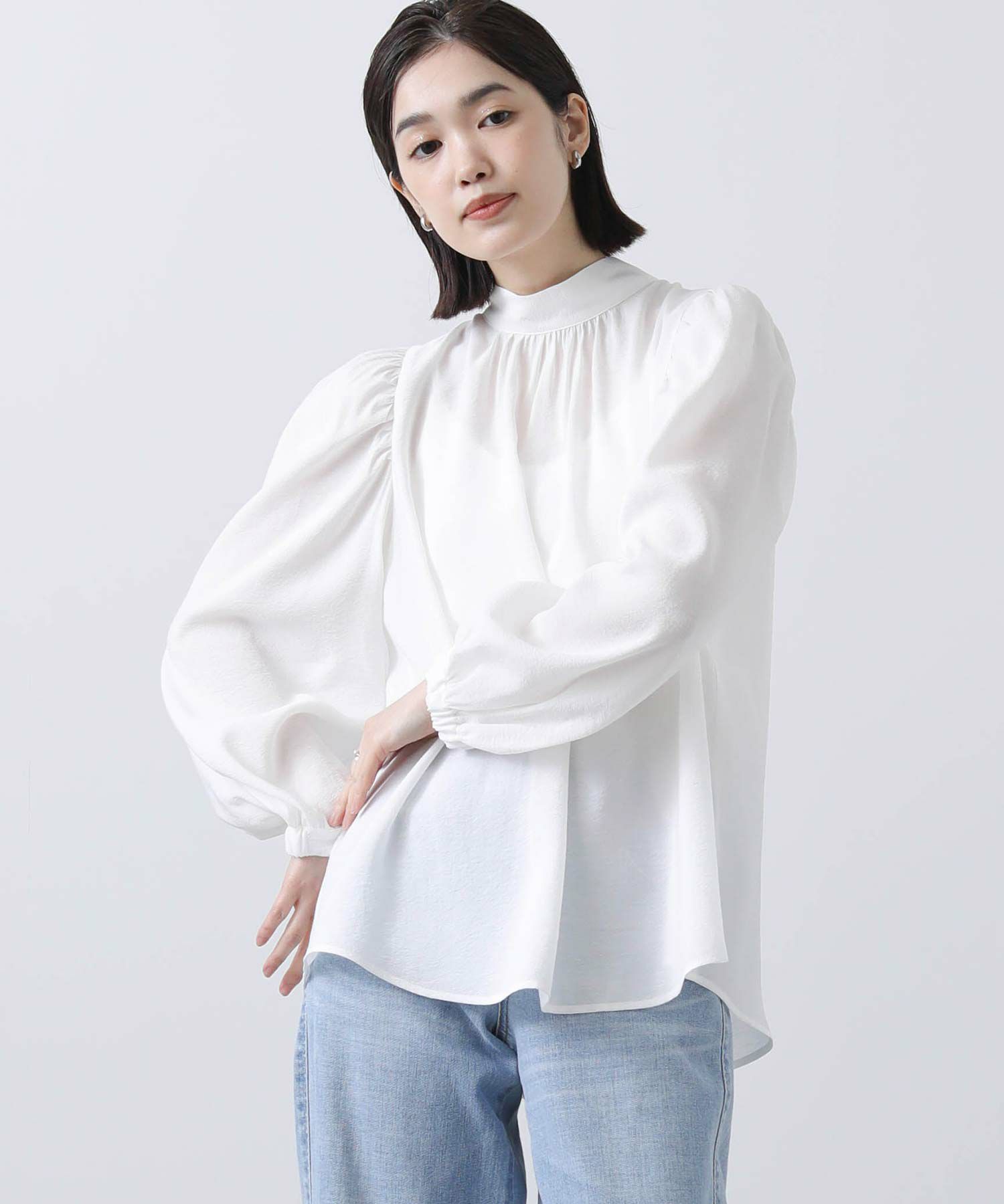 肩幅をコンパクトにデザインし、ギャザ-でたっぷりと分量をだしたパフスリーブがフェミニンさをプラスし大人かわいい装いに。