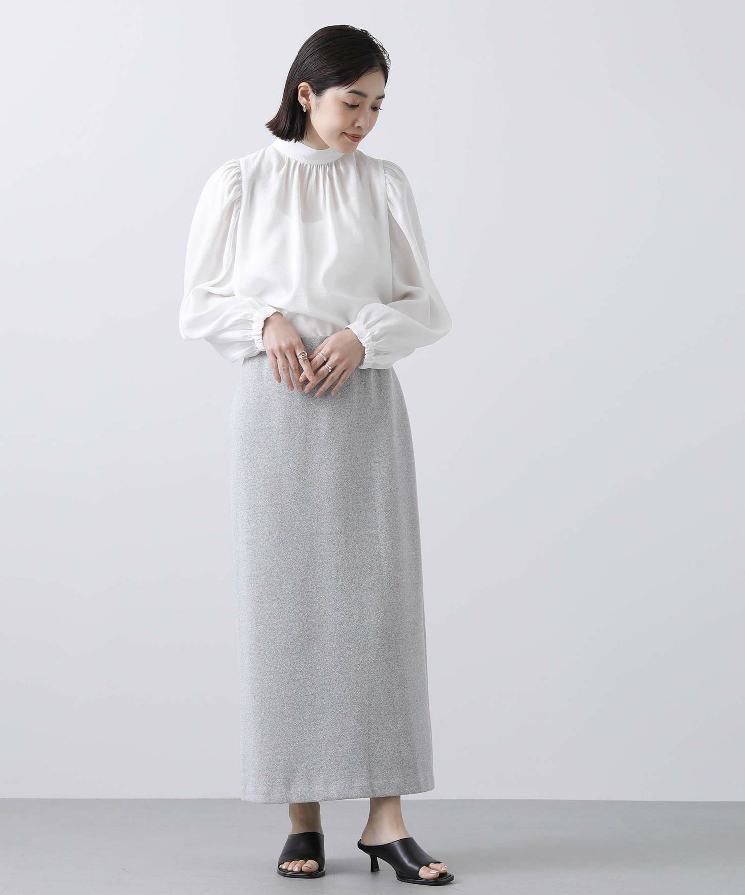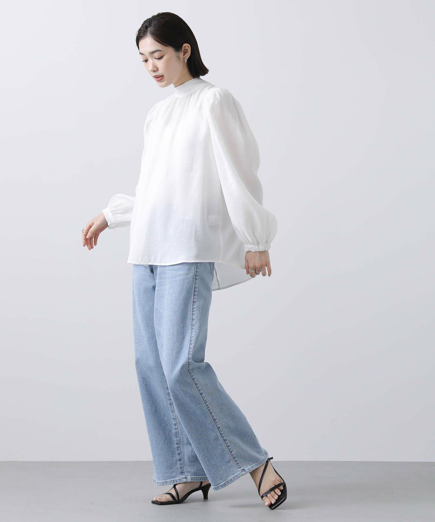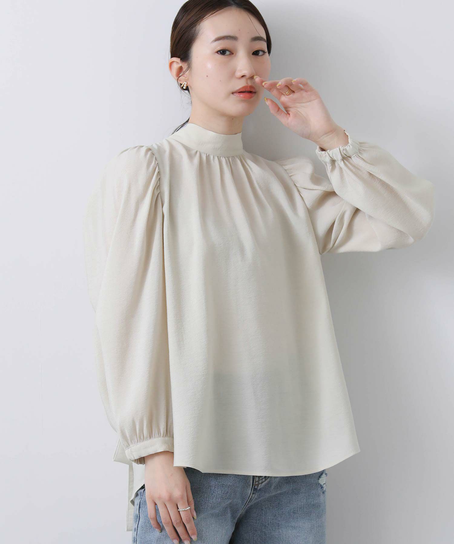 肩幅をコンパクトにデザインし、ギャザ-でたっぷりと分量をだしたパフスリーブがフェミニンさをプラスし大人かわいい装いに。
