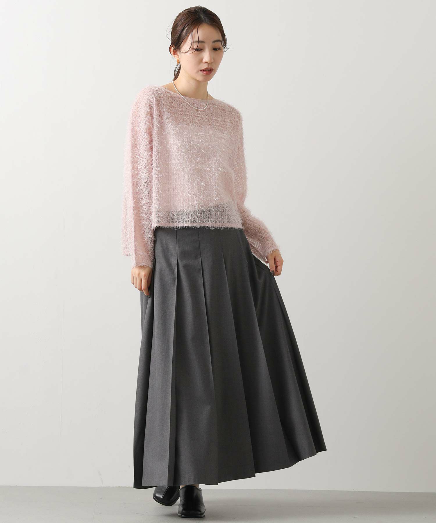幅広のプリーツがクラシカルなムードに、広がりすぎないので子供っぽくならず、大人の女性も取り入れやすいシルエット。