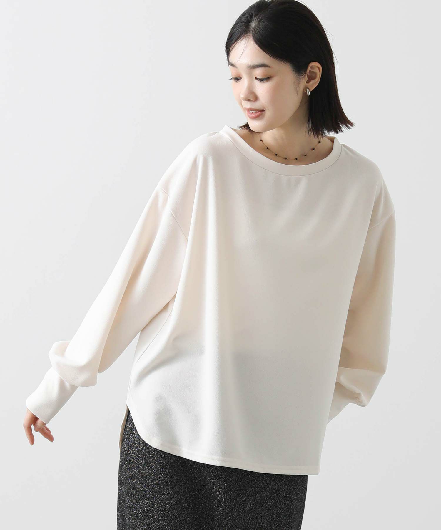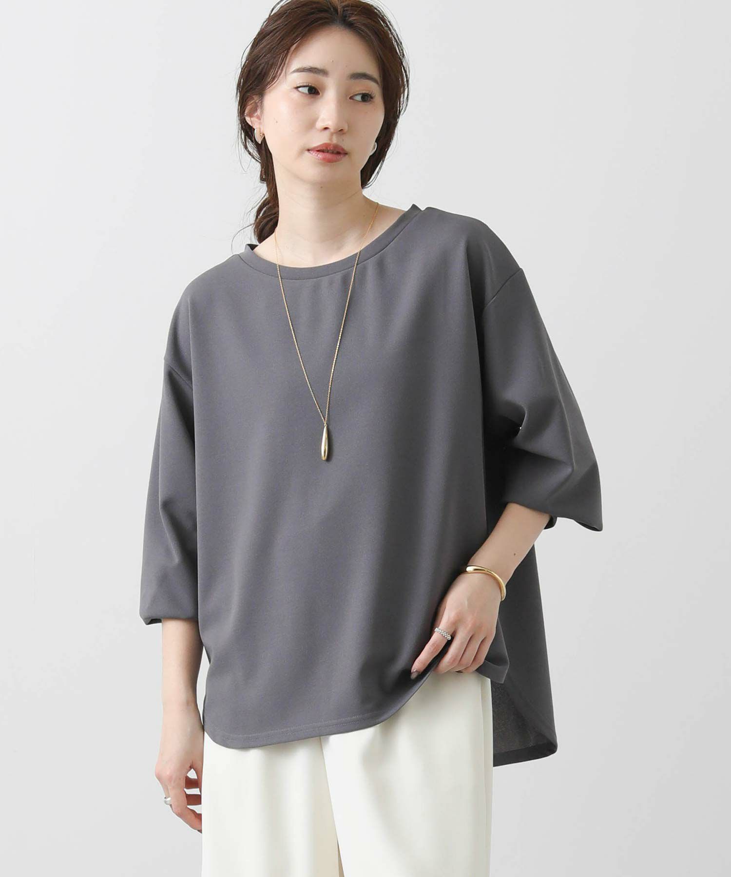 伸縮性のある着心地なので、堅苦しくなく着ていただけます。ボートネックで首回りがキレイに見えるように、裾はラウンドヘムにしてインしなくてもサマになるようにしています。