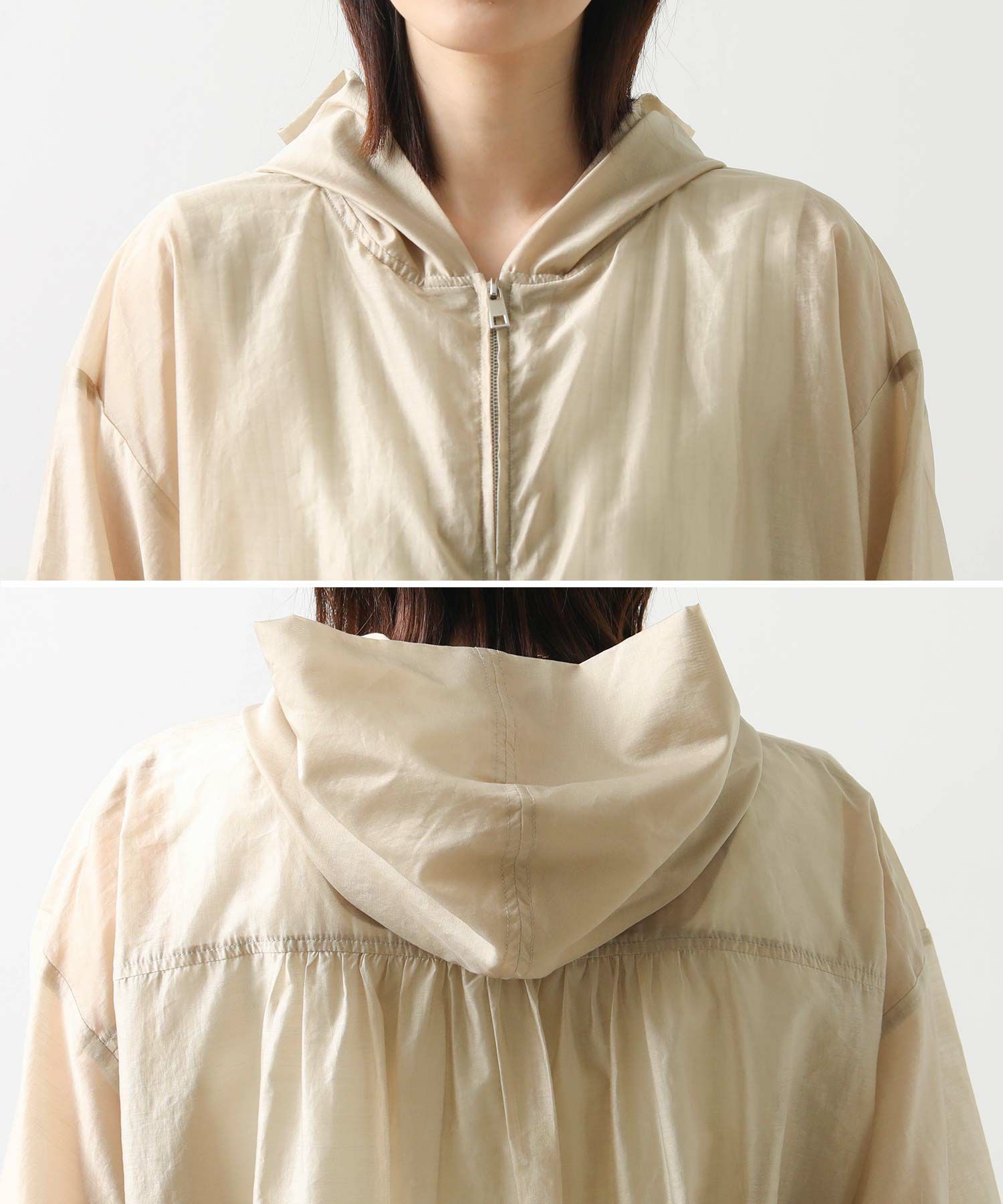 カジュアルなイメージのパーカーですが、上品な透け感の素材でキレイめコーデにも合わせやすい1枚。