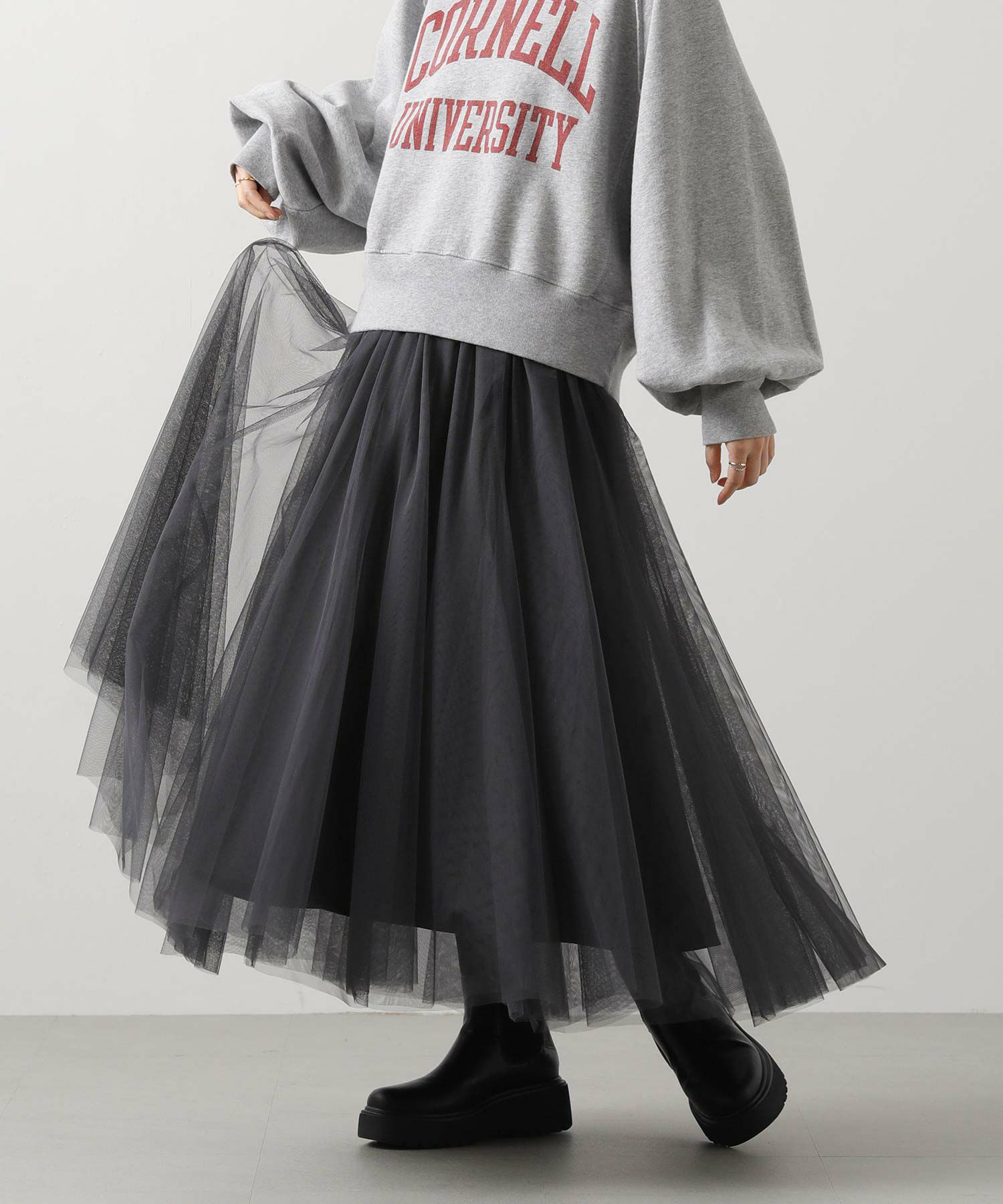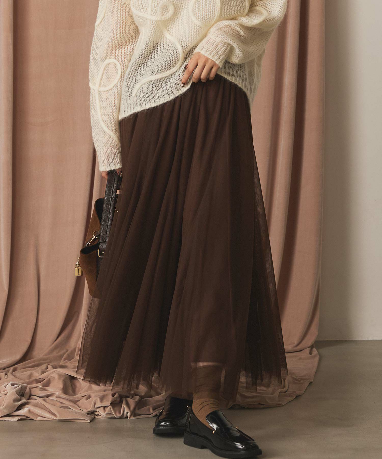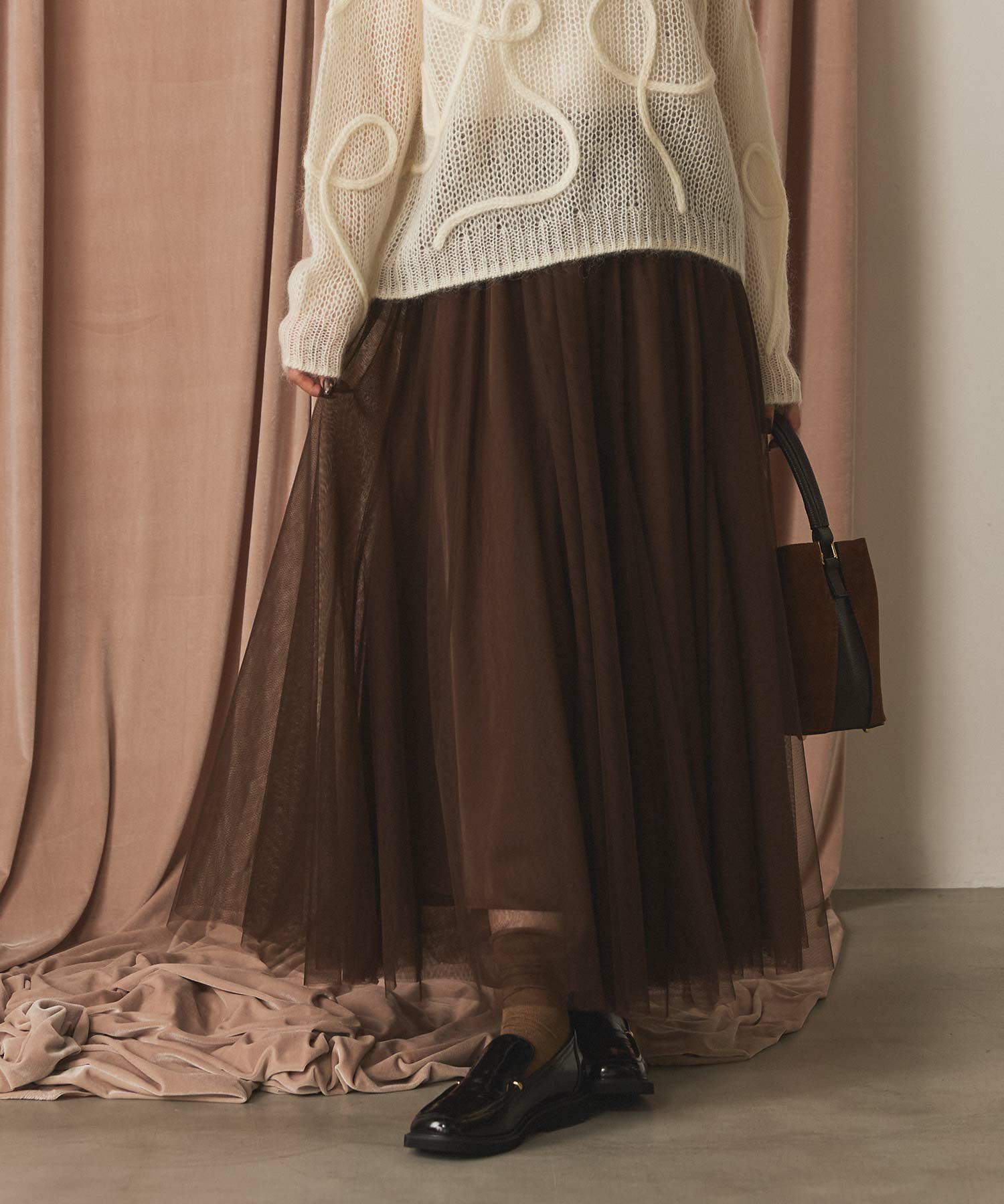 ふうわりと程よく広がるチュール素材を使用したボリュームのあるスカート。