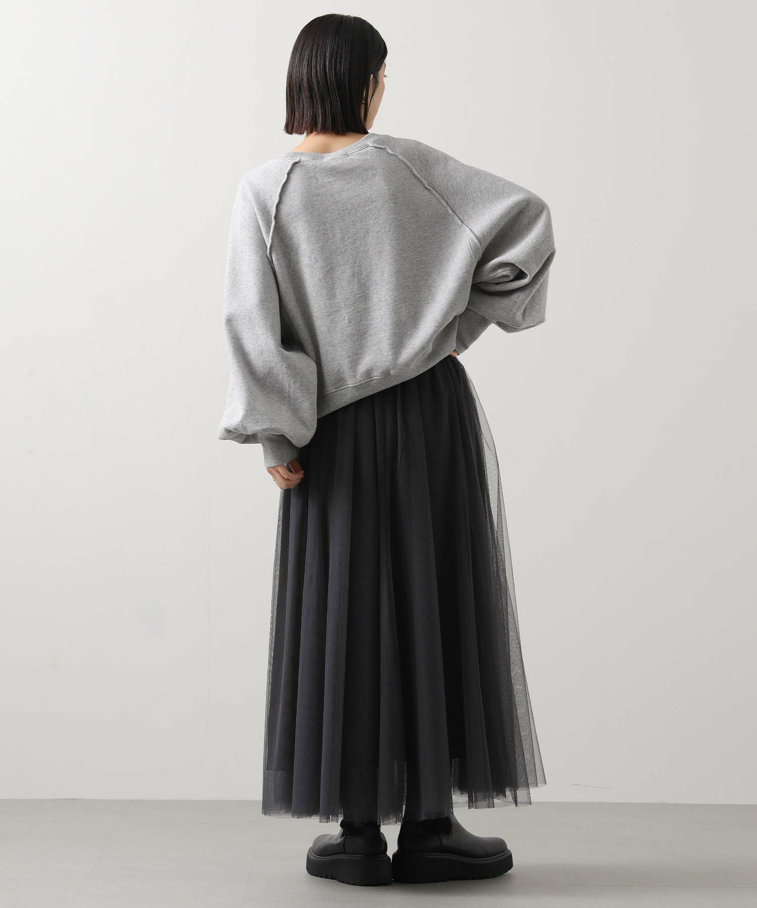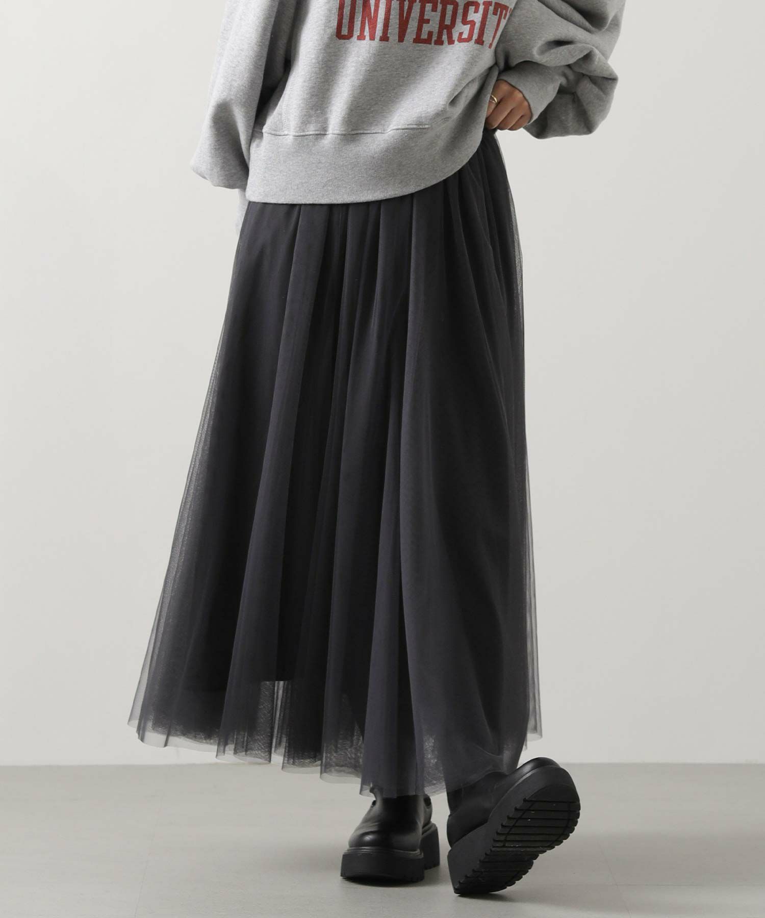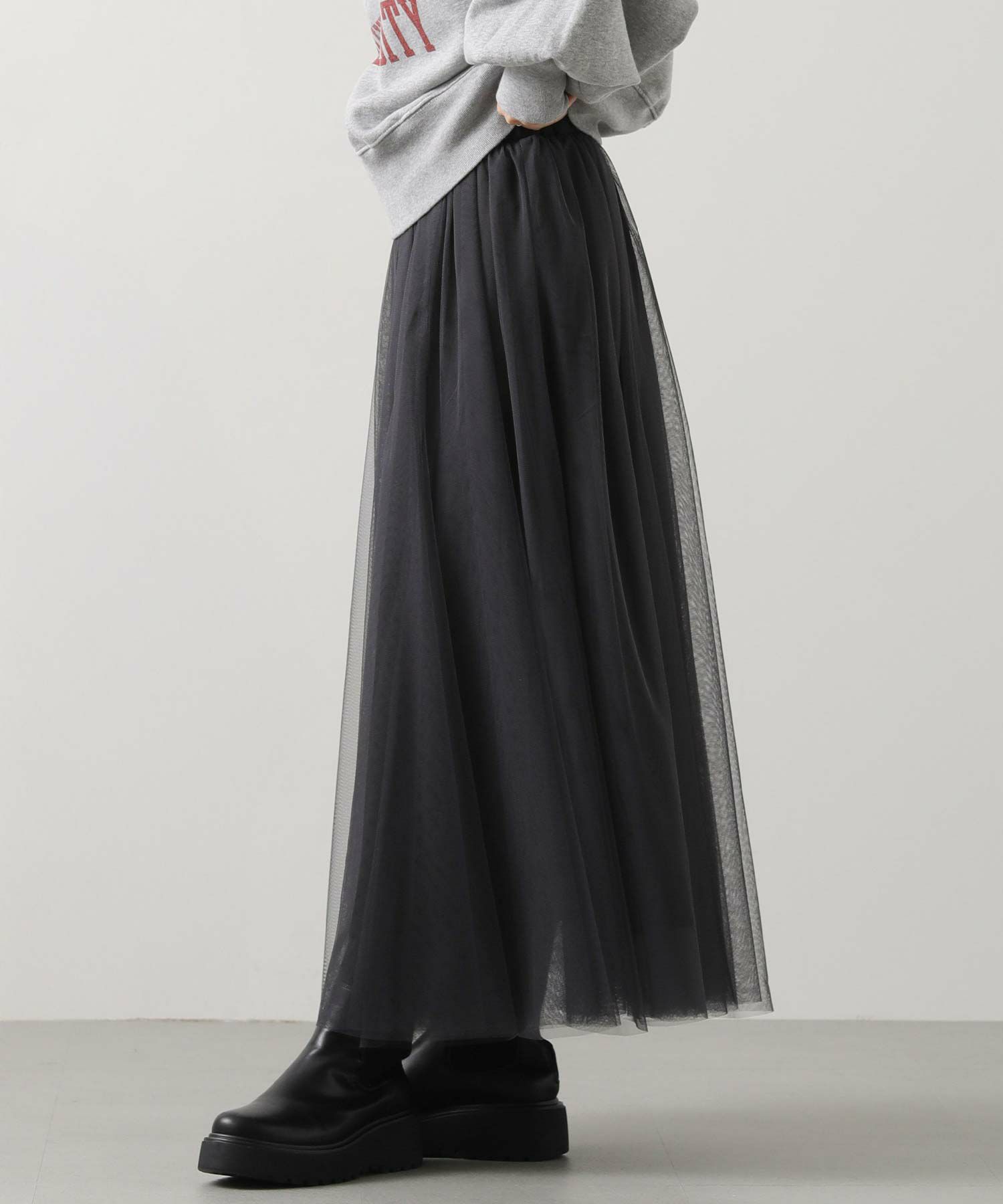 ふうわりと程よく広がるチュール素材を使用したボリュームのあるスカート。