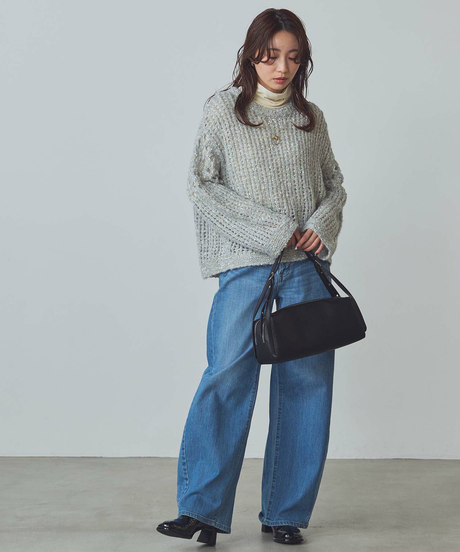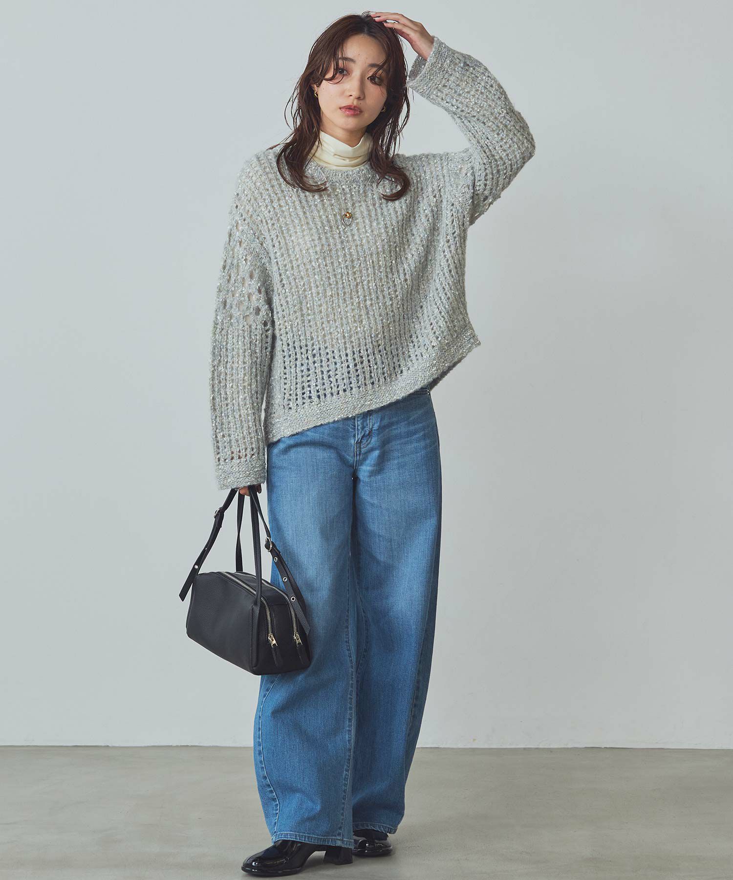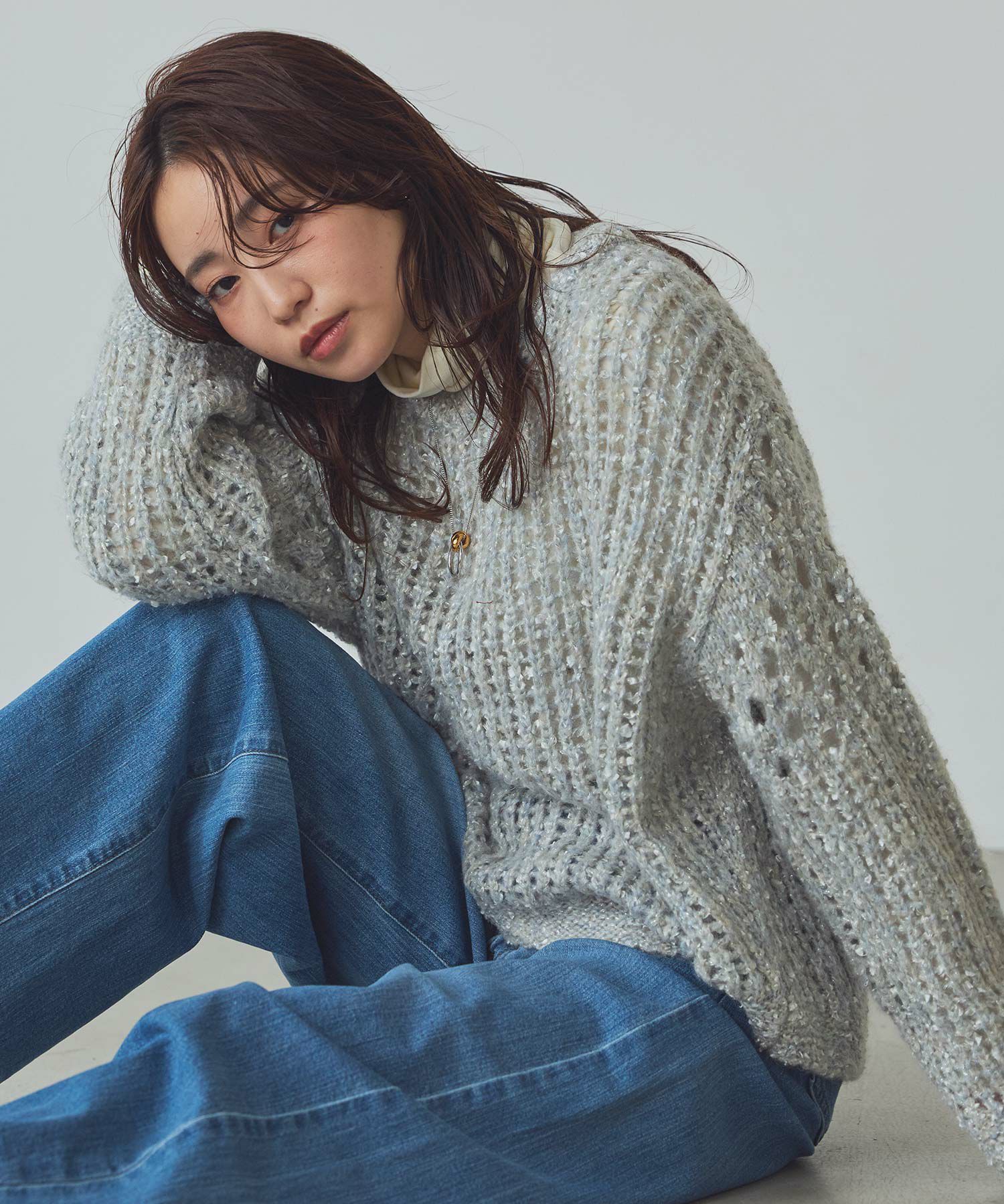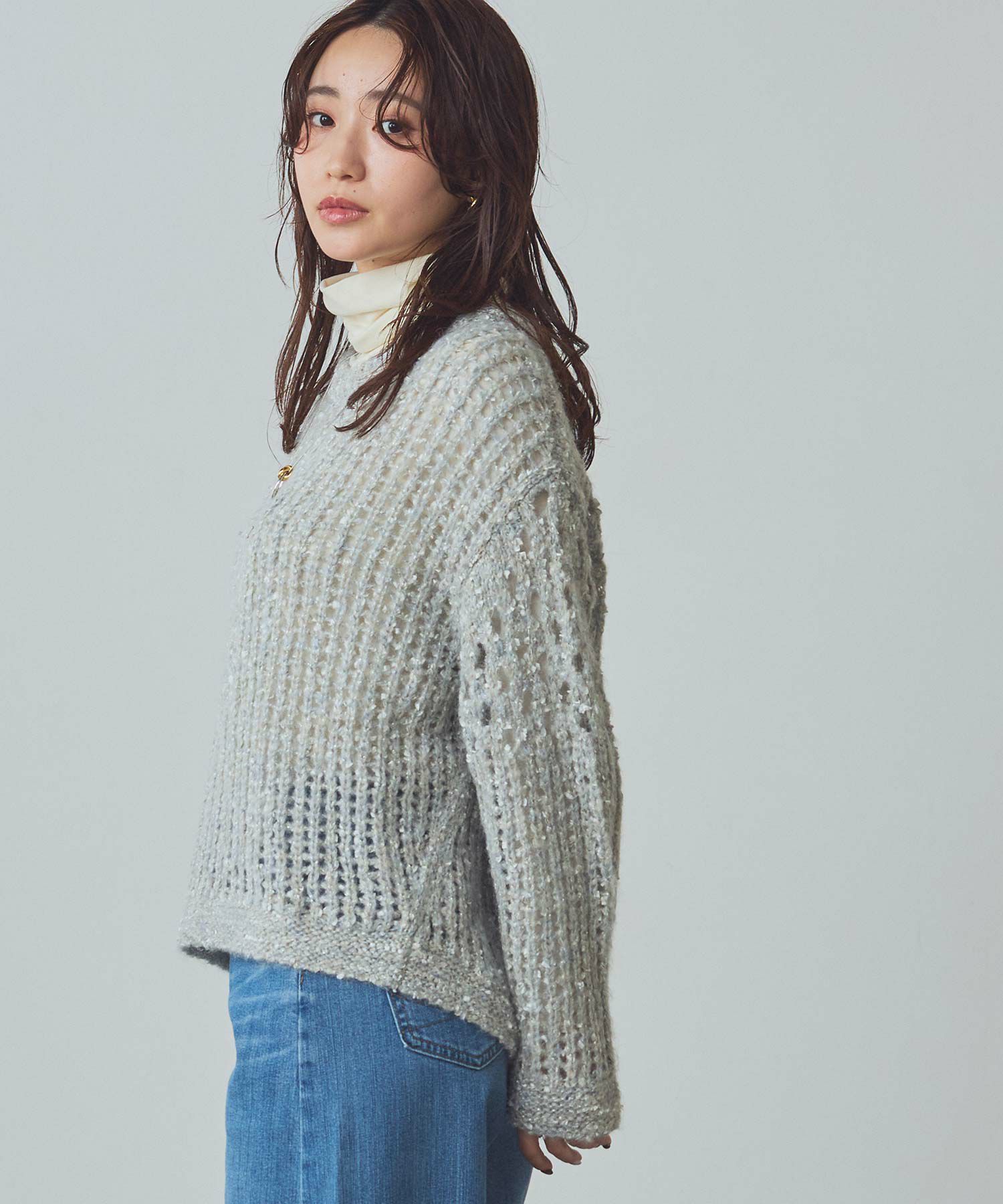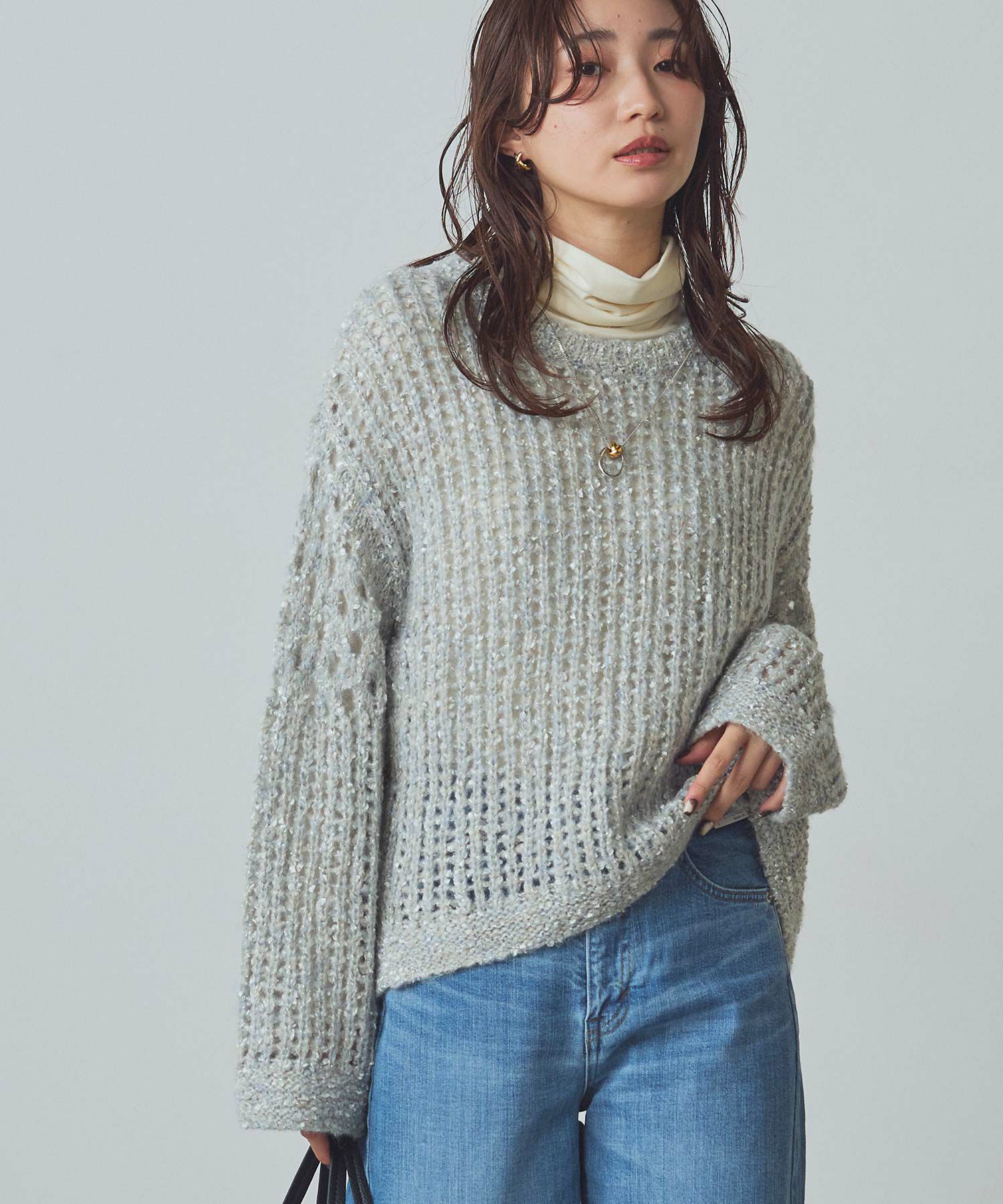 透け感のある編地が重くなりがちな秋冬コーデに抜け感を演出してくれます。