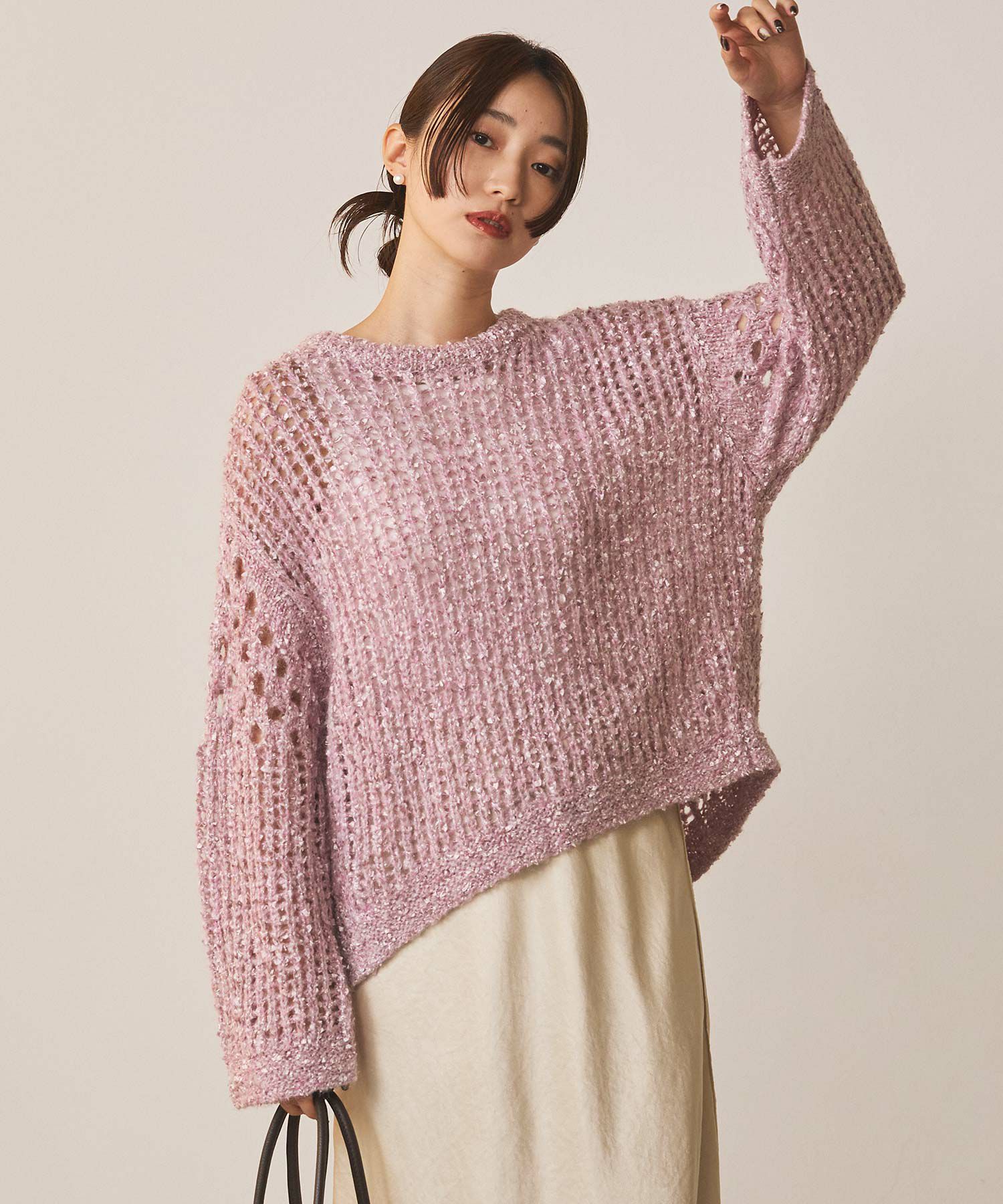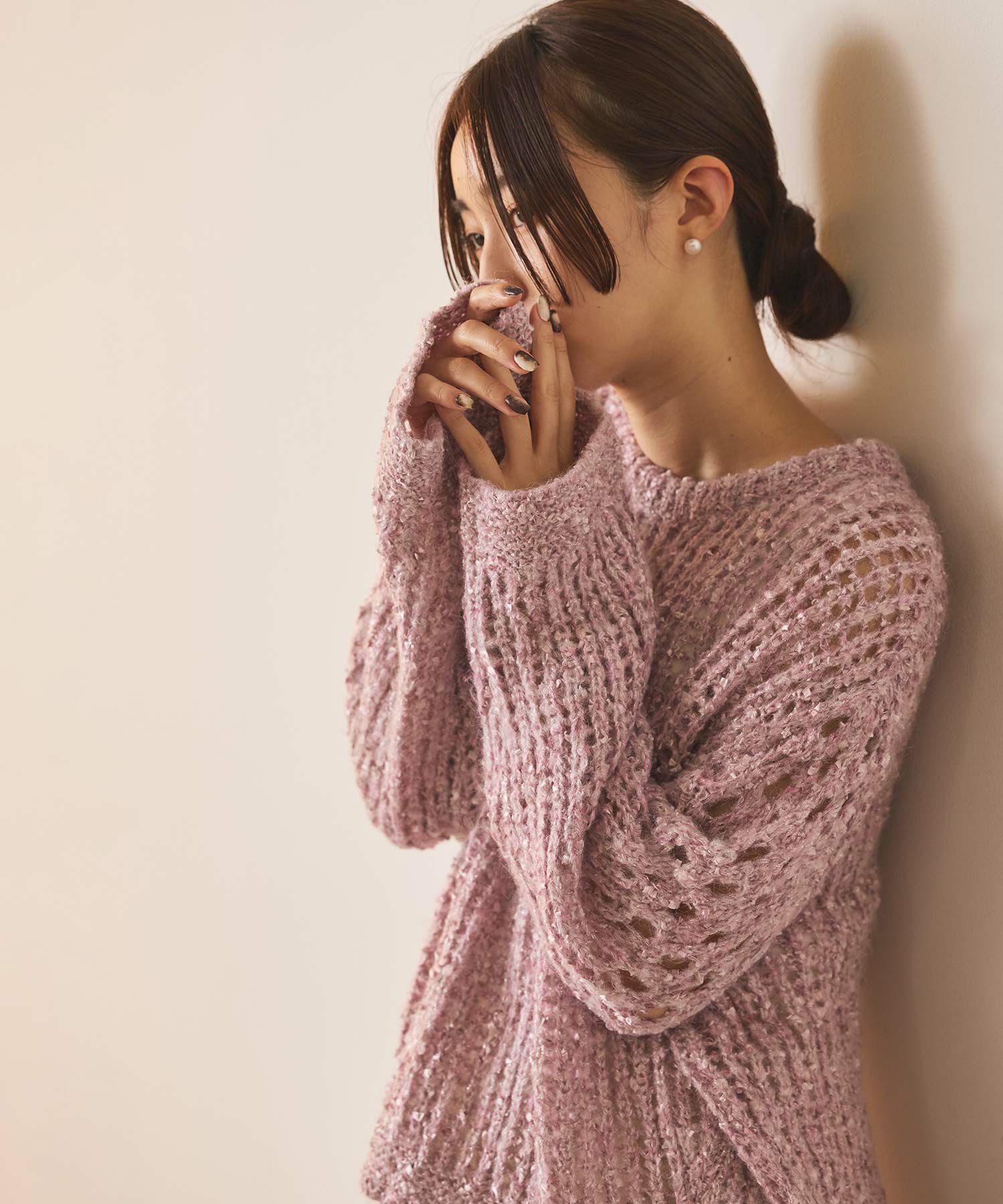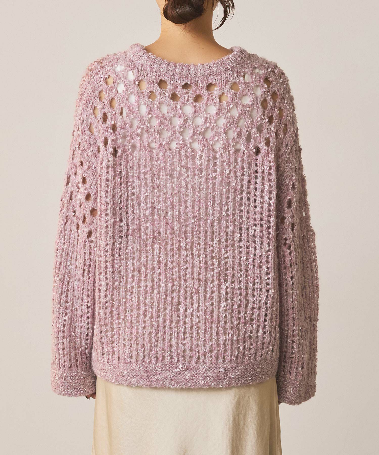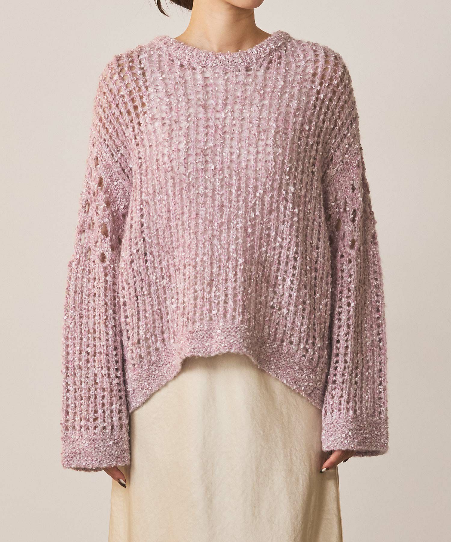 表情豊かなフラッグヤーンとふんわりしたモヘヤに上品に光るラメが目をひくニットプルオーバー。