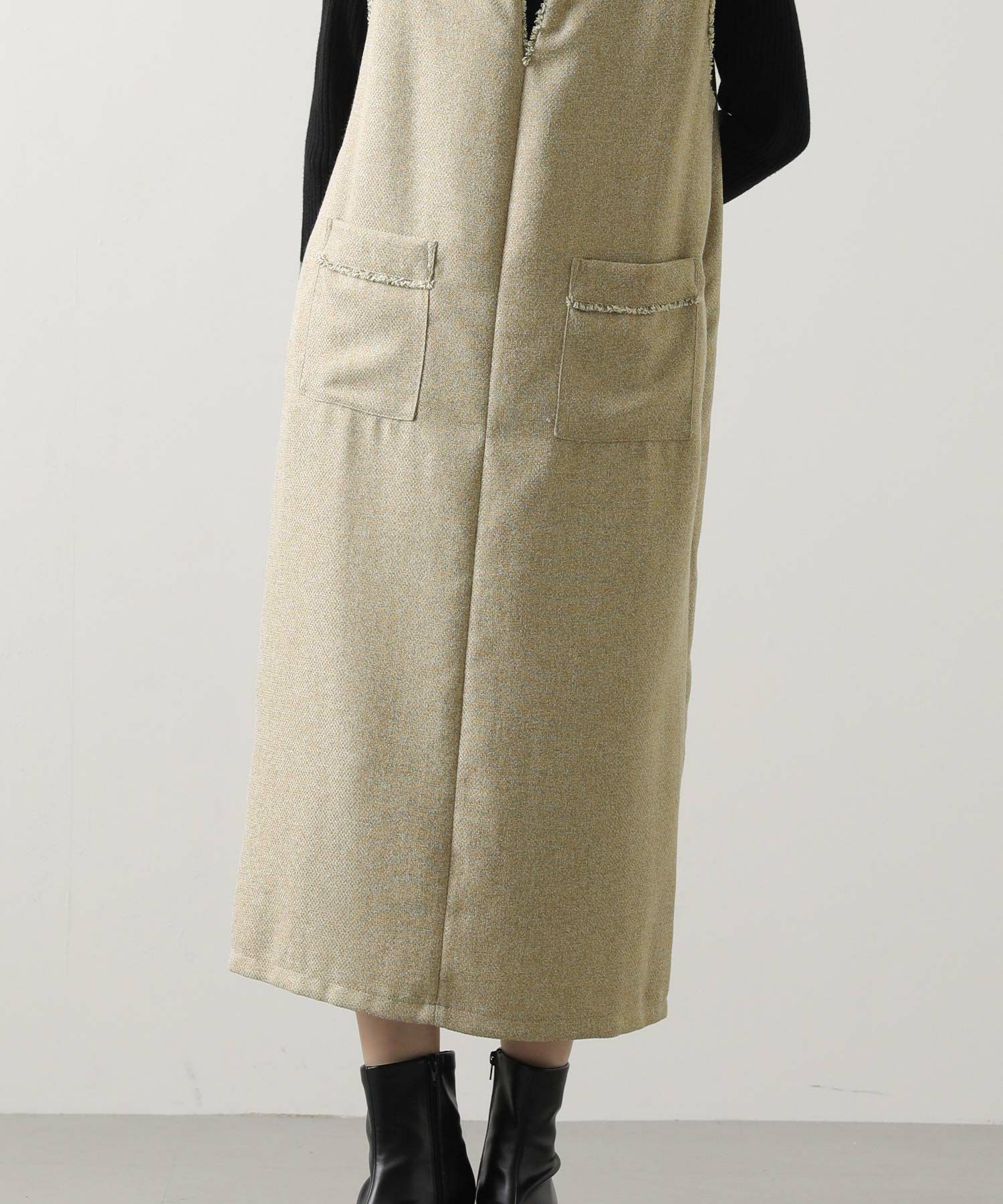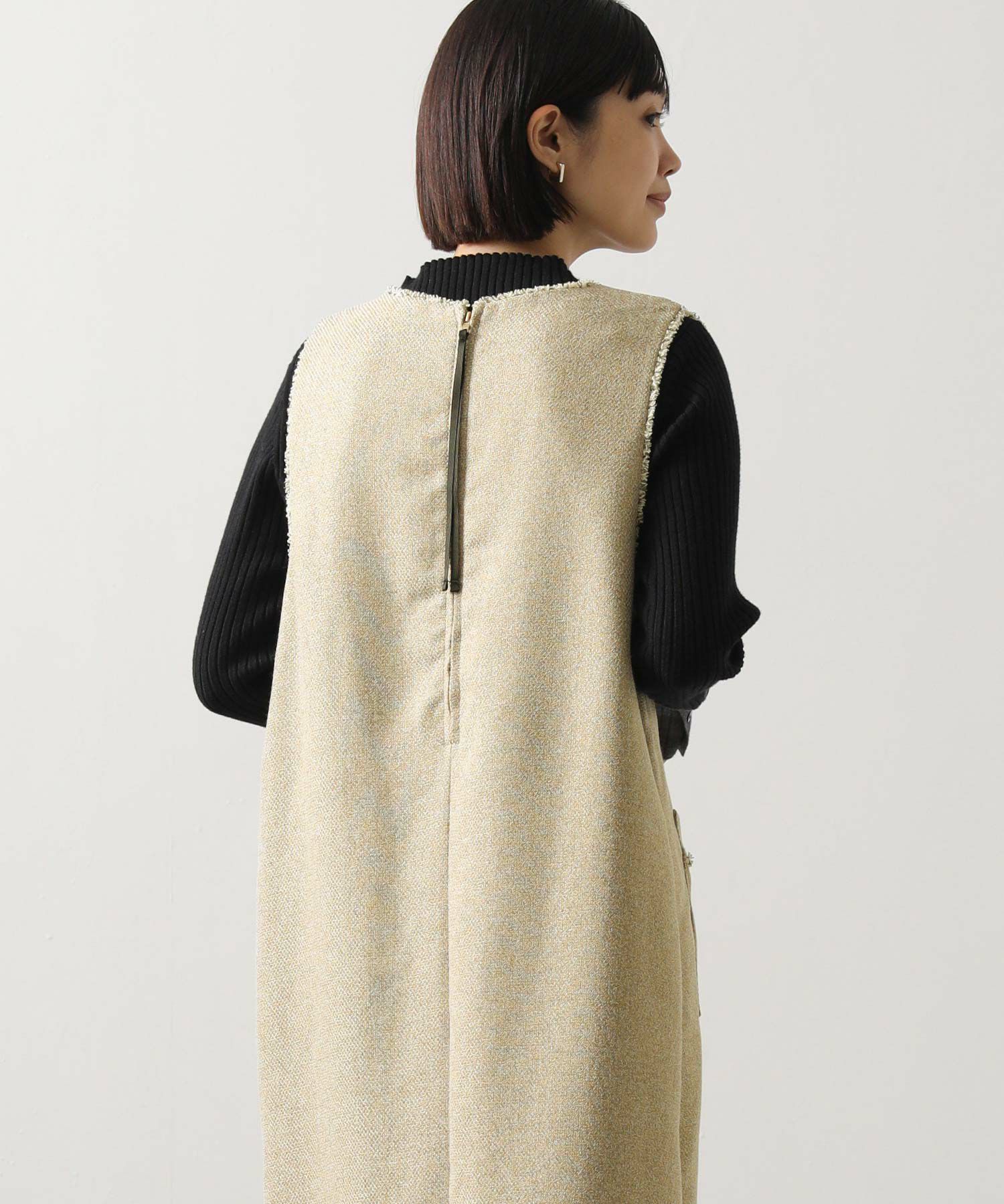 衿元とポケット口を彩る華やかなフリンジが目を惹く、ツィード調のジャンスカ。