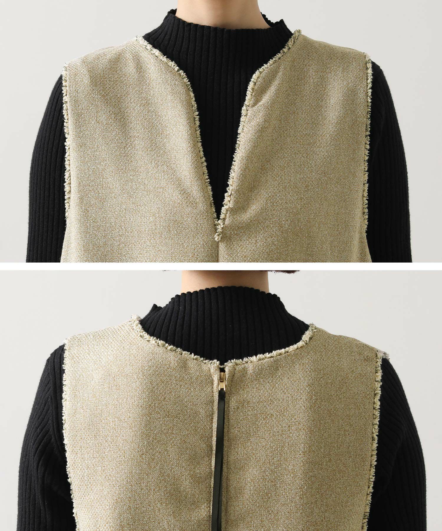ブラウスやニットなどとレイヤードしやすい大きめアームホールにしています。