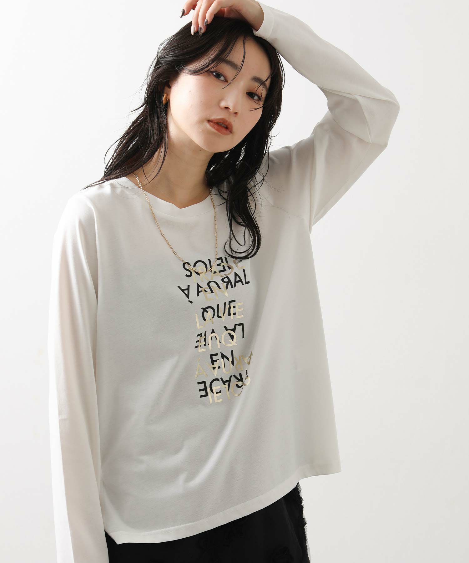 とても柔らかく心地よい生地感で、1枚でも美しく着こなせるのが魅力。プリントに箔を重ねた繊細なグラフィックは、さりげなく華やかさを添えシンプルな中に上質感をプラス。